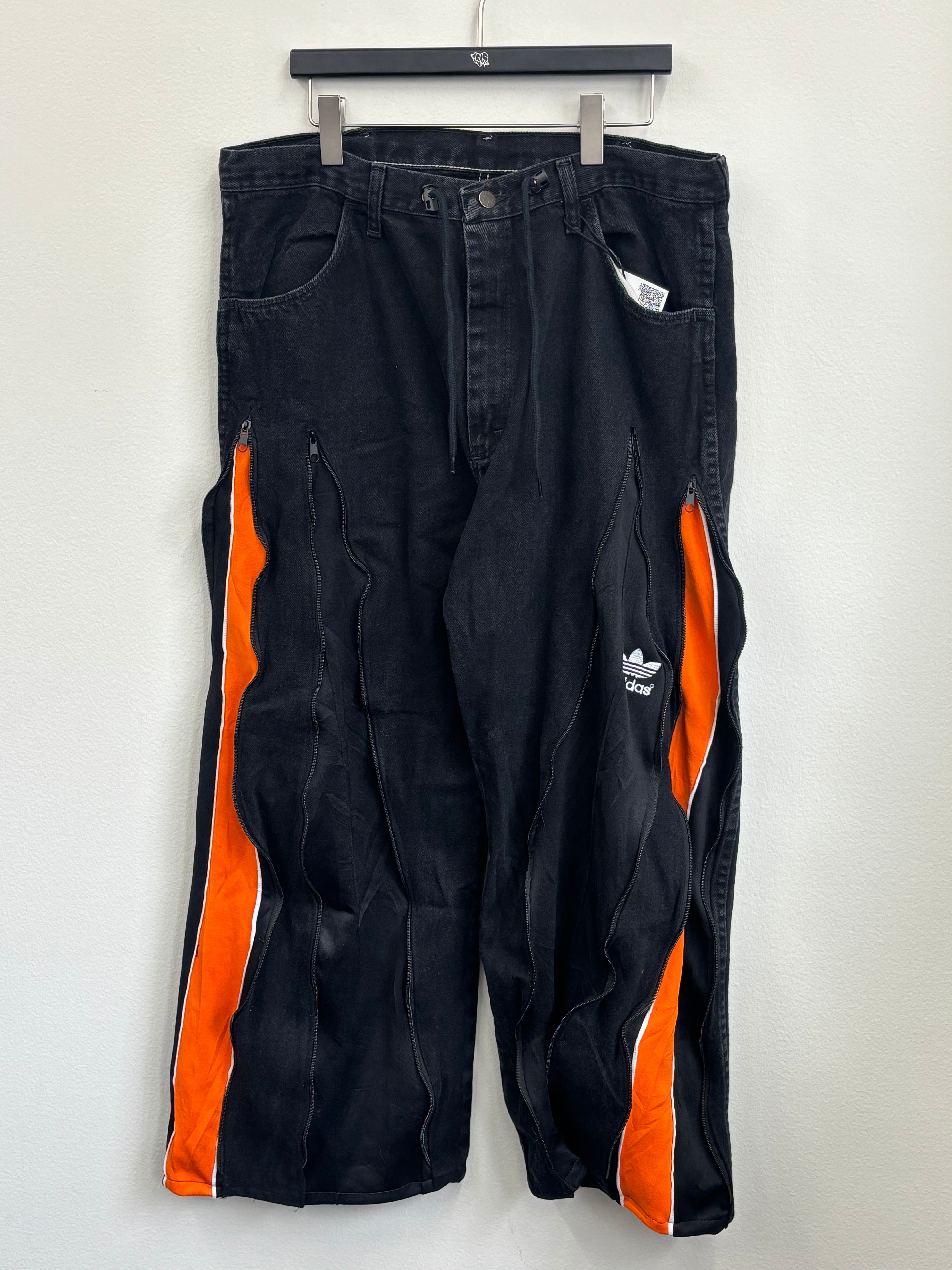 古着のデニムとジャージでリメイクされた1点もののパンツ。