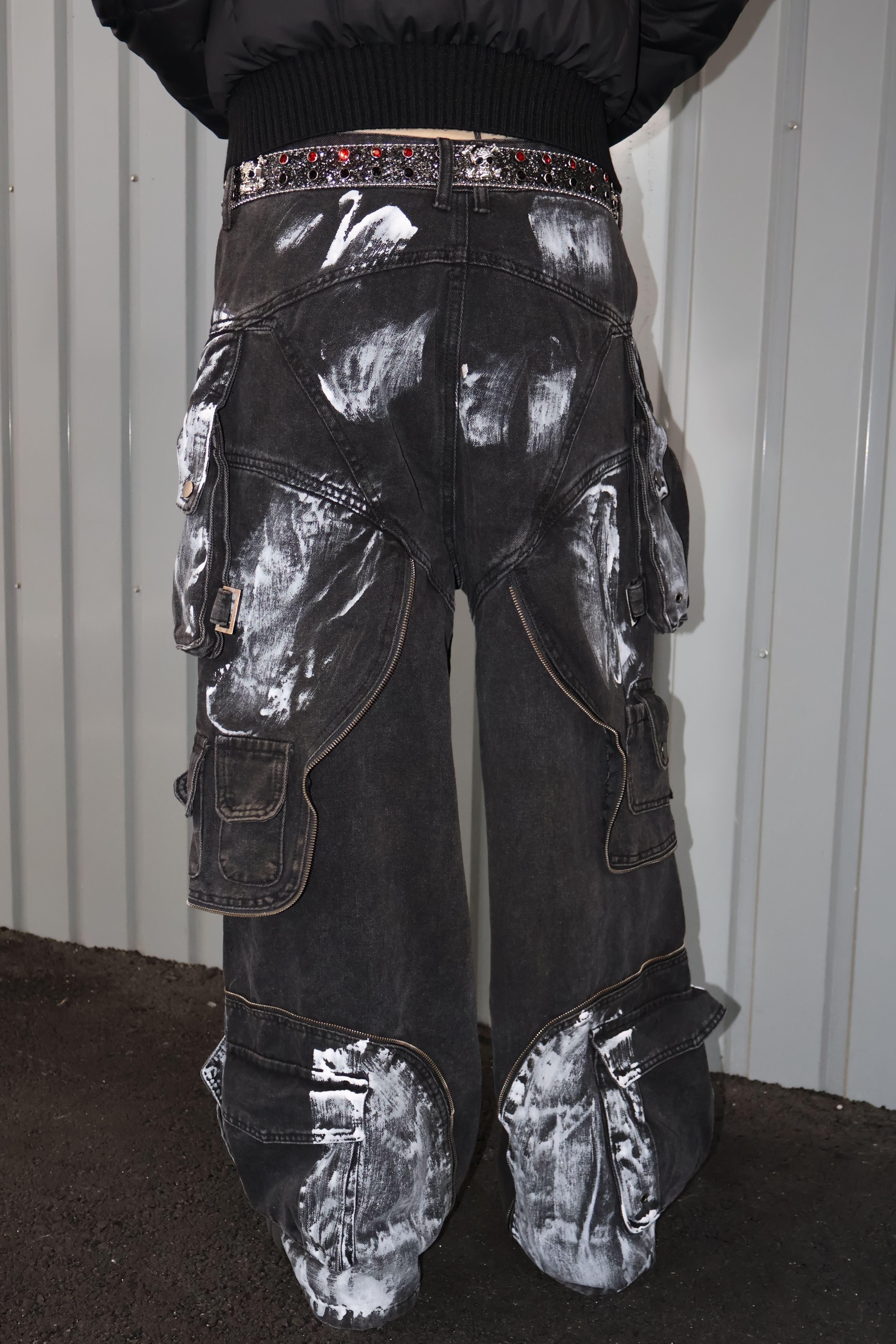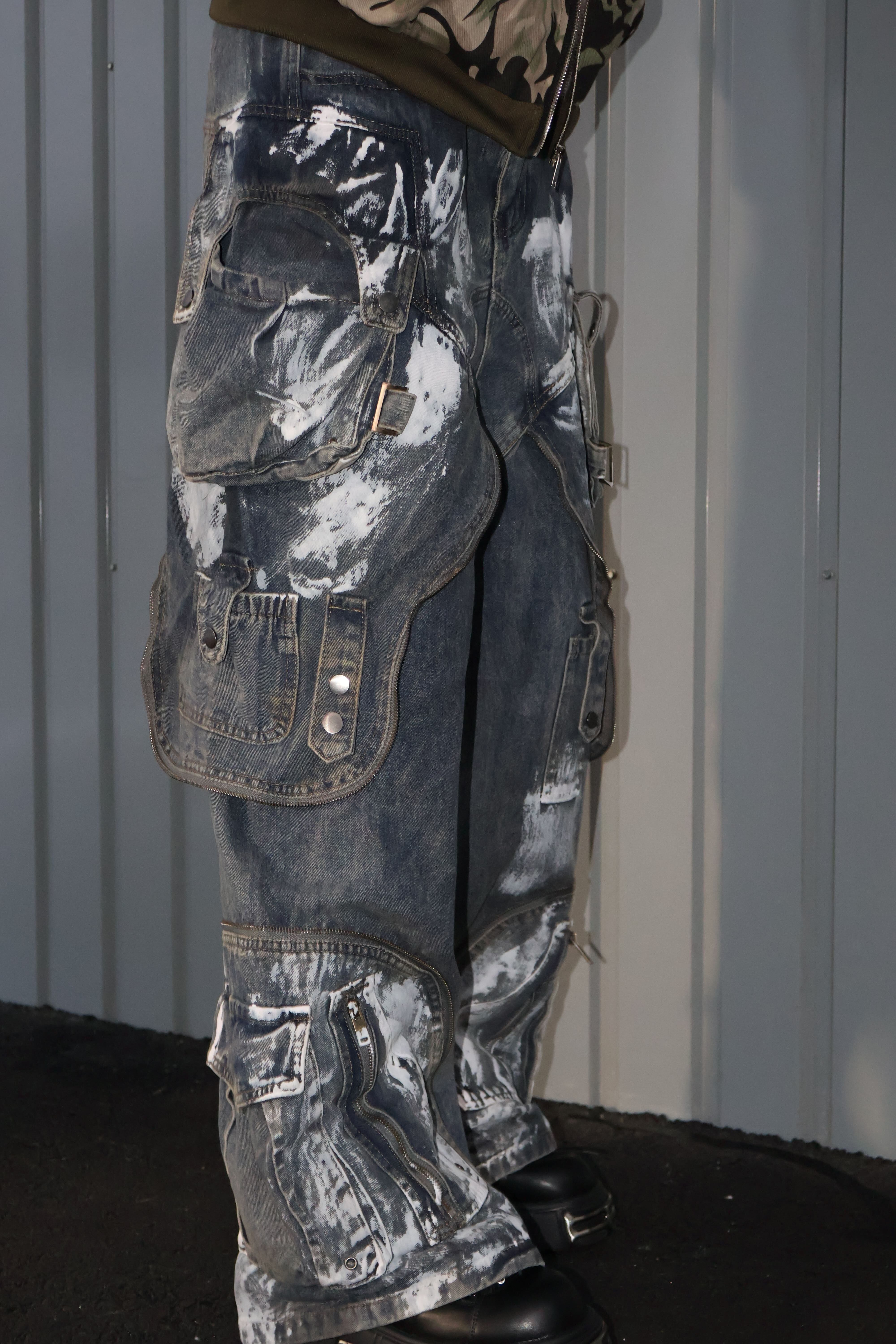 大胆なペイント加工と立体ポケットの組み合わせで、360度どこから見ても存在感のあるカーゴデニム。