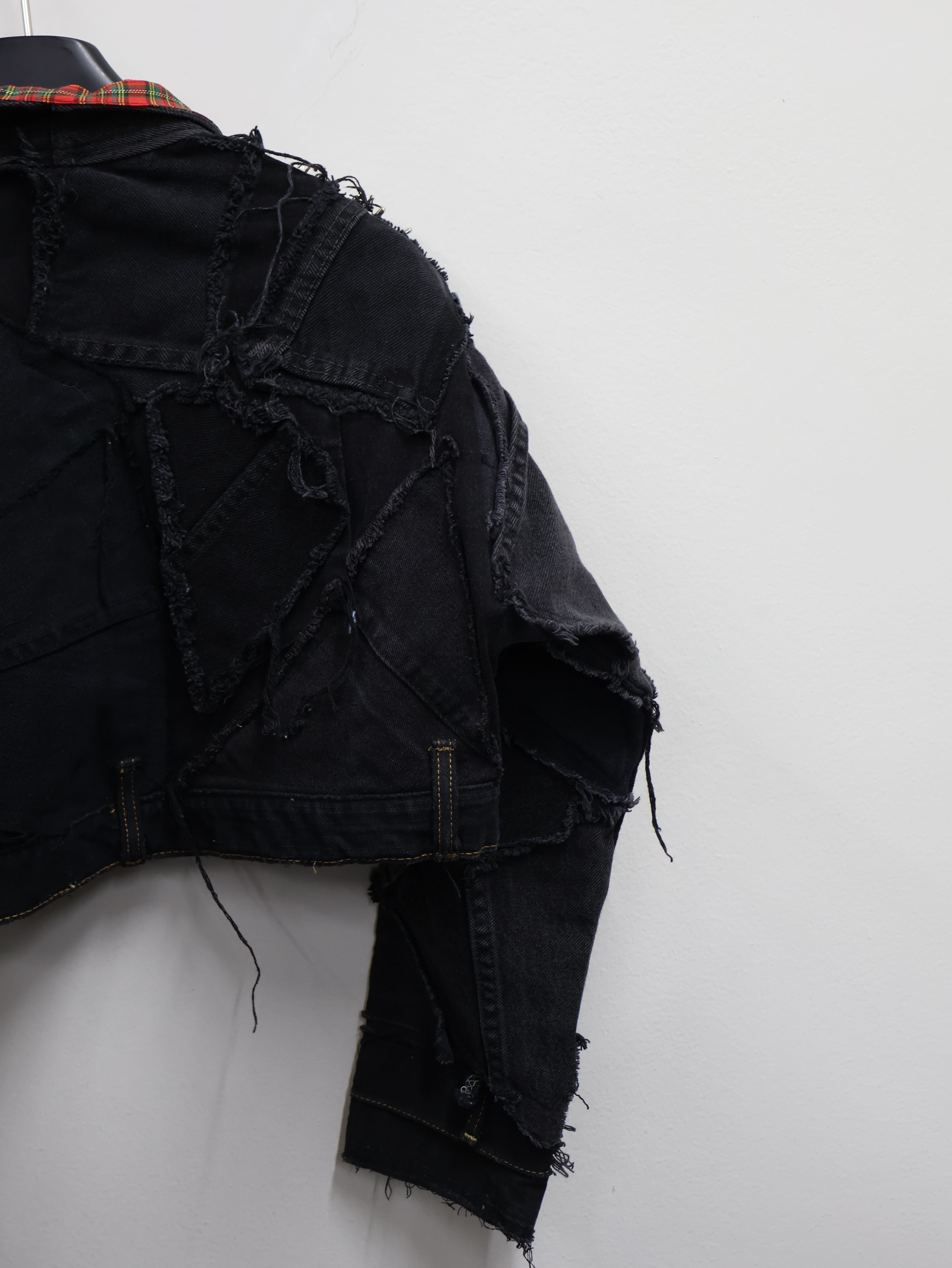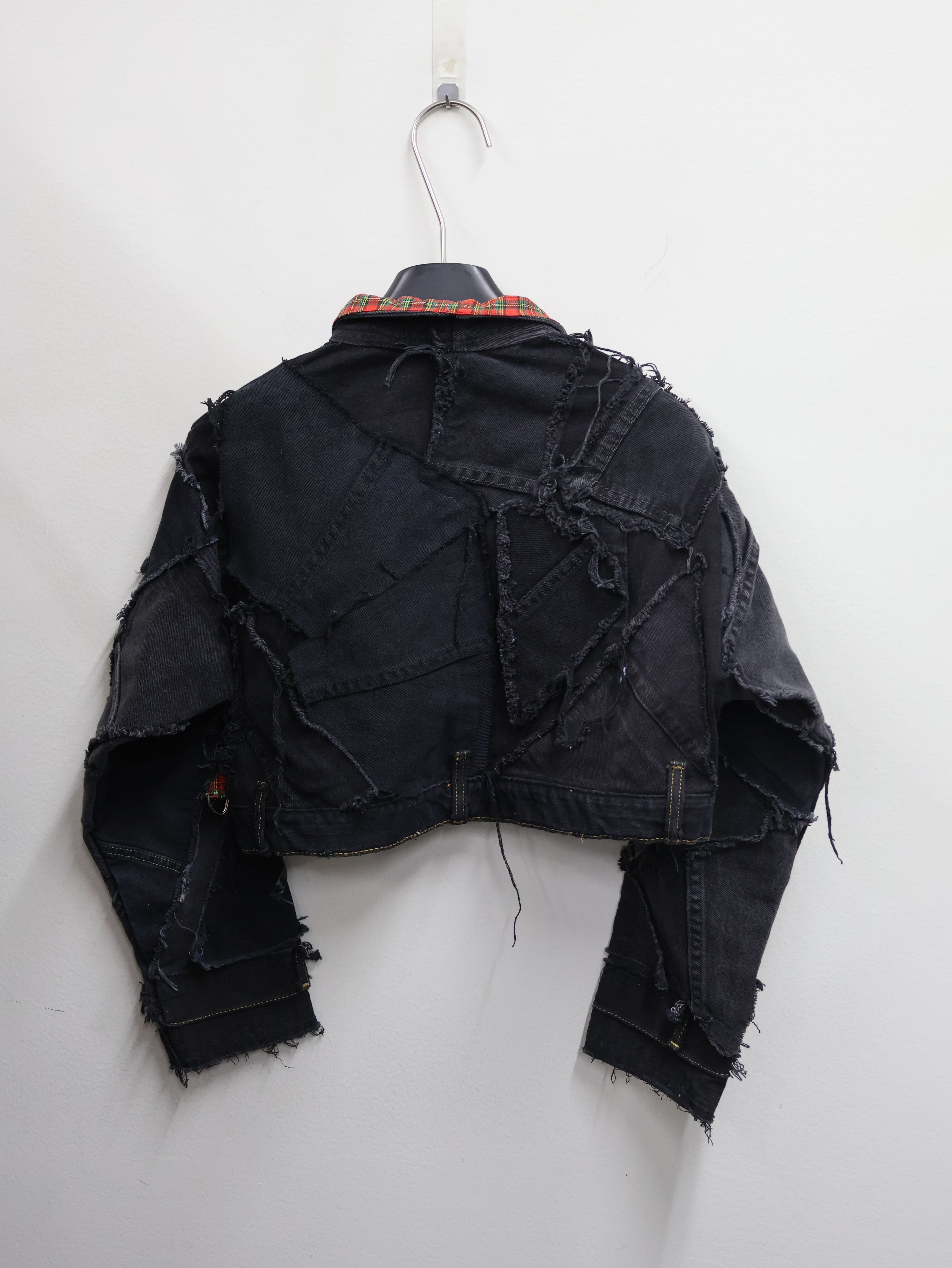 ブラックベースに赤のアクセントを効かせた、リメイク感強めのショート丈ジャケット。