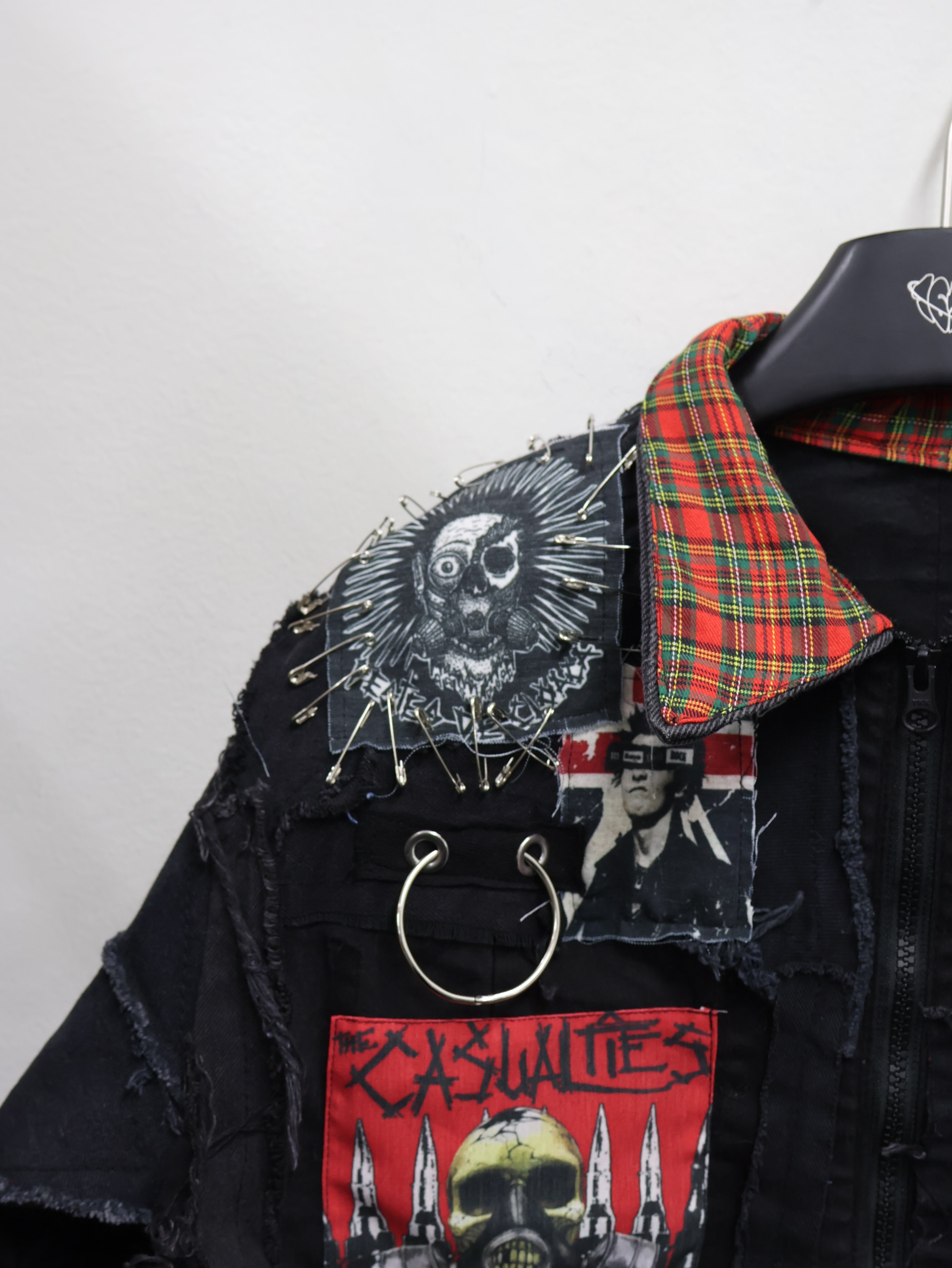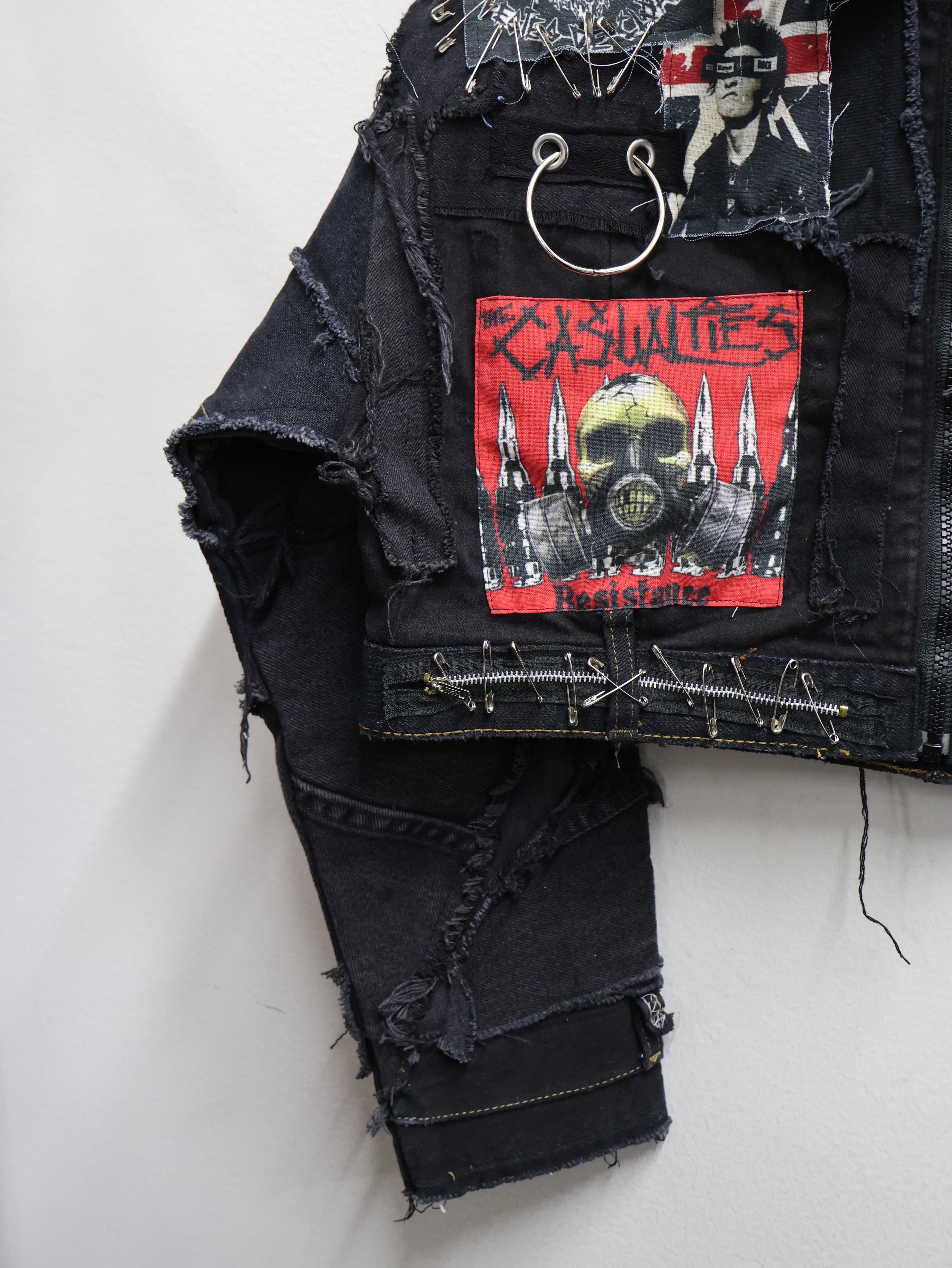 パッチ、チェーン、ピン、ダメージ加工を重ねたデザインで、羽織るだけで即Y2K×海外ガールな雰囲気が完成。