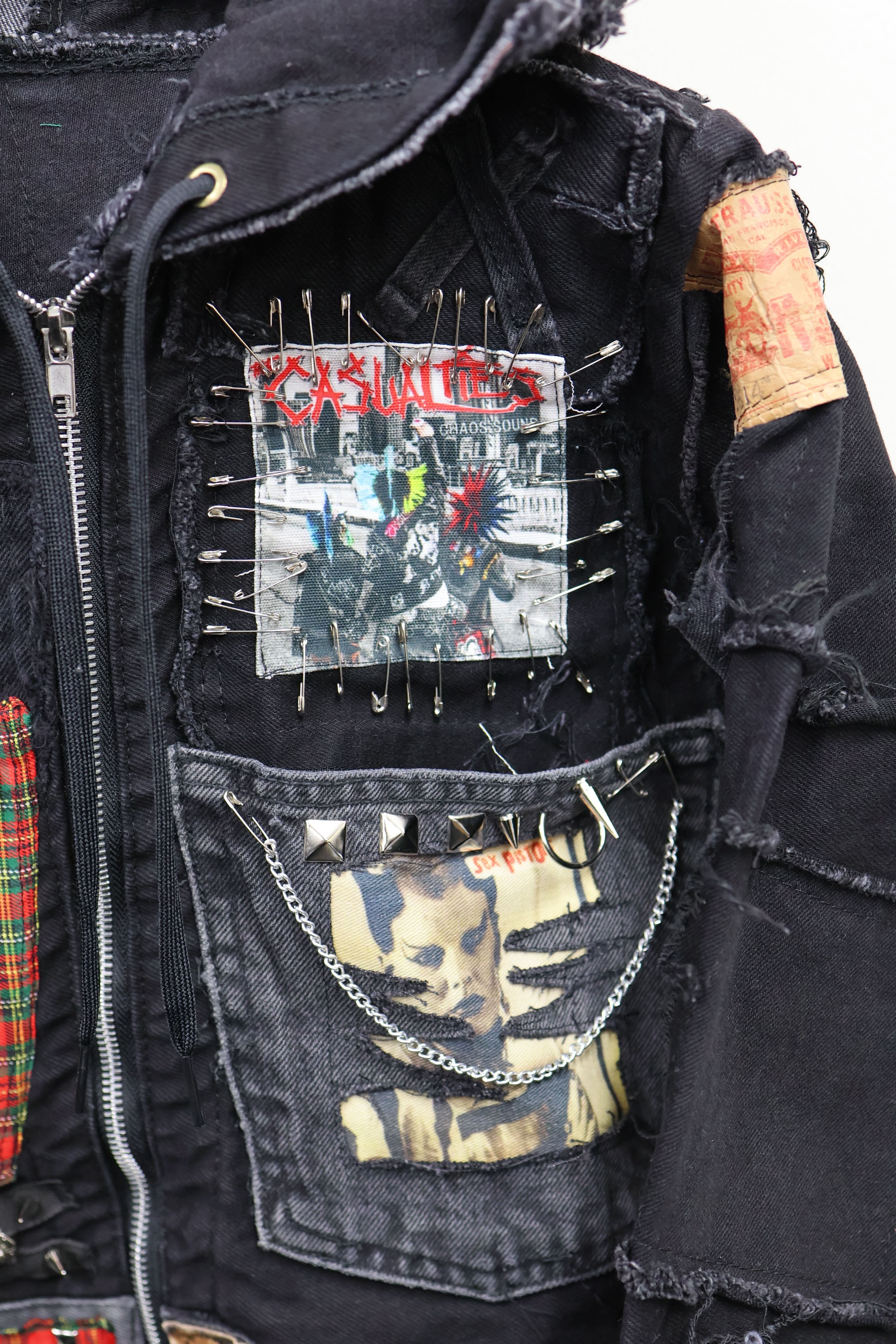 ブラックデニムをベースに、パッチ・チェーン・安全ピンを重ねた一点物リメイクZIPフーディー。