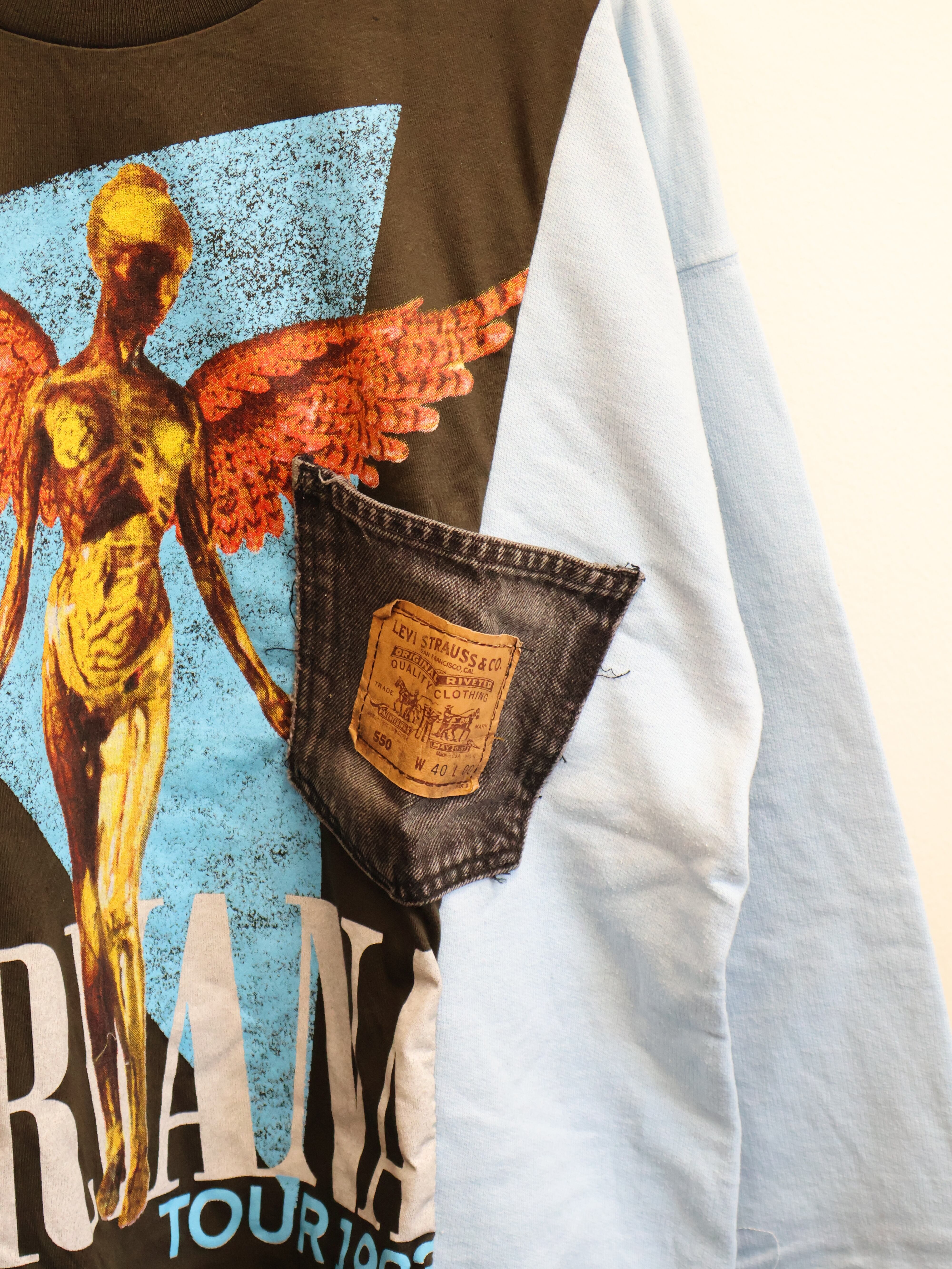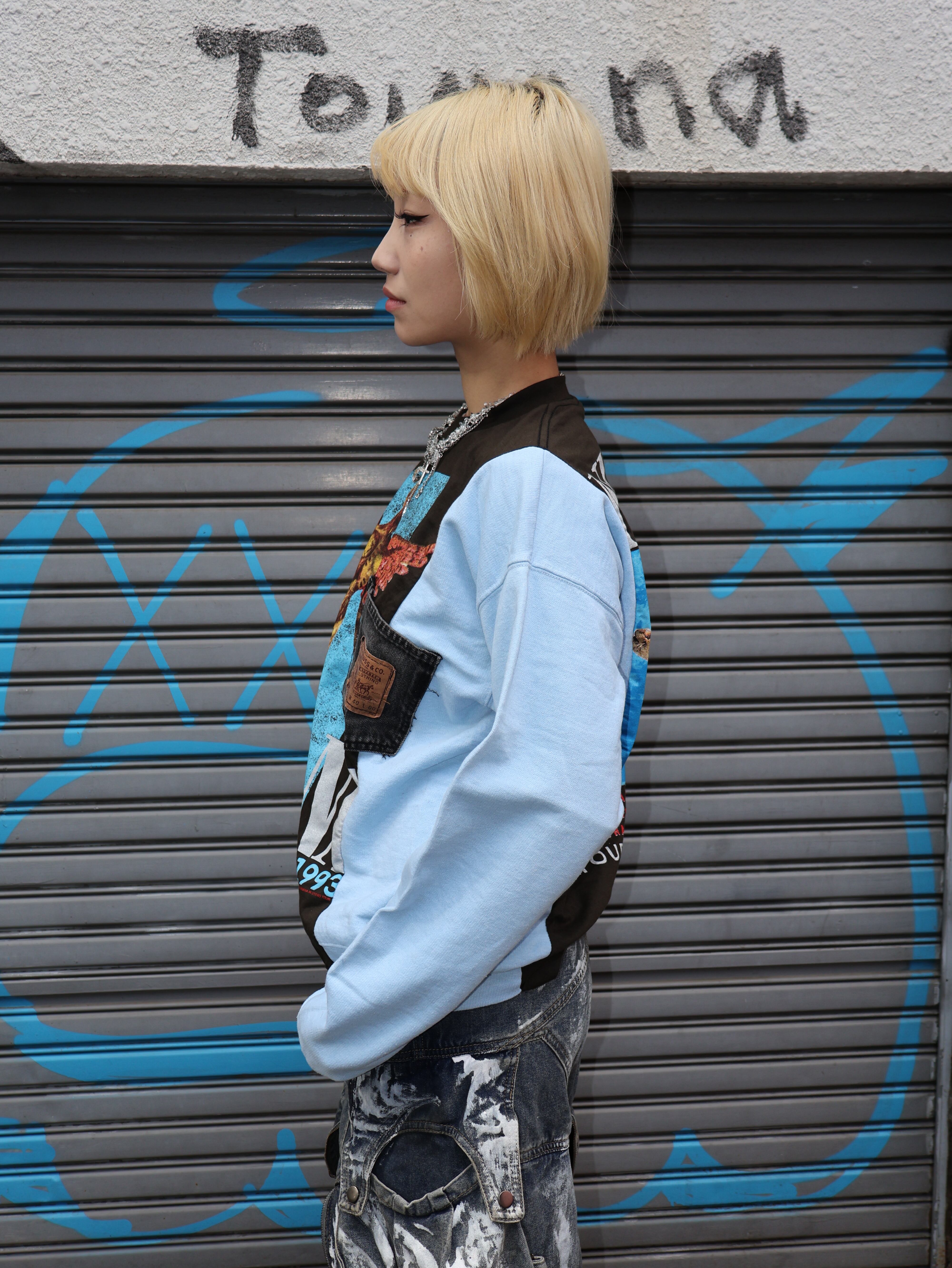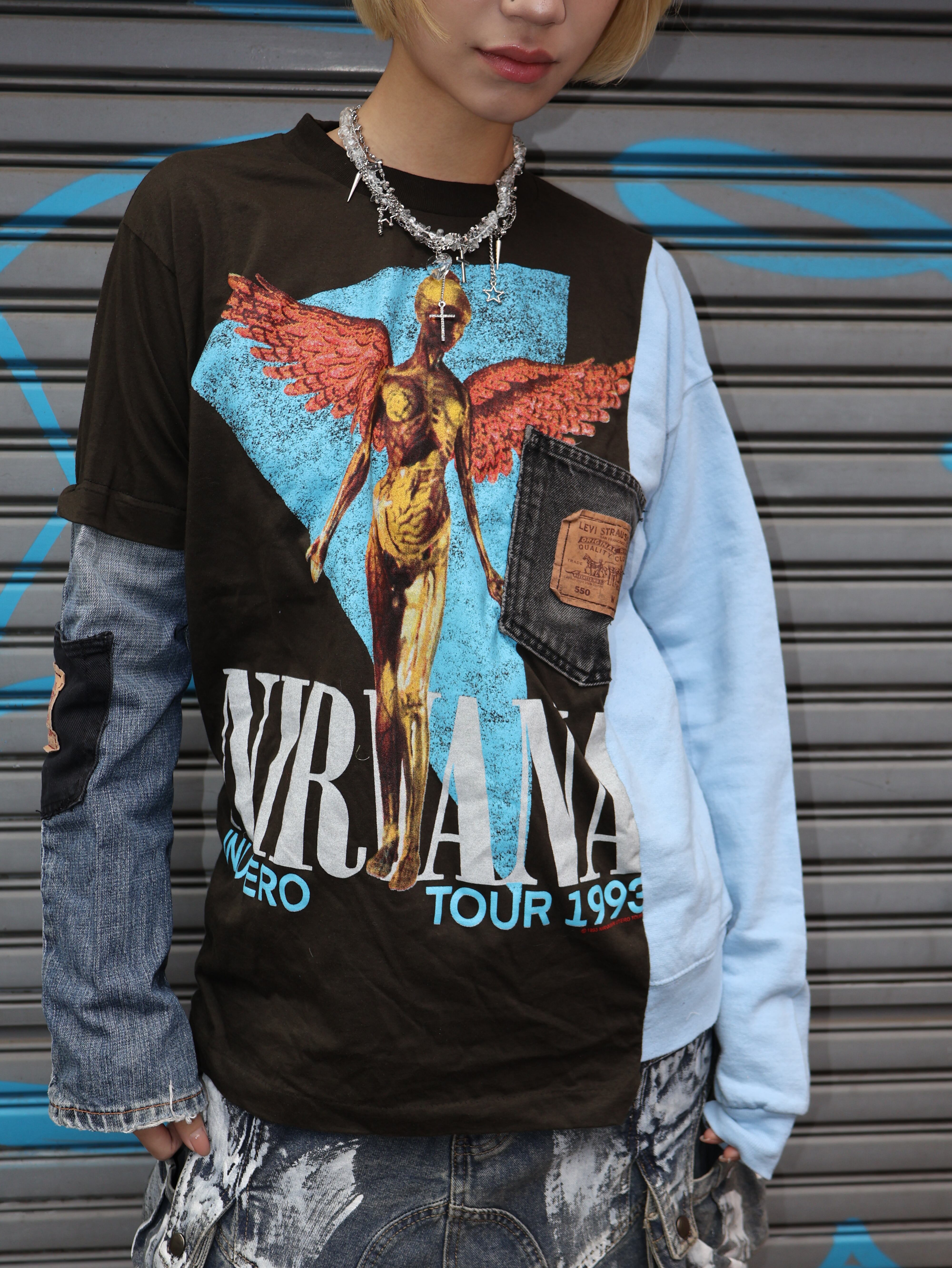バンドTのグラフィックTをベースに、異素材スリーブを大胆にドッキングした一点物リメイクトップス。