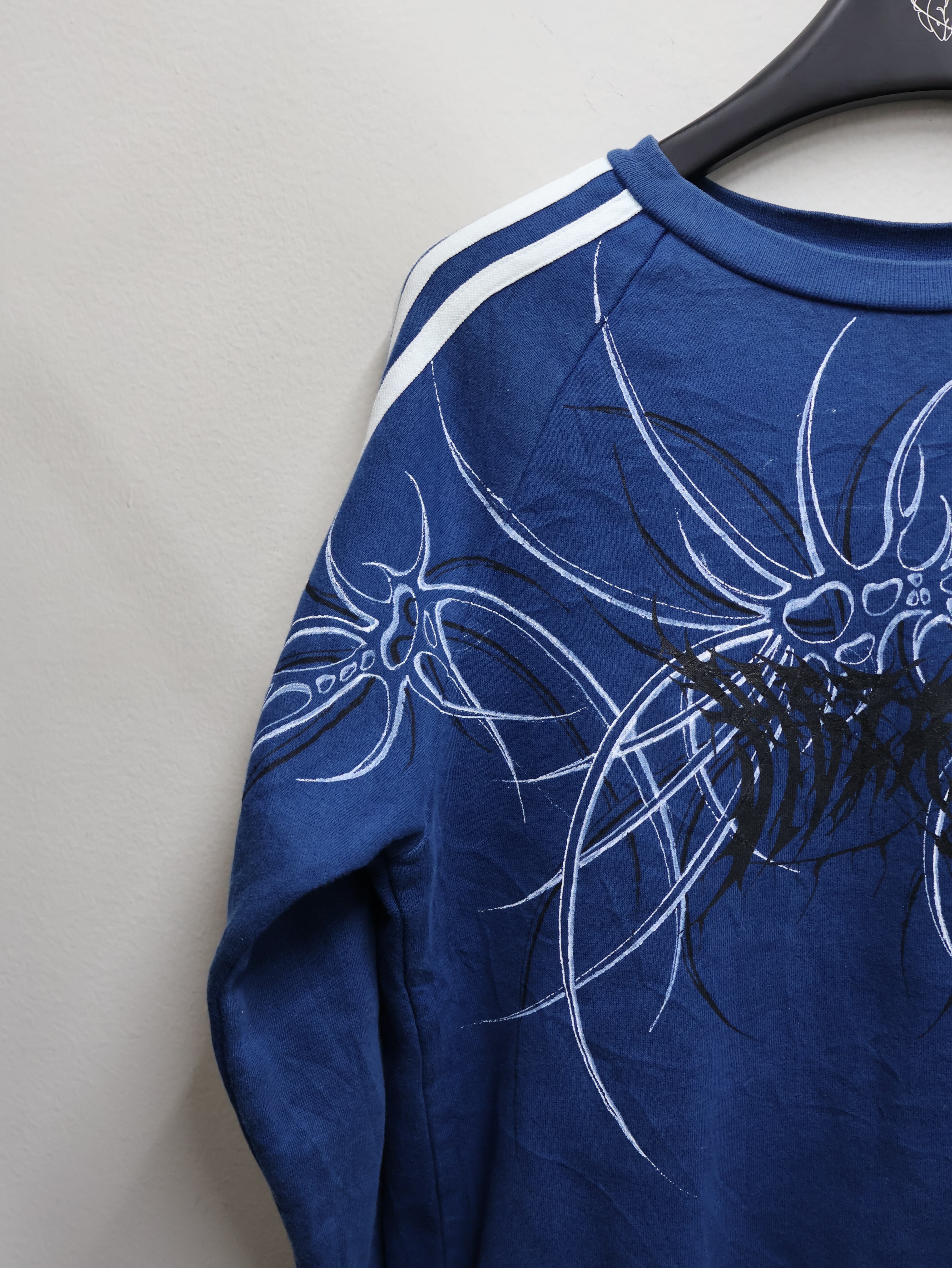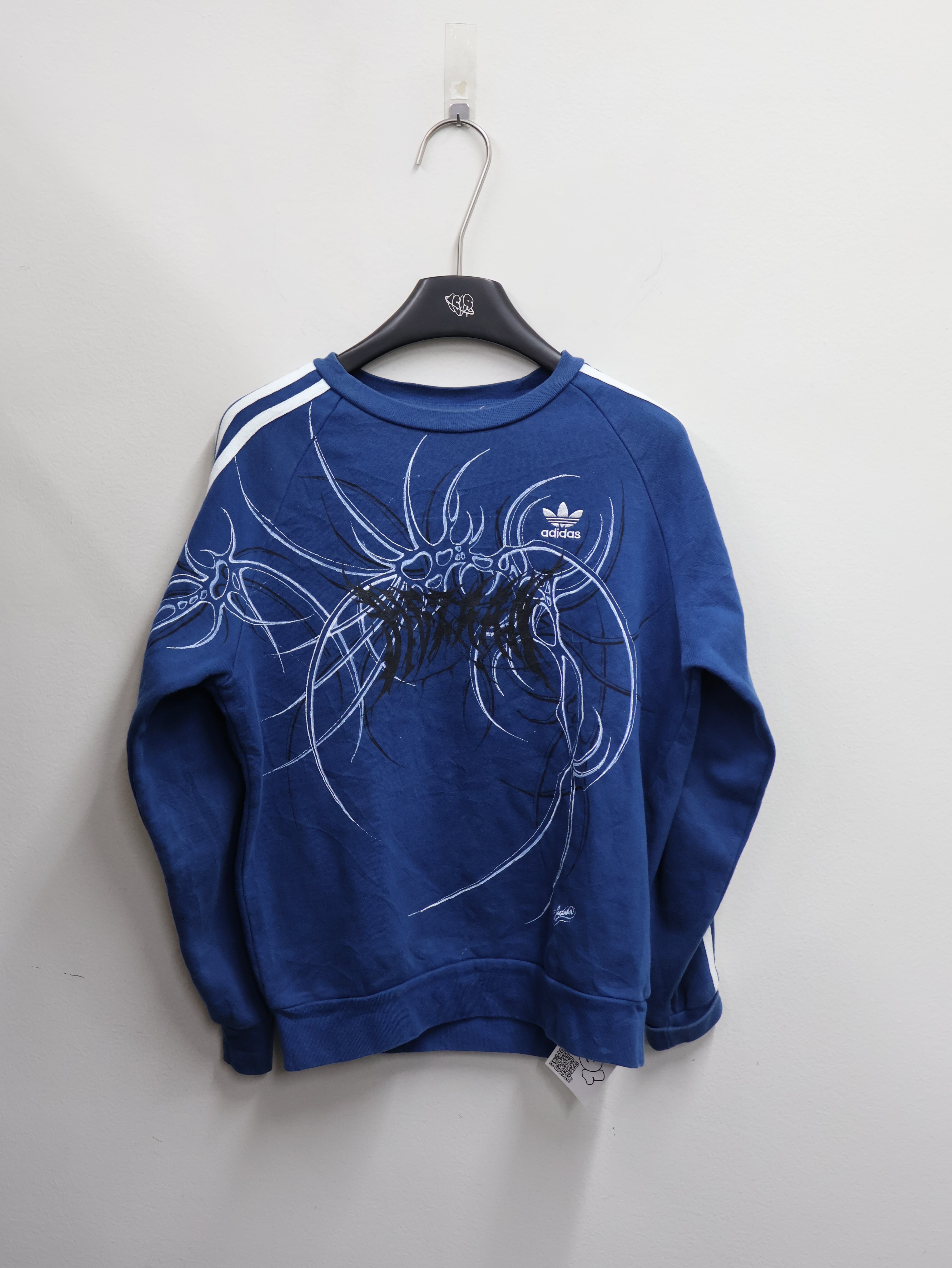 ストリートのクラシックなラインスウェットをベースに、ダークでアート性の高いグラフィックが全面に入った一点。程よく厚みのあるスウェット素材で、体のラインを拾いすぎず、ラフなのに存在感は強め。短すぎない丈感で、ボトムにインしてもアウトでもバランスが取りやすいシルエットです。