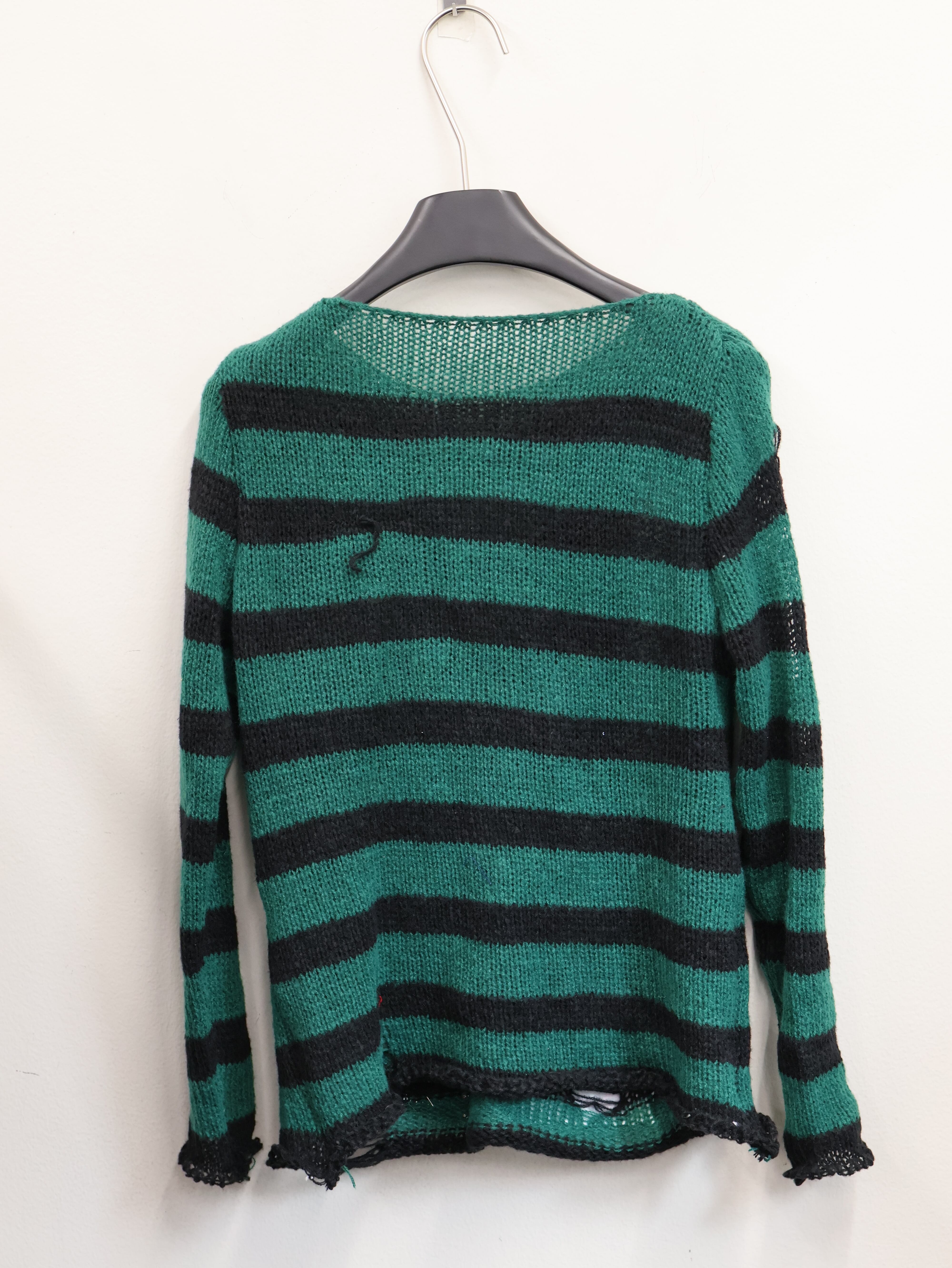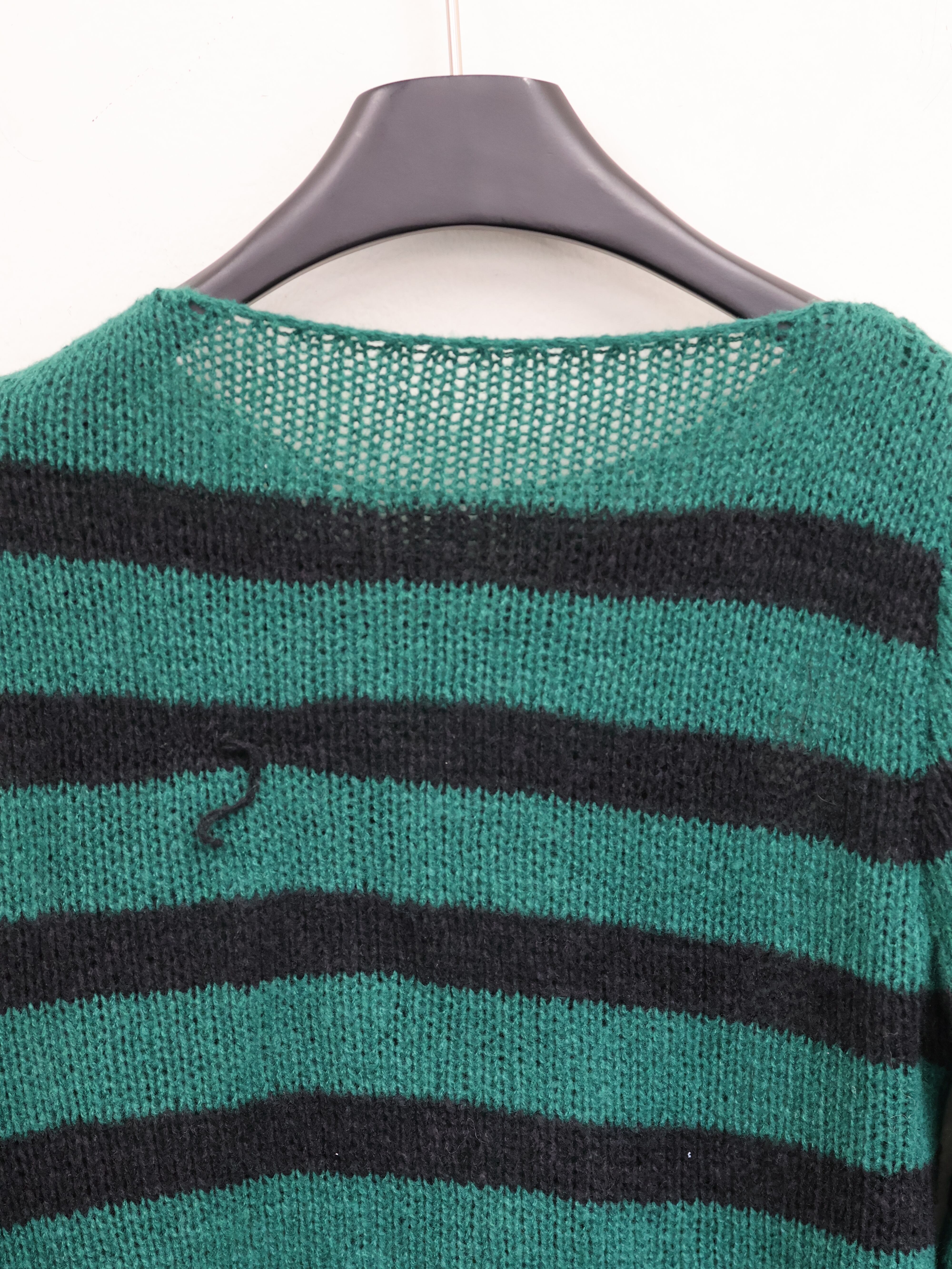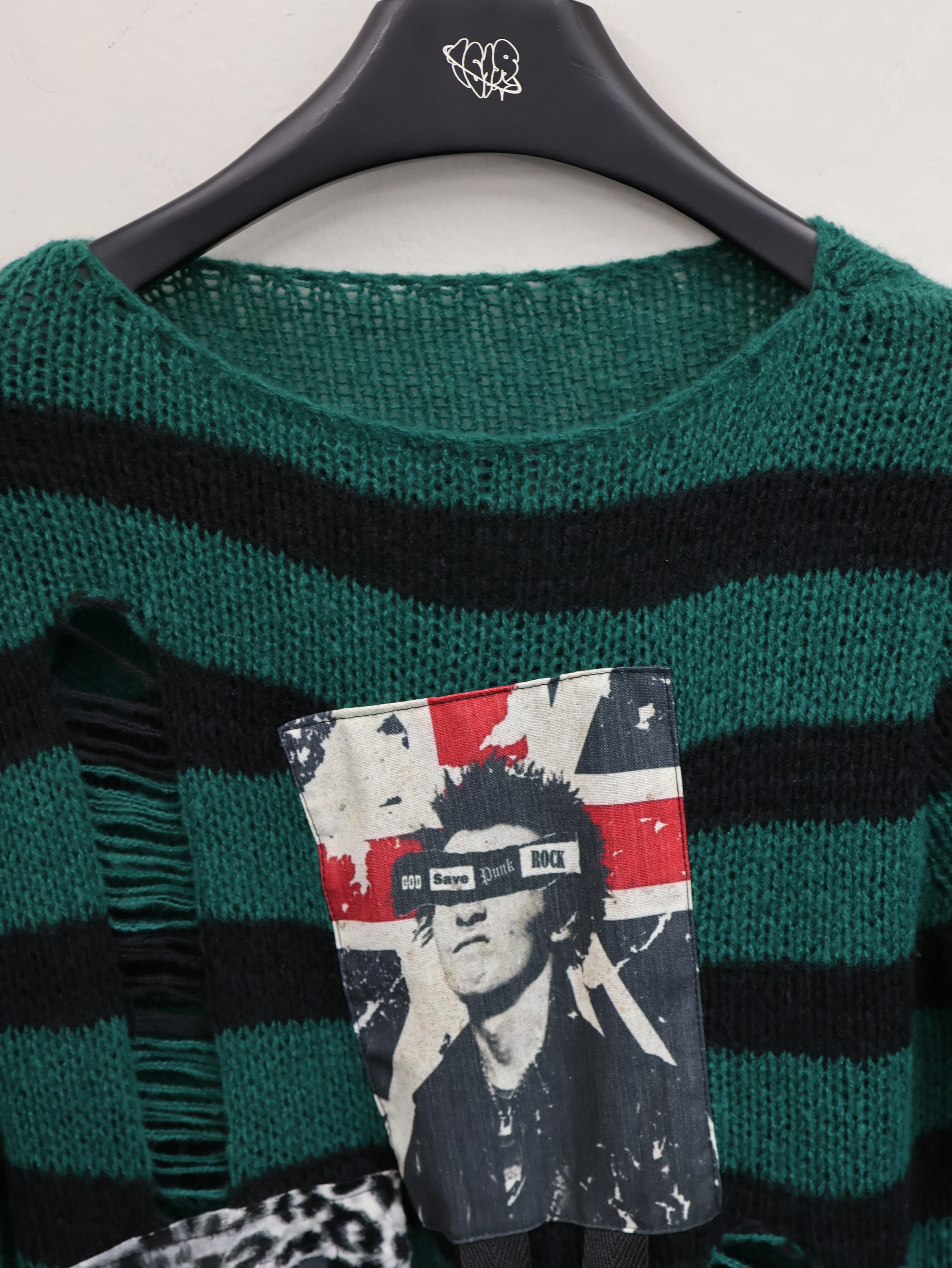 目を奪うグリーン×ブラックの太ボーダー。ざっくりとした透け感のある編み地に、ハードなパッチやジップ、チェーンを重ねた一点物リメイクニットです。