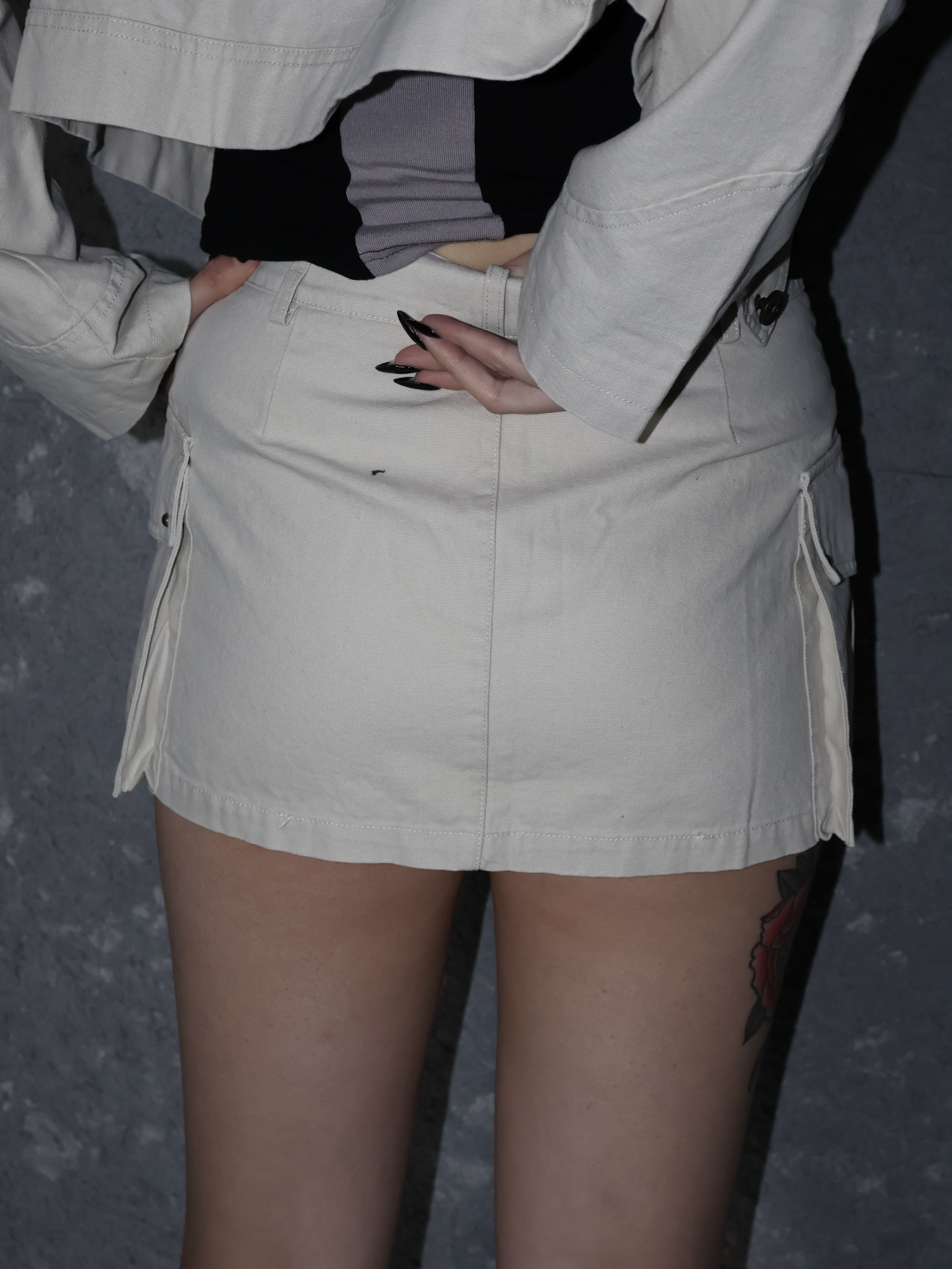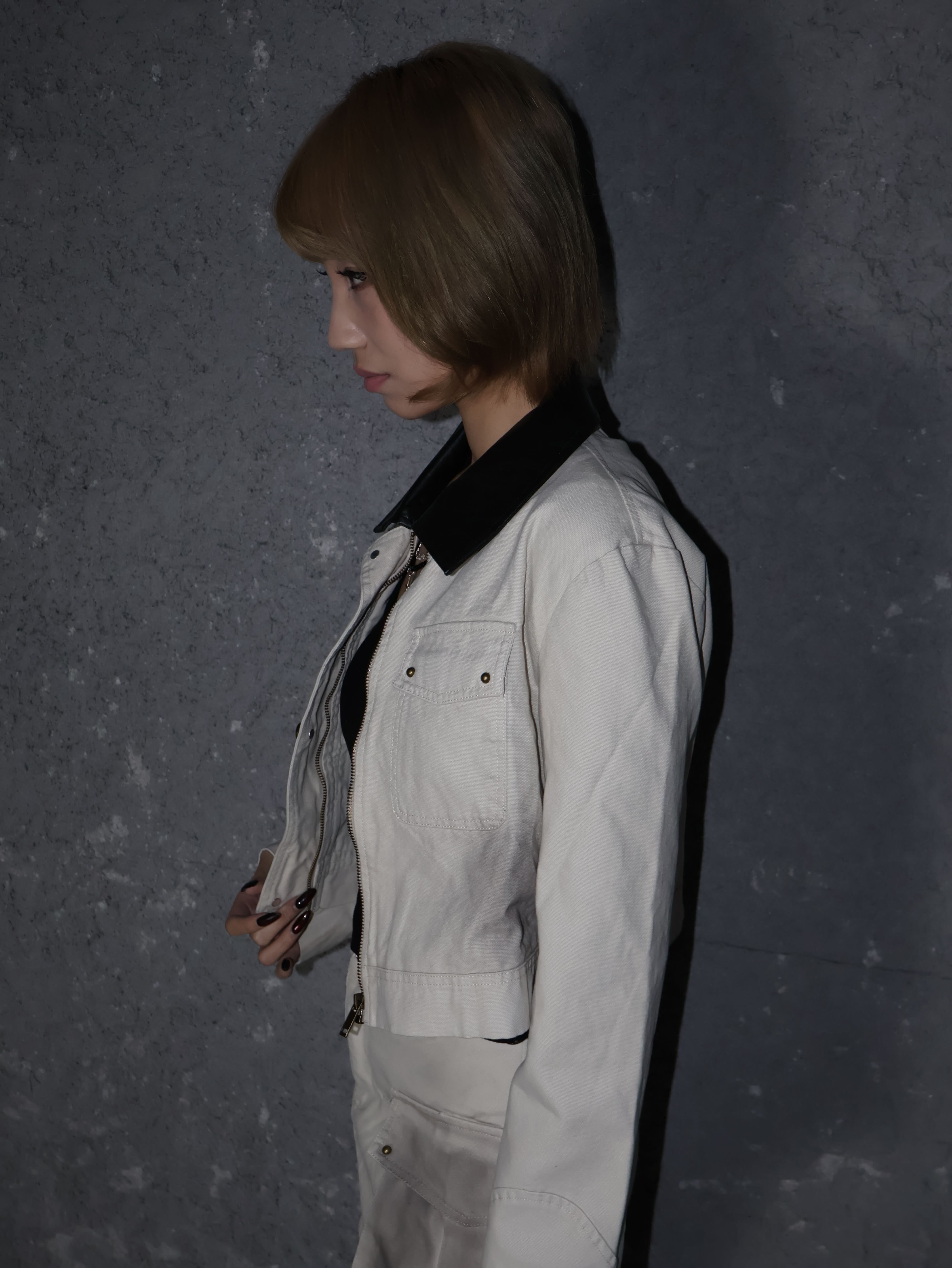 くすみベージュに立体フェードを効かせた、Y2Kストリート感強めのセットアップ。ジャケットはコンパクトに、スカートはミニシルエットで脚のラインを綺麗に見せてくれる“盛れバランス”がポイント。セットでも単品でも使いやすく、韓スト〜平成ギャルまで幅広くハマる主役級アイテム。