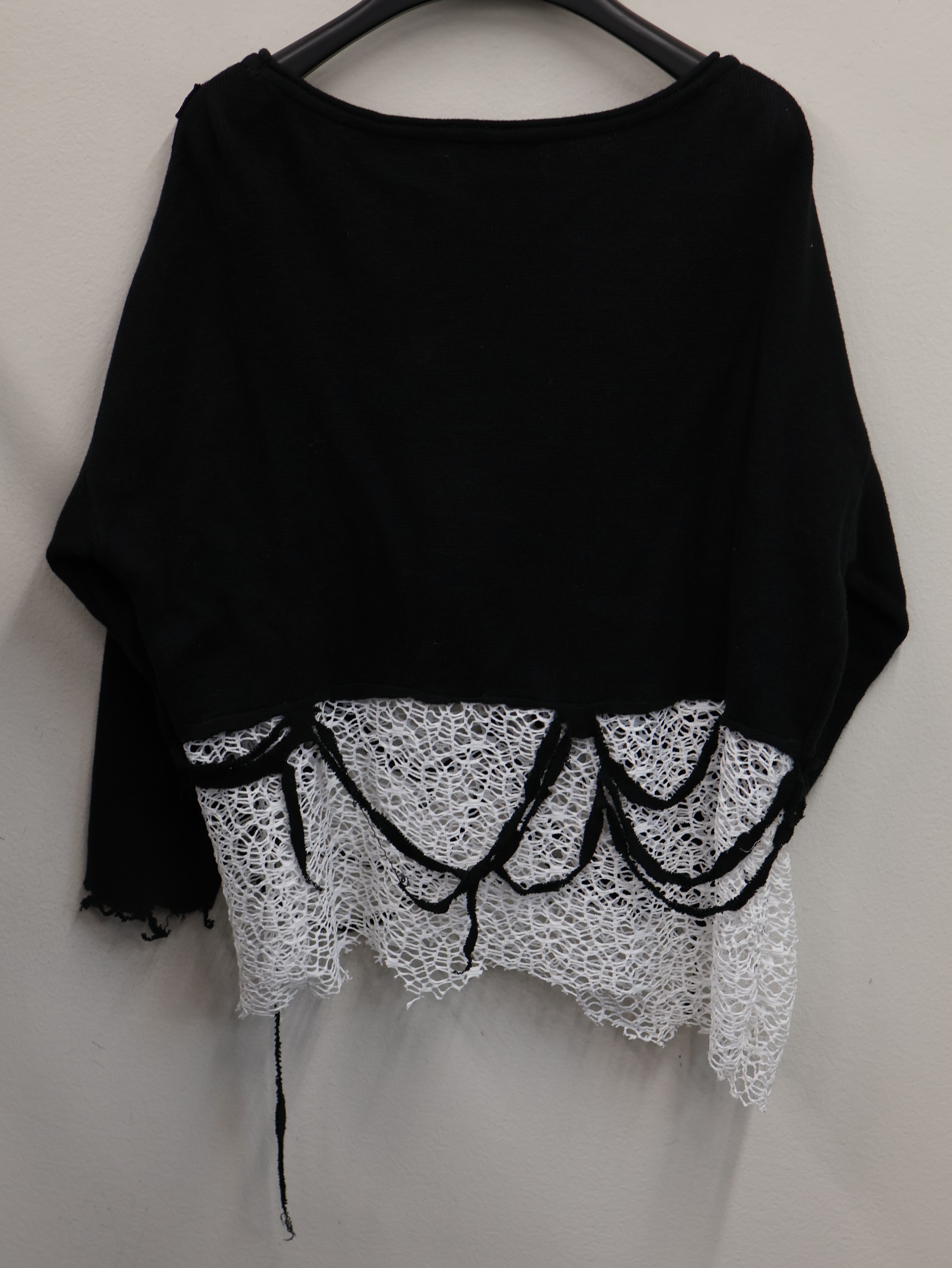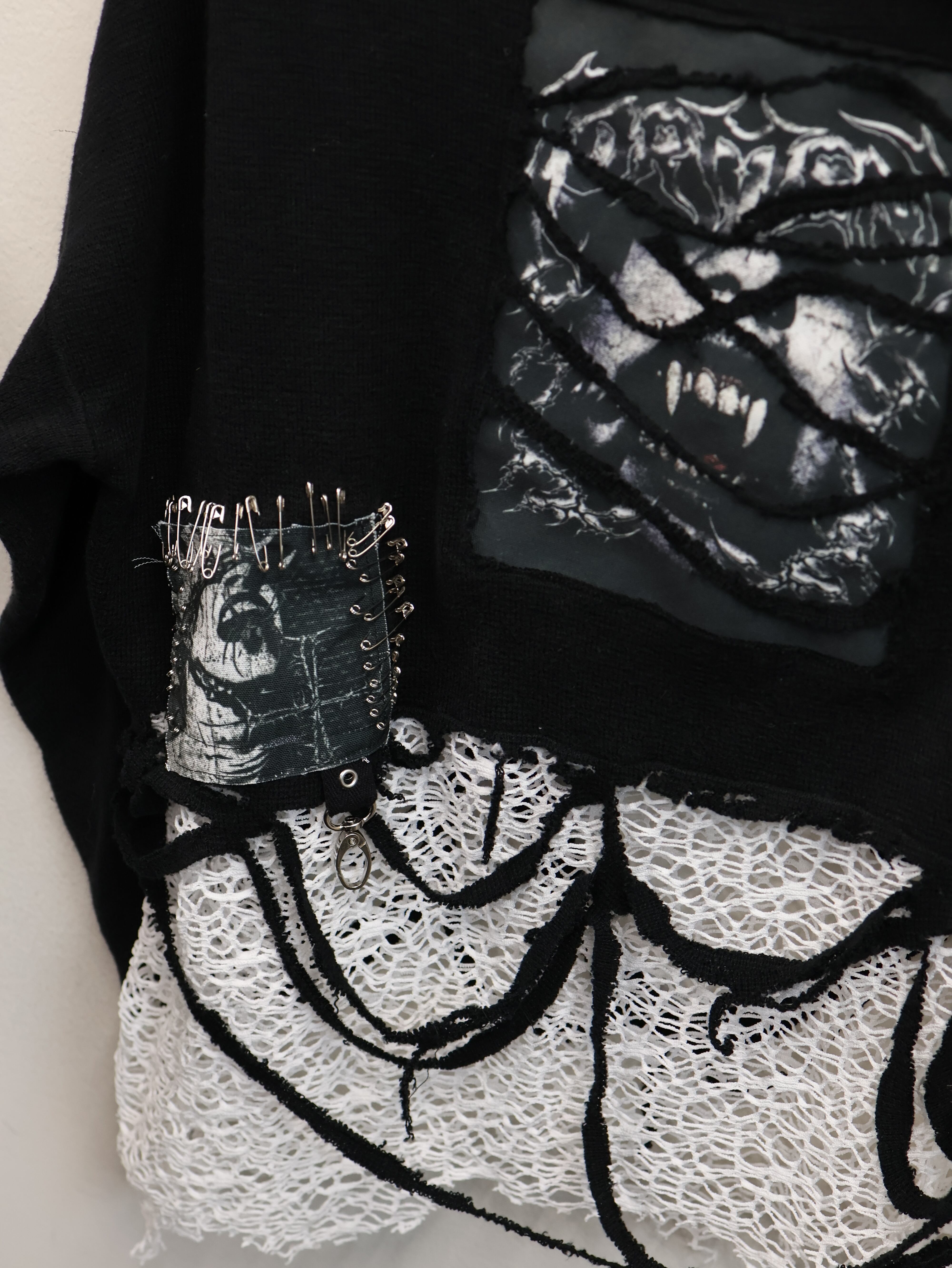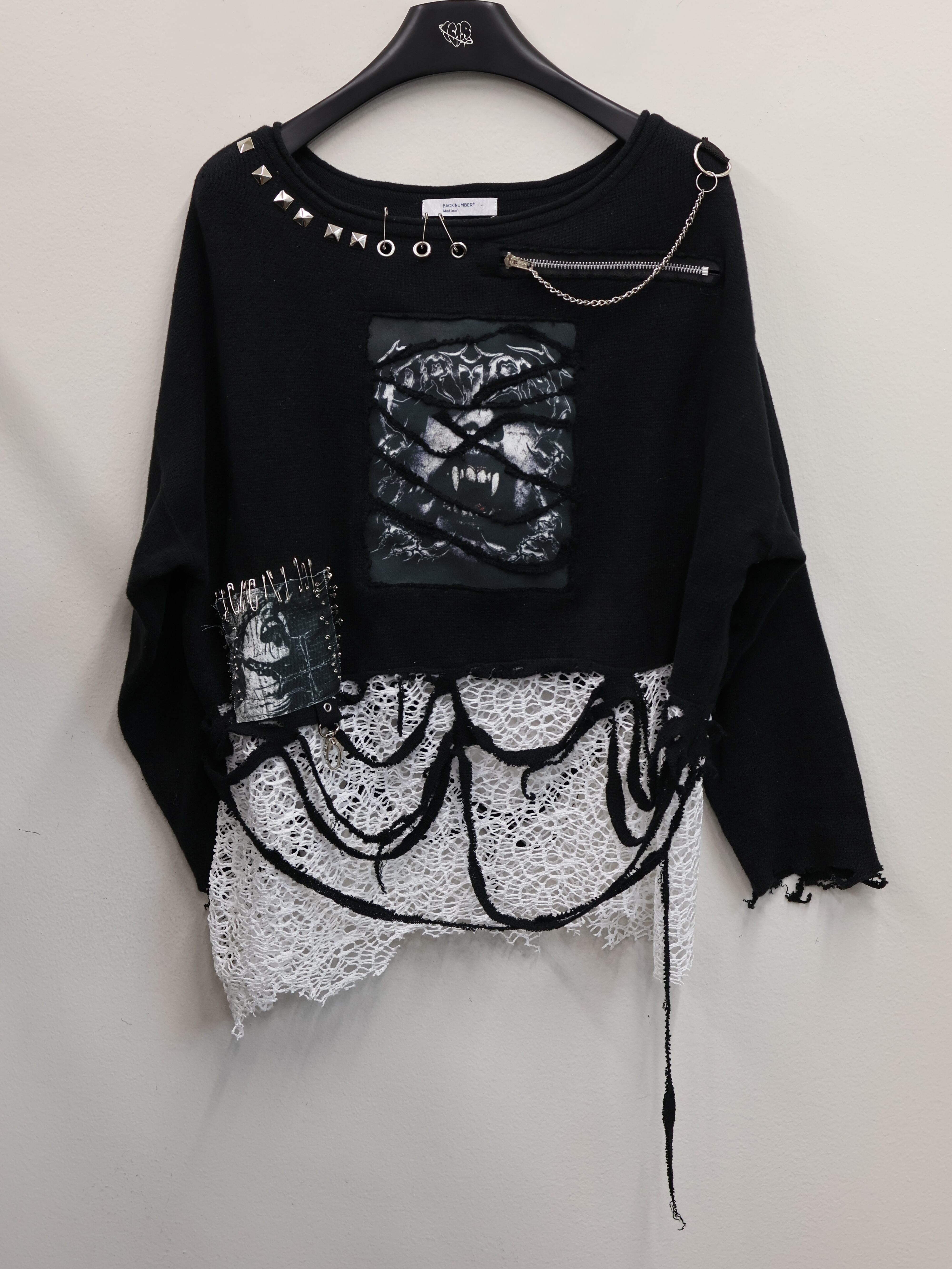 ざっくりとしたローゲージのブラックボディに、バンドグラフィックを大胆にクラッシュ加工で重ねた一点物リメイクニット。
