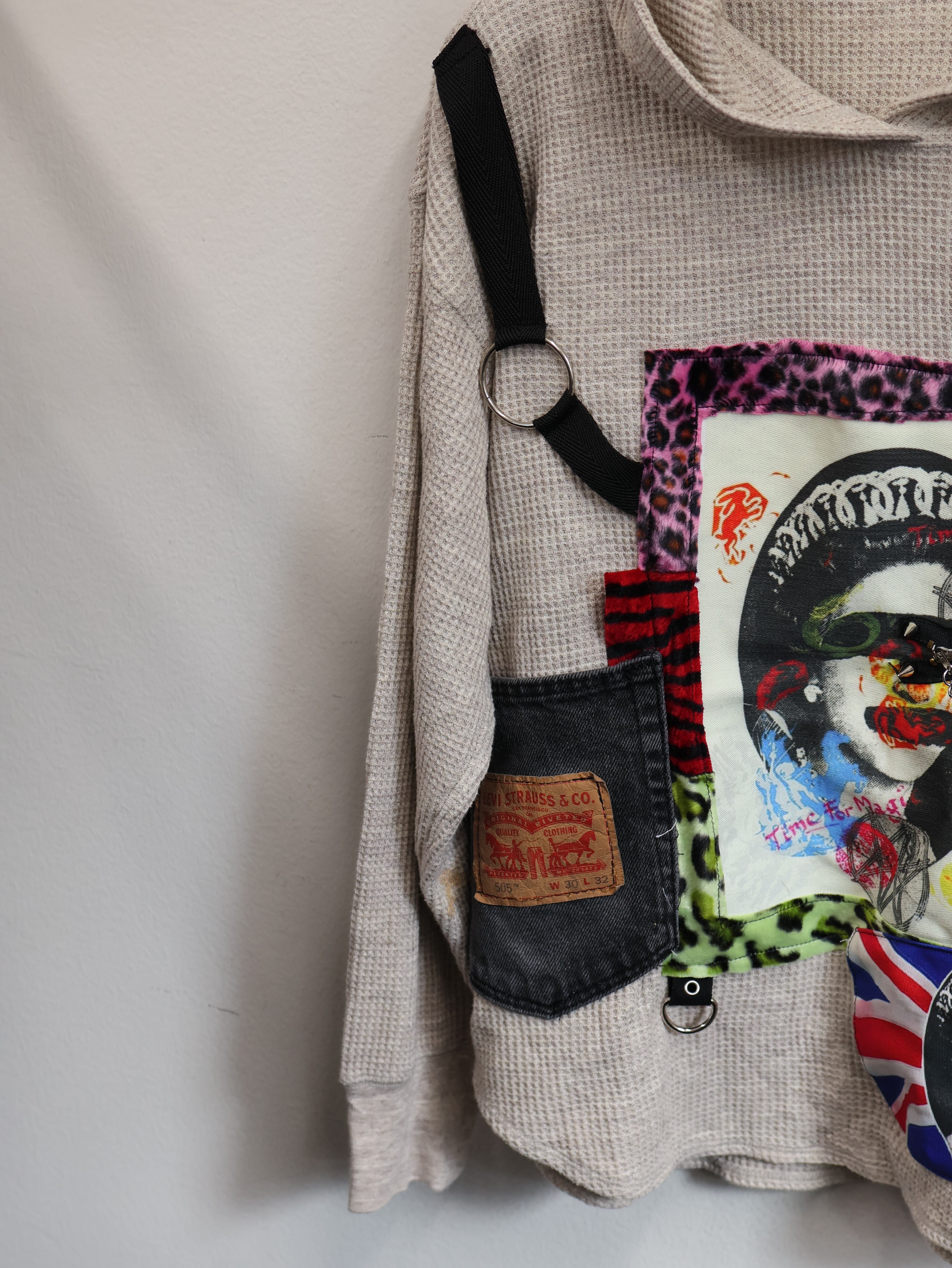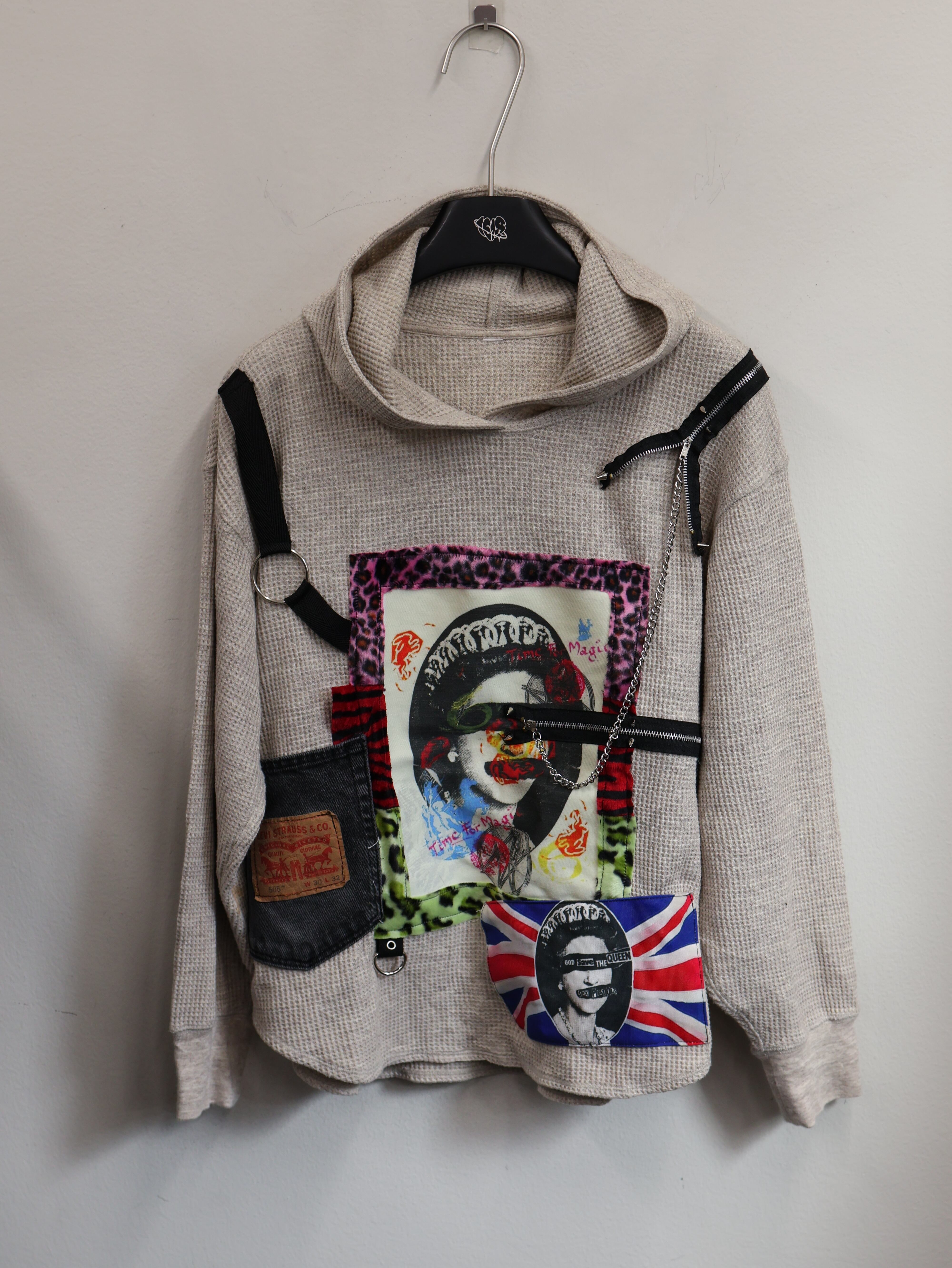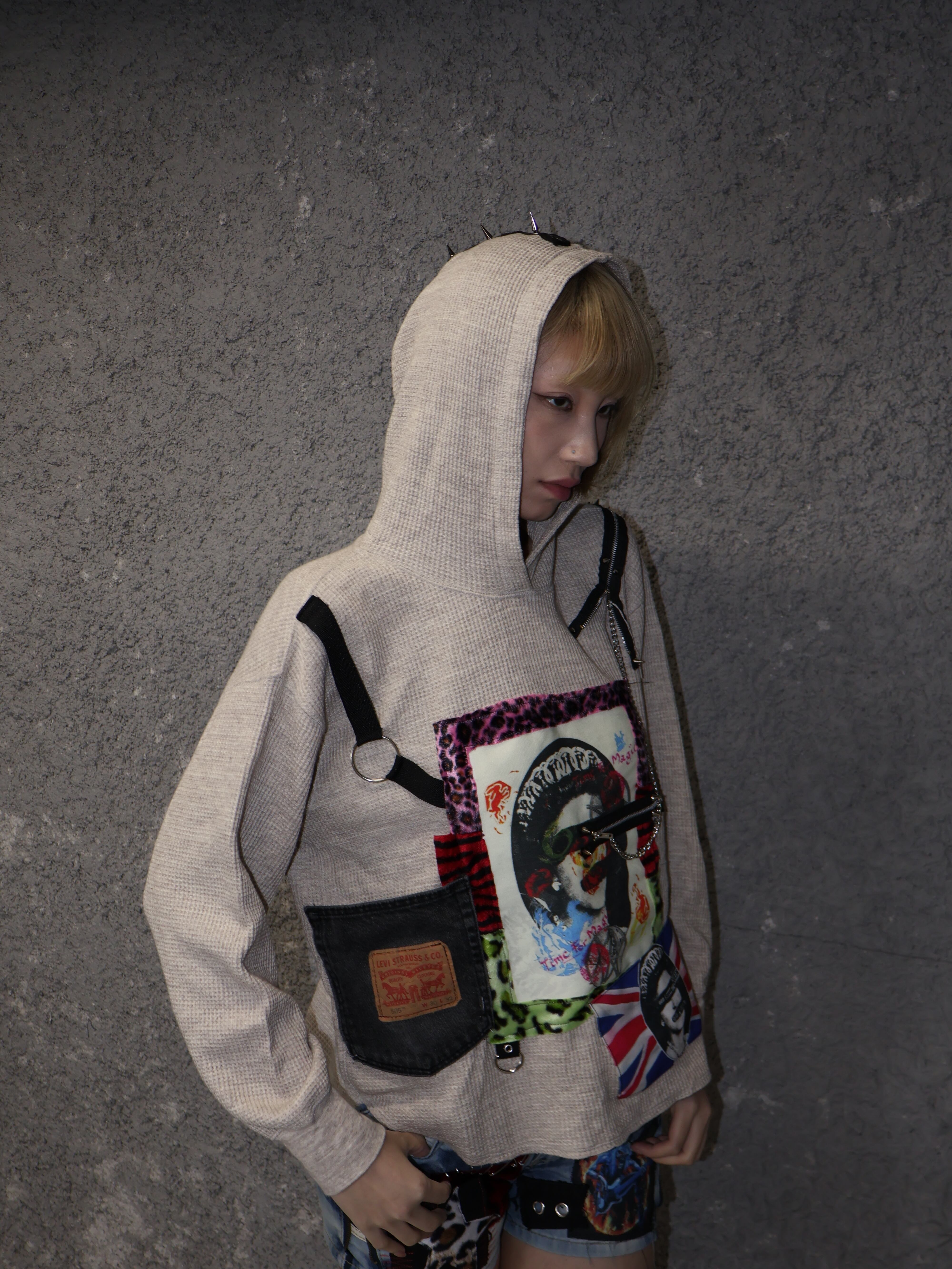 ワッフル地の柔らかいベージュボディに、異素材パッチとストラップディテールを大胆に叩きつけた一点物フーディ。
