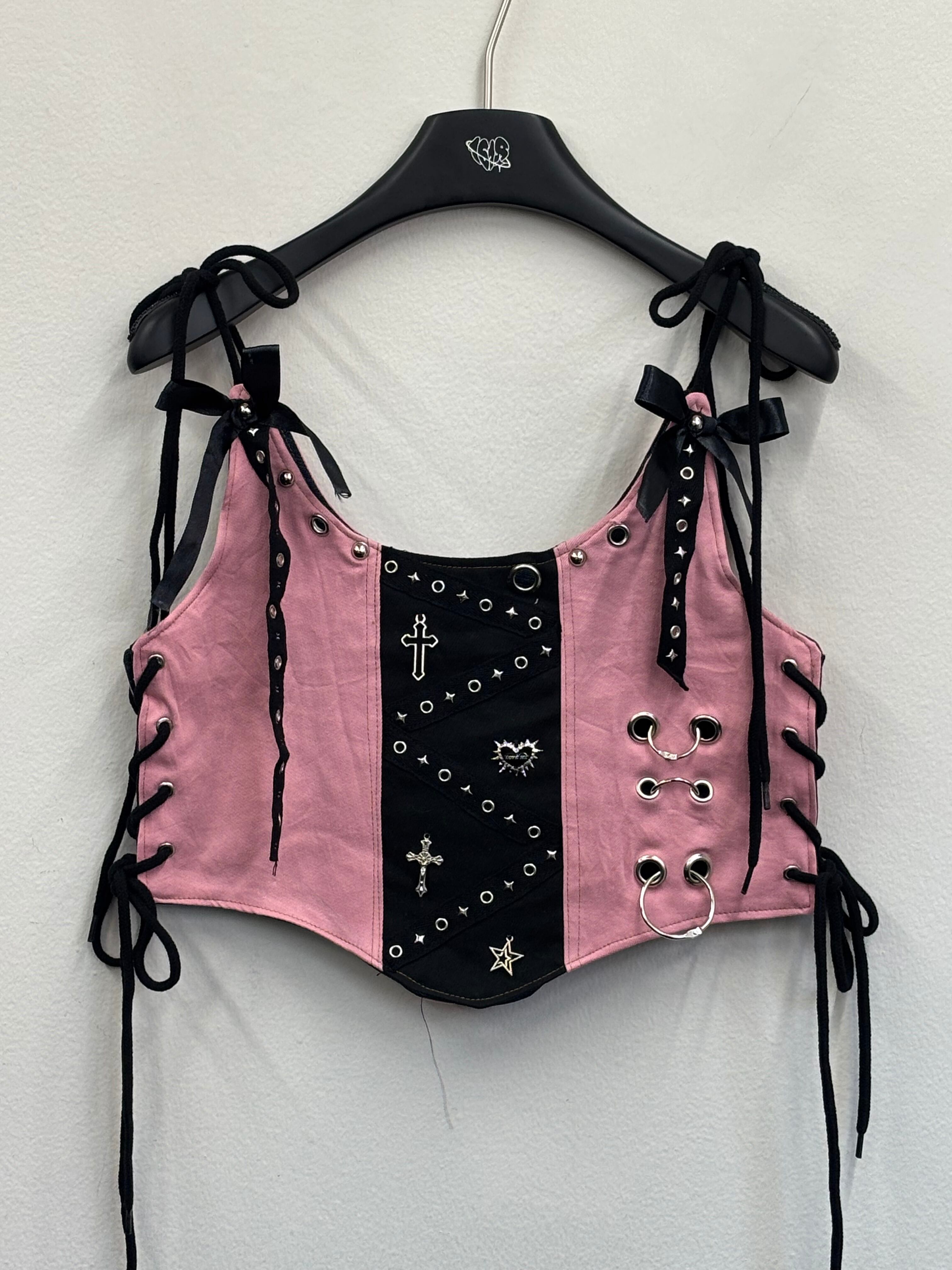 程よく厚みのあるコットンベース素材で、シーズンレスに着用可能。フロントのブラック切り替えにはクロスモチーフやアイレット、スタッズを贅沢に配置し、甘さの中にエッジを効かせたデザイン。サイドレースアップでフィット感を調整できるため、盛れシルエットを自分好みに作れます。
