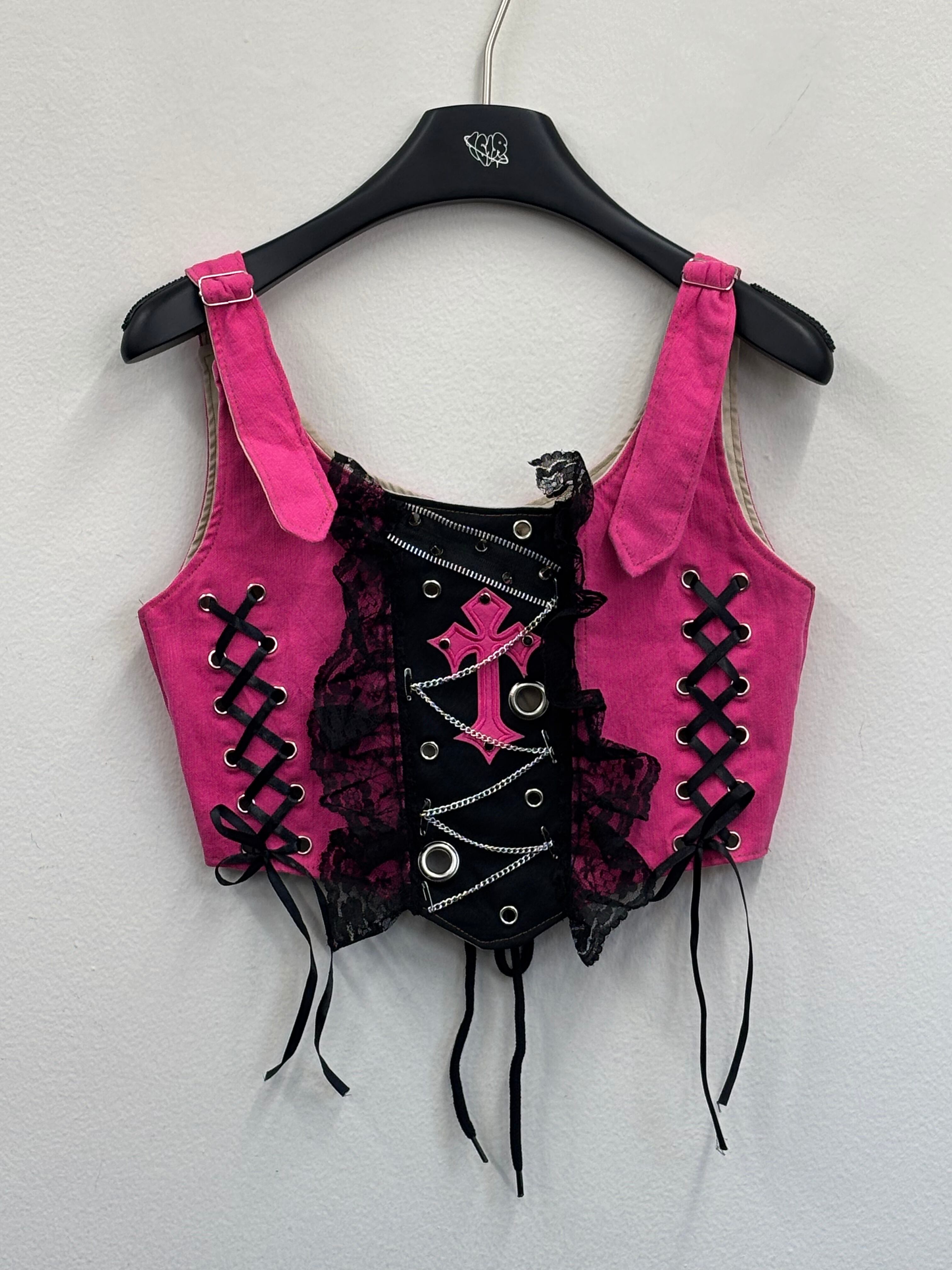 ダークインディゴデニムをベースに、パンクパッチ・レオパード・チェック・チェーンを重ねた一点物ビスチェ。しっかりめのデニム素材でボディラインを拾いすぎず、ウエストにかけて緩やかに絞られるシルエットが即スタイルアップ。肩とサイドはリボンレースアップ仕様でフィット感も調整可能。羽織るだけで完成、即Y2Kギャル感が出せる一枚。フロントのスタッズラインと揺れるチェーンで視線を上に集め、盛れと高見えを同時に叶えます。デイリーの主役にも、夜のイベントやライブコーデにも映える存在感。