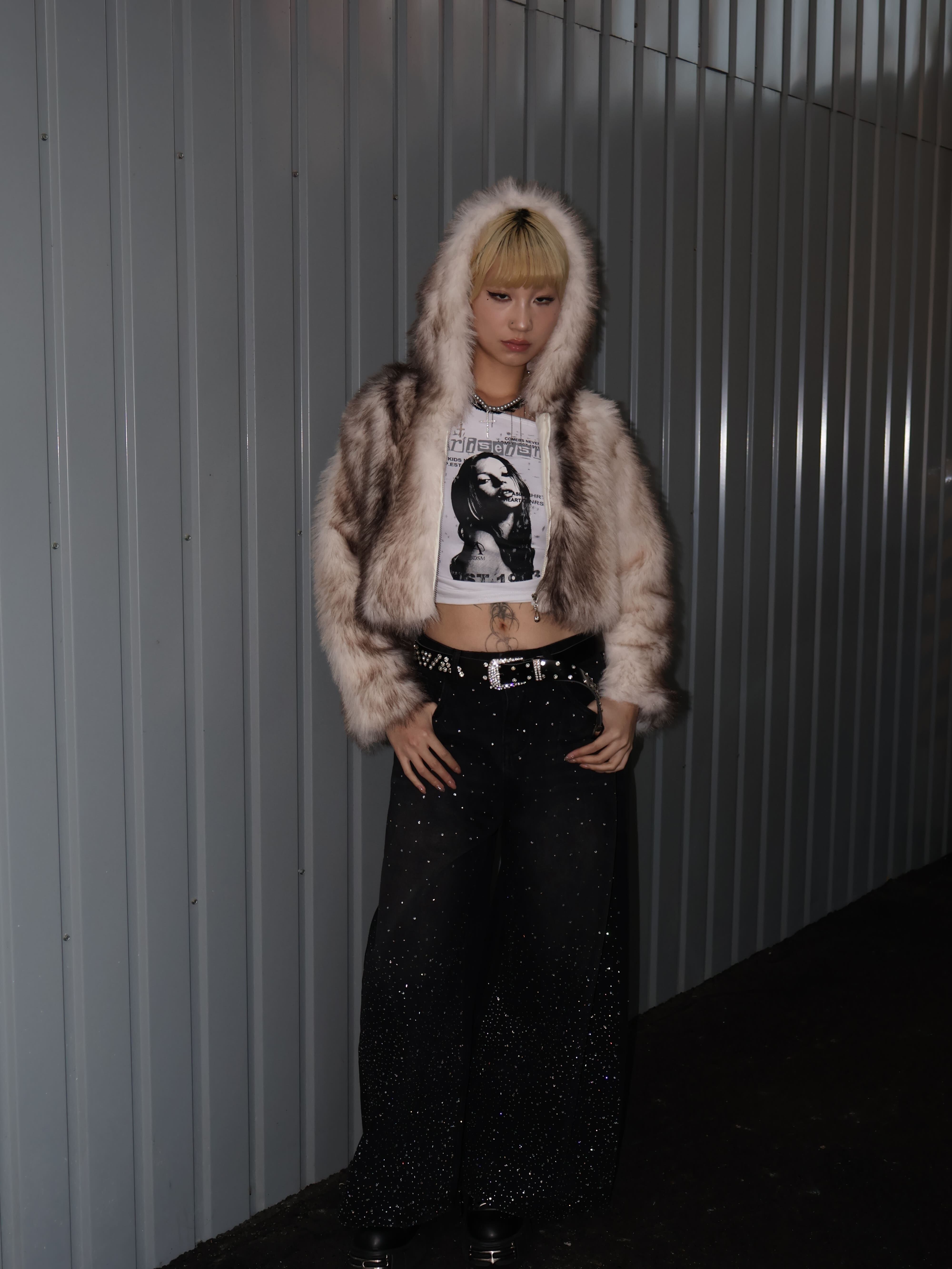 存在感たっぷりのボリュームファーが視線を奪う、Y2Kムード全開のショート丈フーディー。