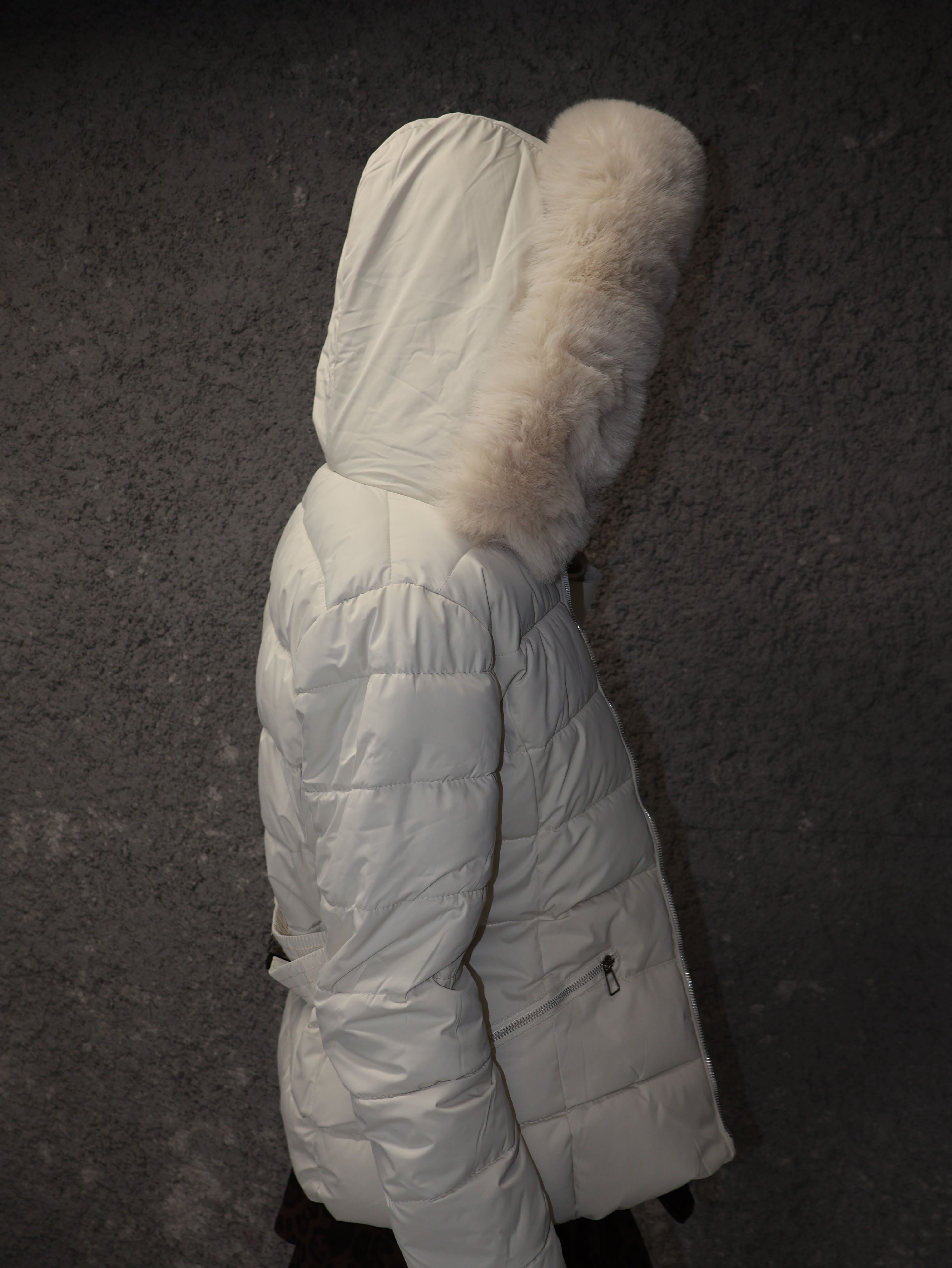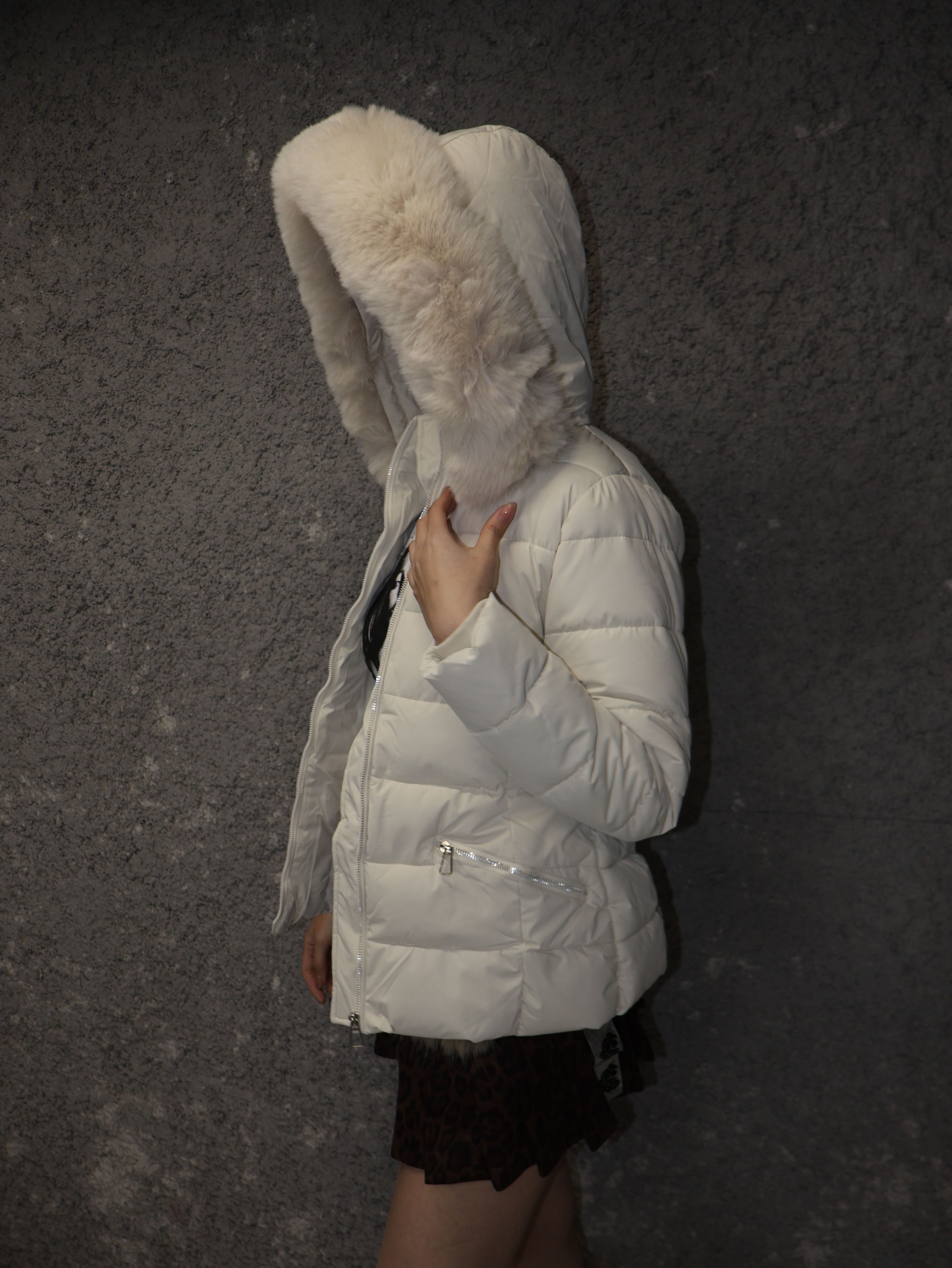 ウエストがしっかりくびれて見え、ファーフードの存在感で小顔効果が最強。ミニスカ合わせで脚長シルエットが盛れる。