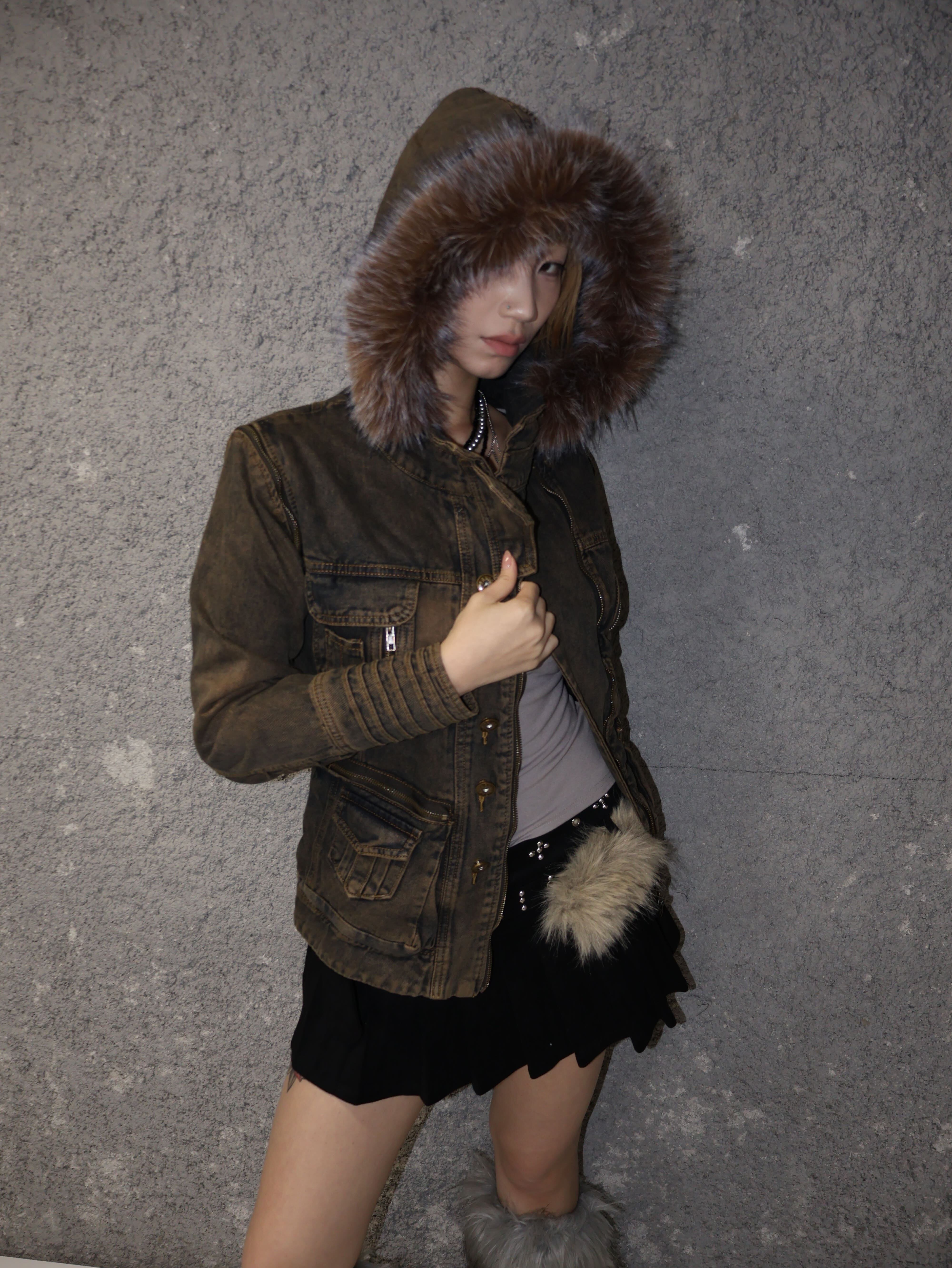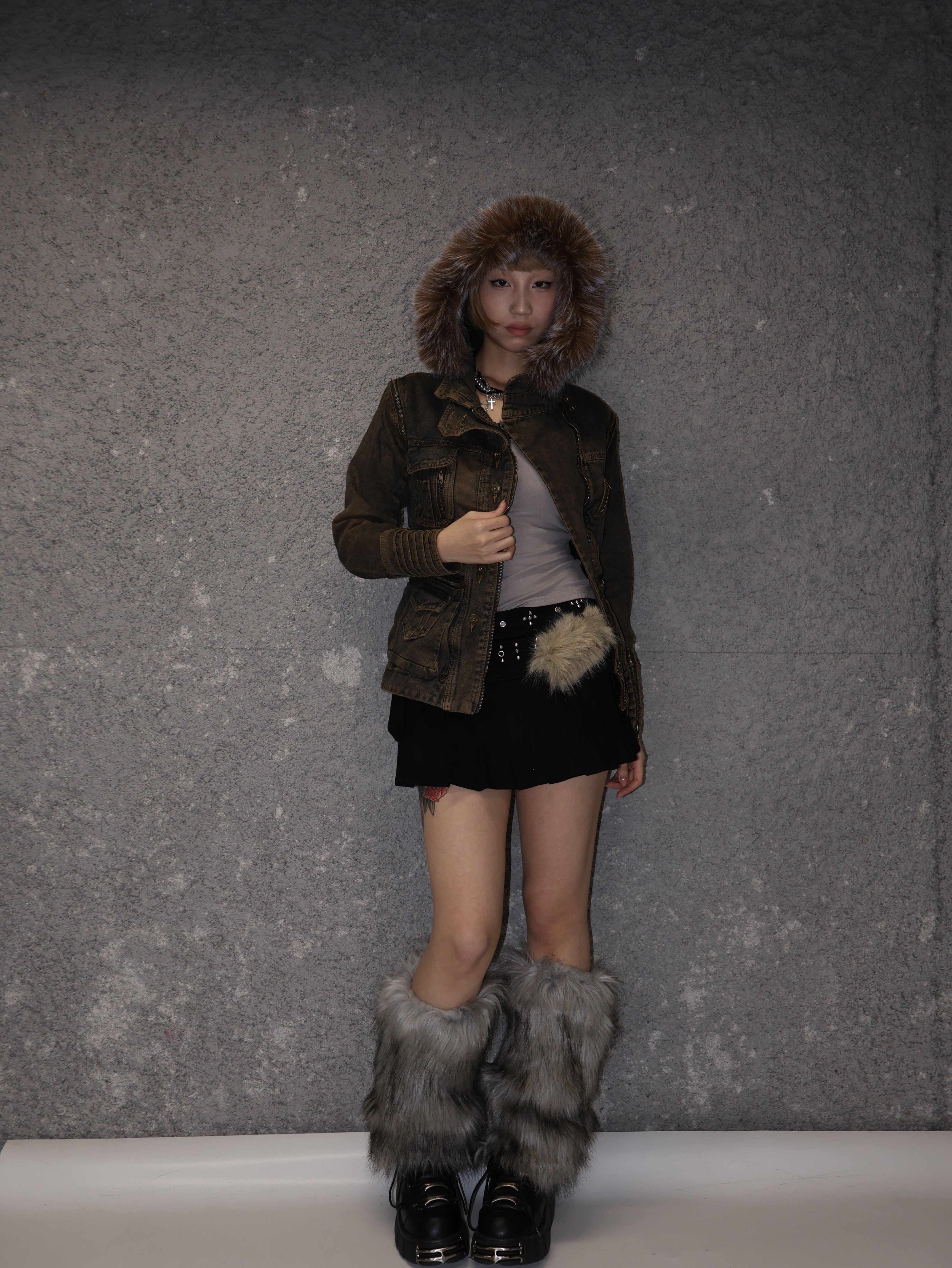 タイトめのSサイズが逆にメリハリを作り、上半身がコンパクトに盛れ見え。ファーフードのボリュームが映えて、強めのY2Kシルエットが完成。