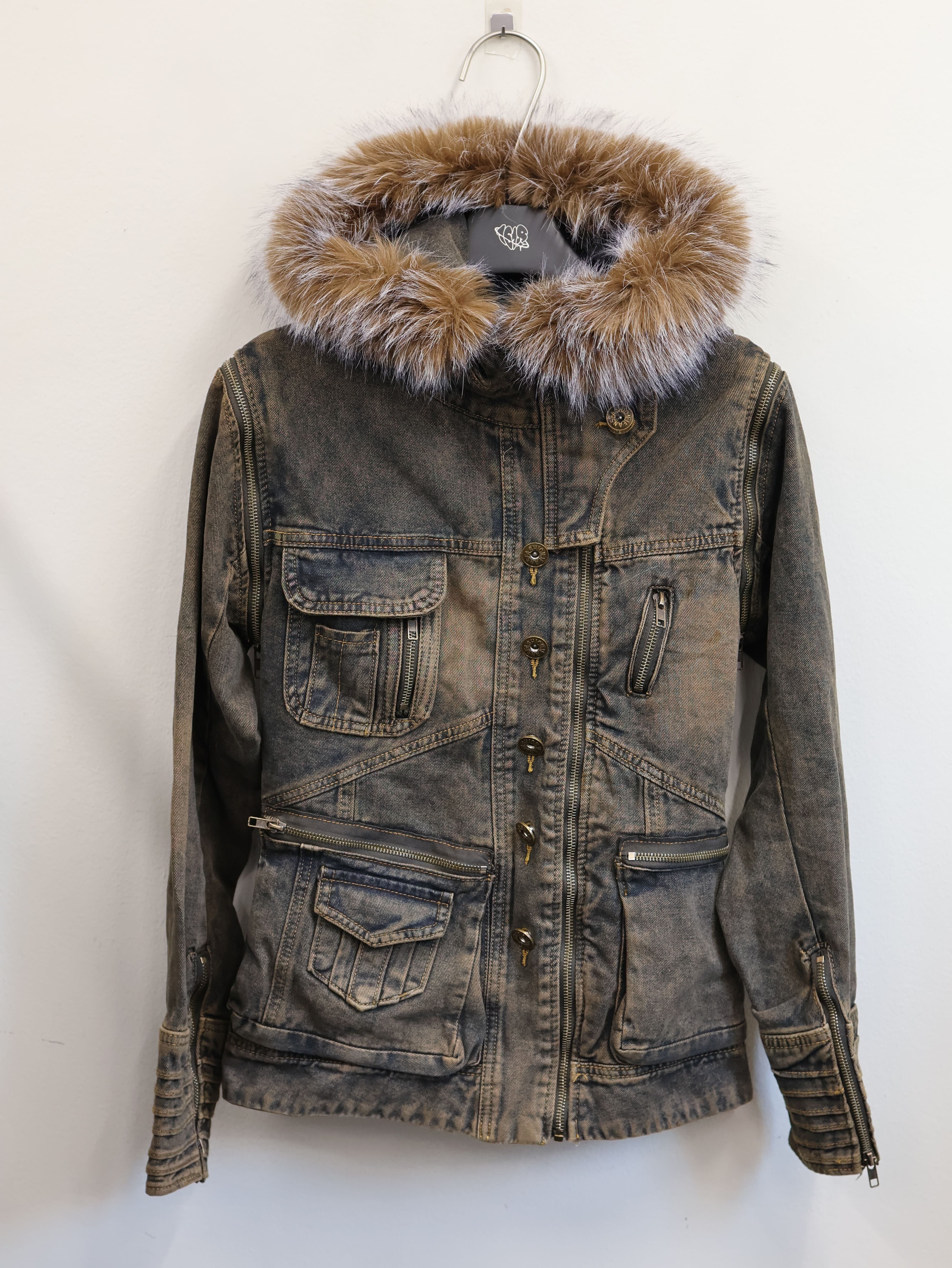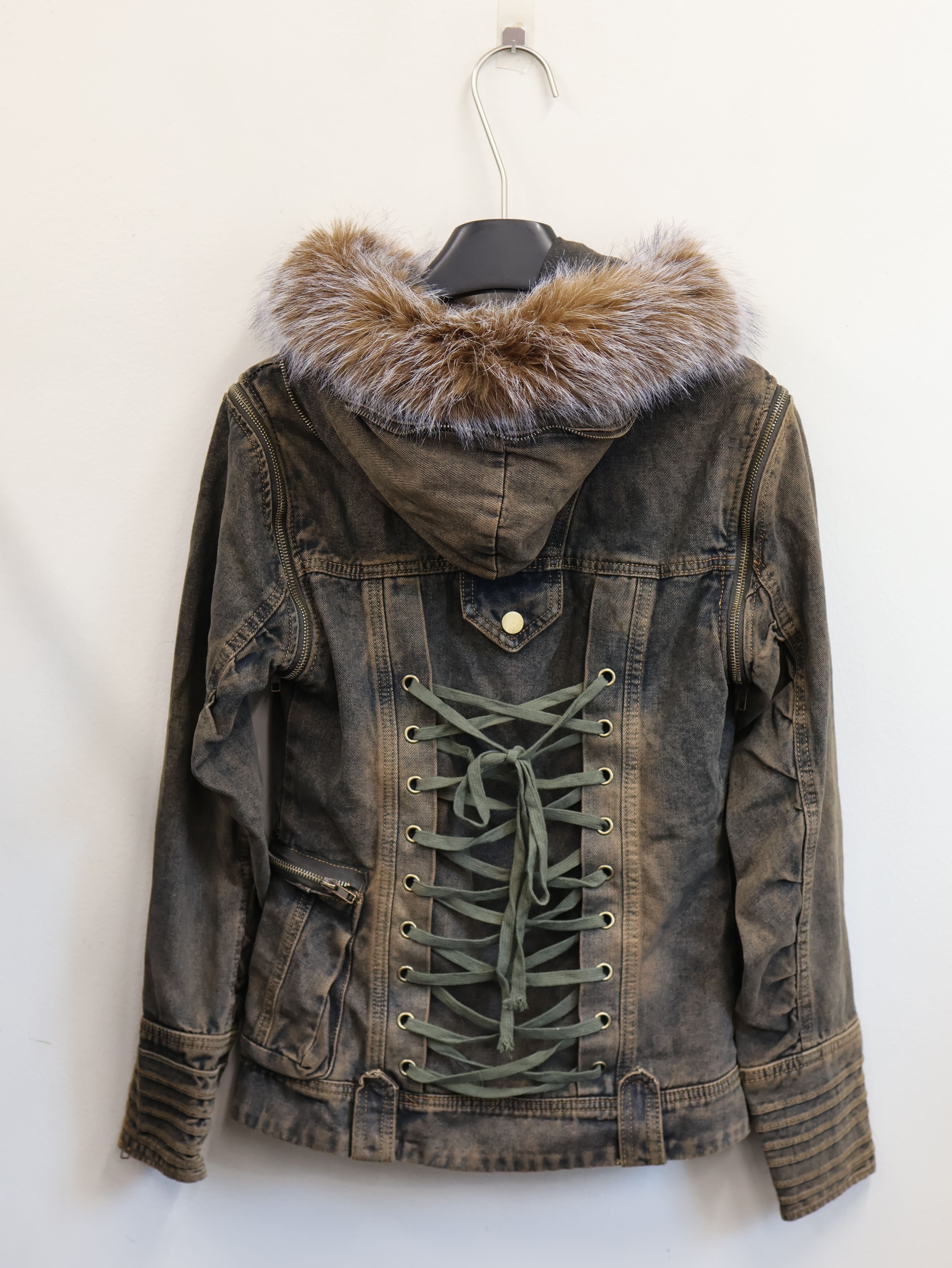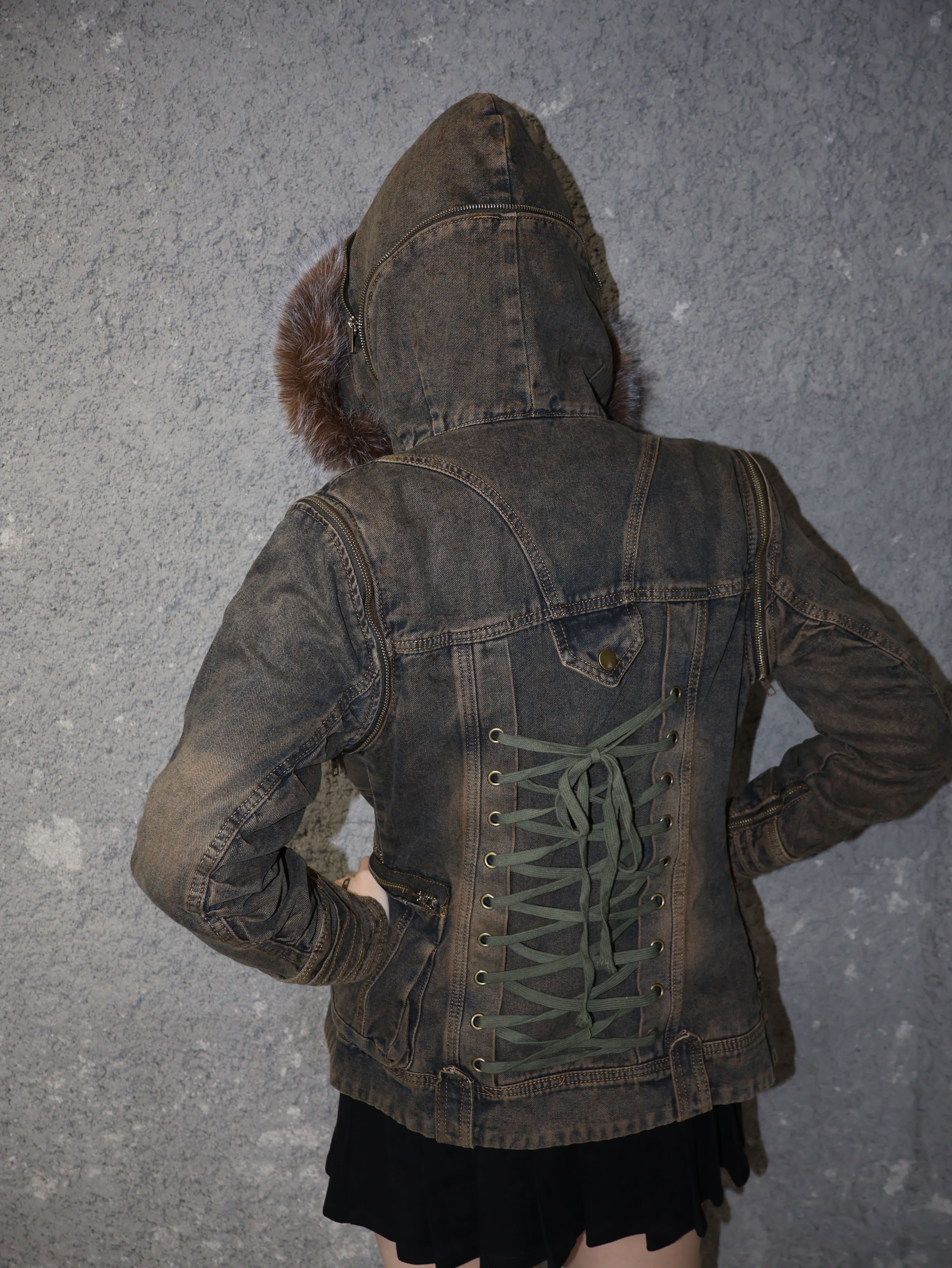ヴィンテージ感のあるデニムに、ふわっとボリューミーなファーフードをドッキングした最強アウター。顔まわりが小さく見えるファーの存在感で、一瞬で盛れシルエットが完成。Sサイズならではのコンパクトめシルエットが身体のラインを綺麗に見せ、ミニ丈・ローライズとの相性が抜群。スト系・Y2K・ギャル系のどれにも馴染む、1618らしい“強めだけど高見え”の万能アウターです。