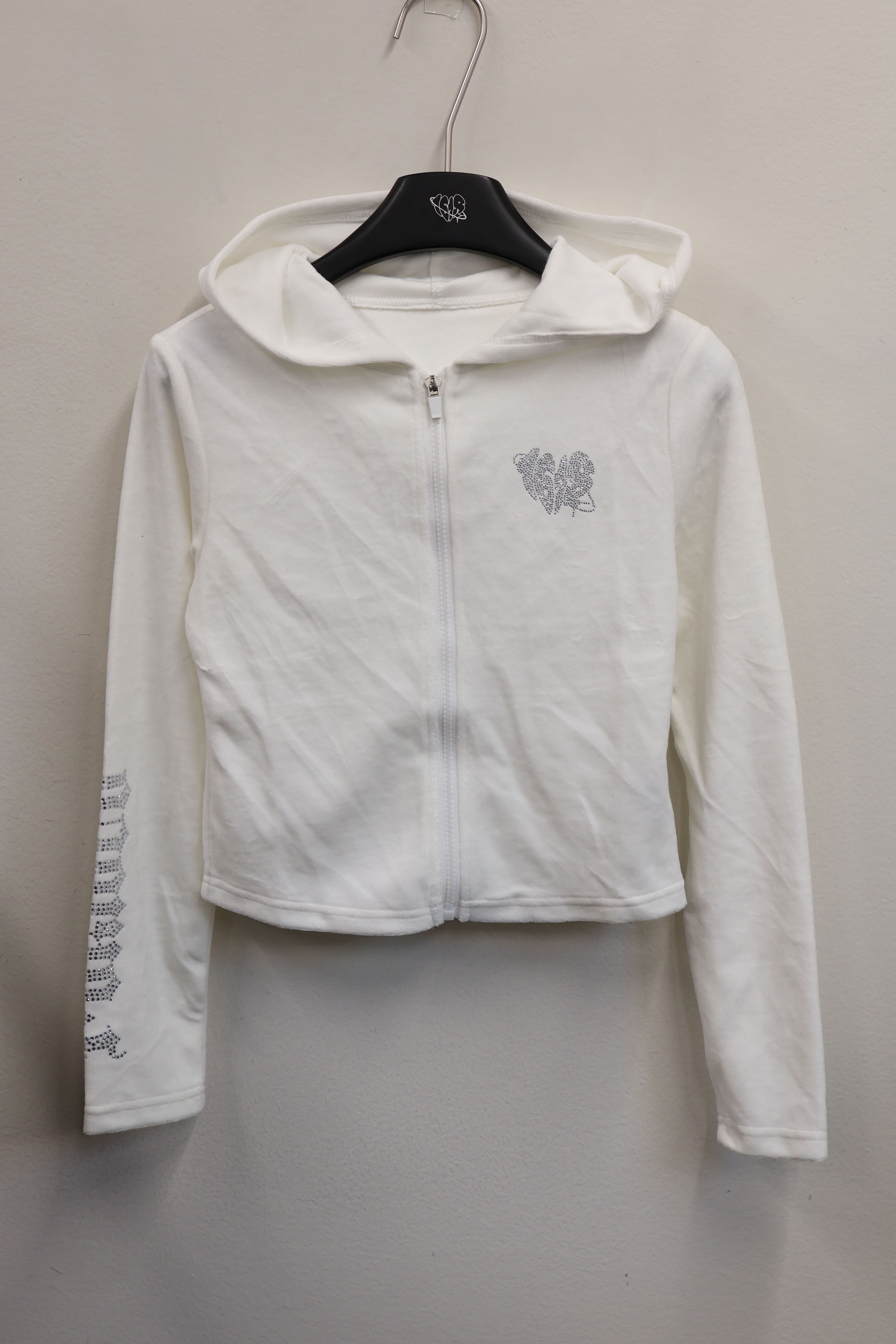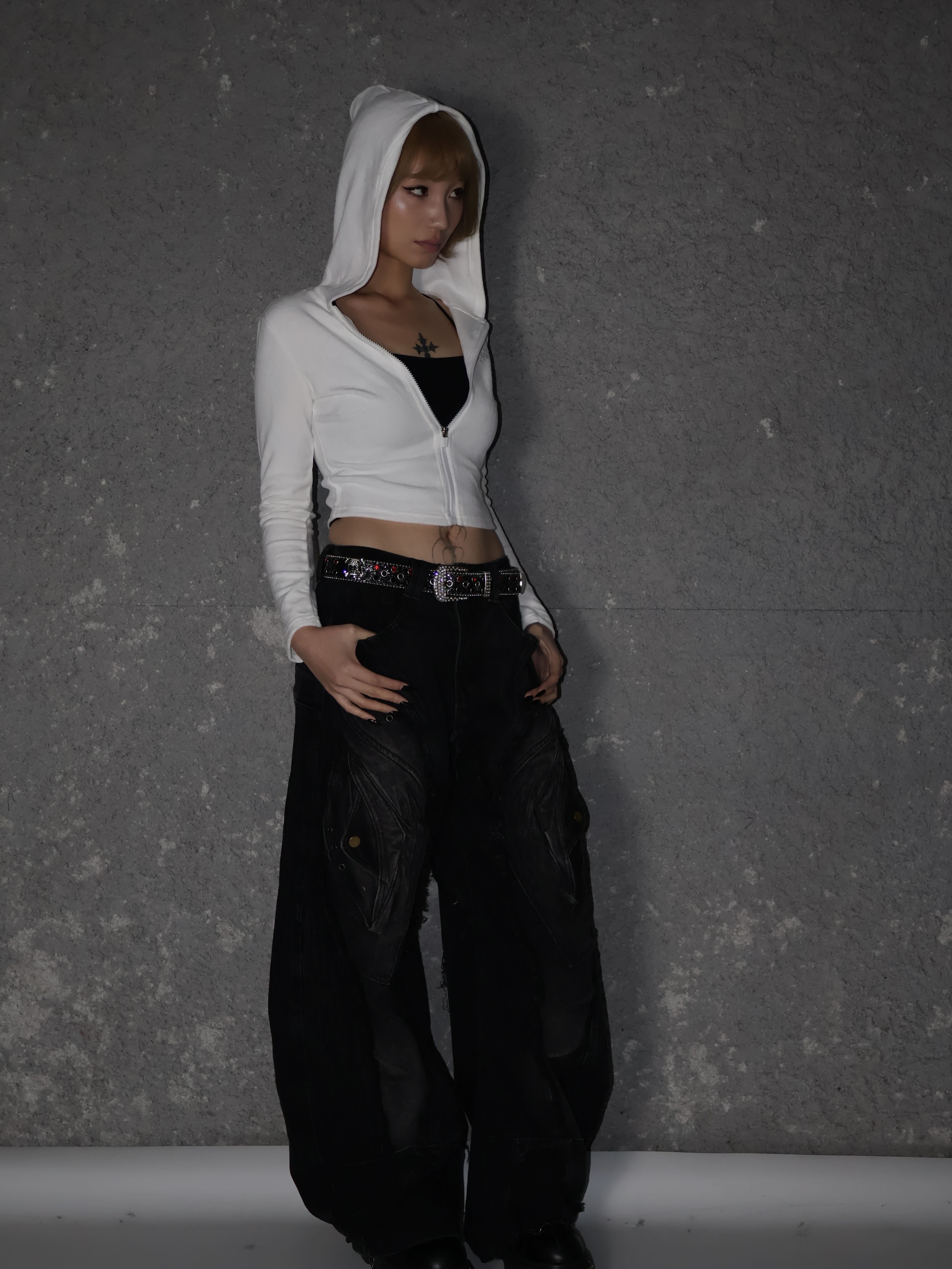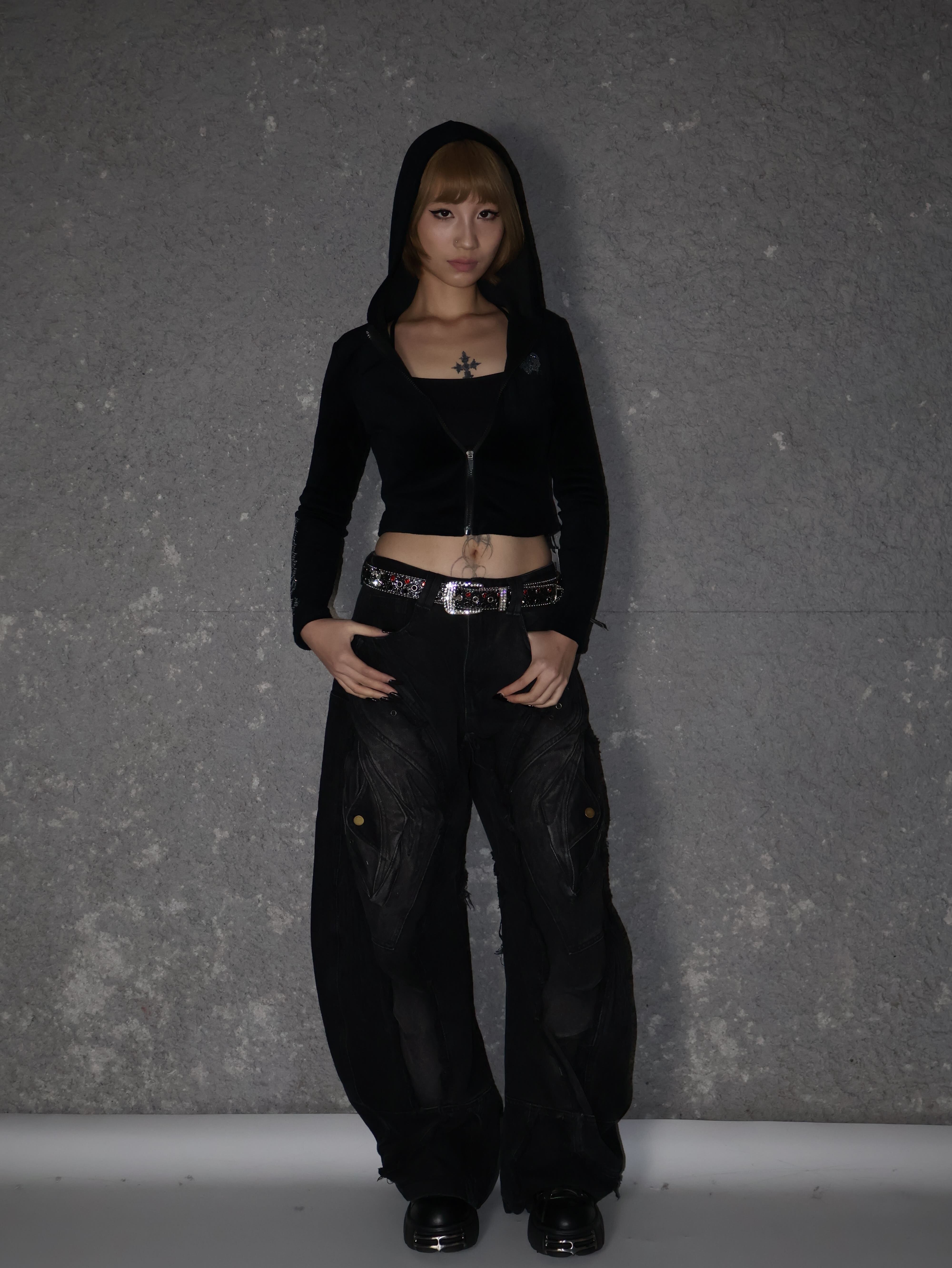 光の当たり方で艶が変わるベロア素材に、ジルコンのクロス&アームデザインをのせた強めフーディ。コンパクト丈×タイトシルエットで腰位置が高く見える盛れトップス。Y2K・韓スト・平成ギャルのムードに直結する“細身×クロップド×フード付き”の三拍子が揃った1枚。
