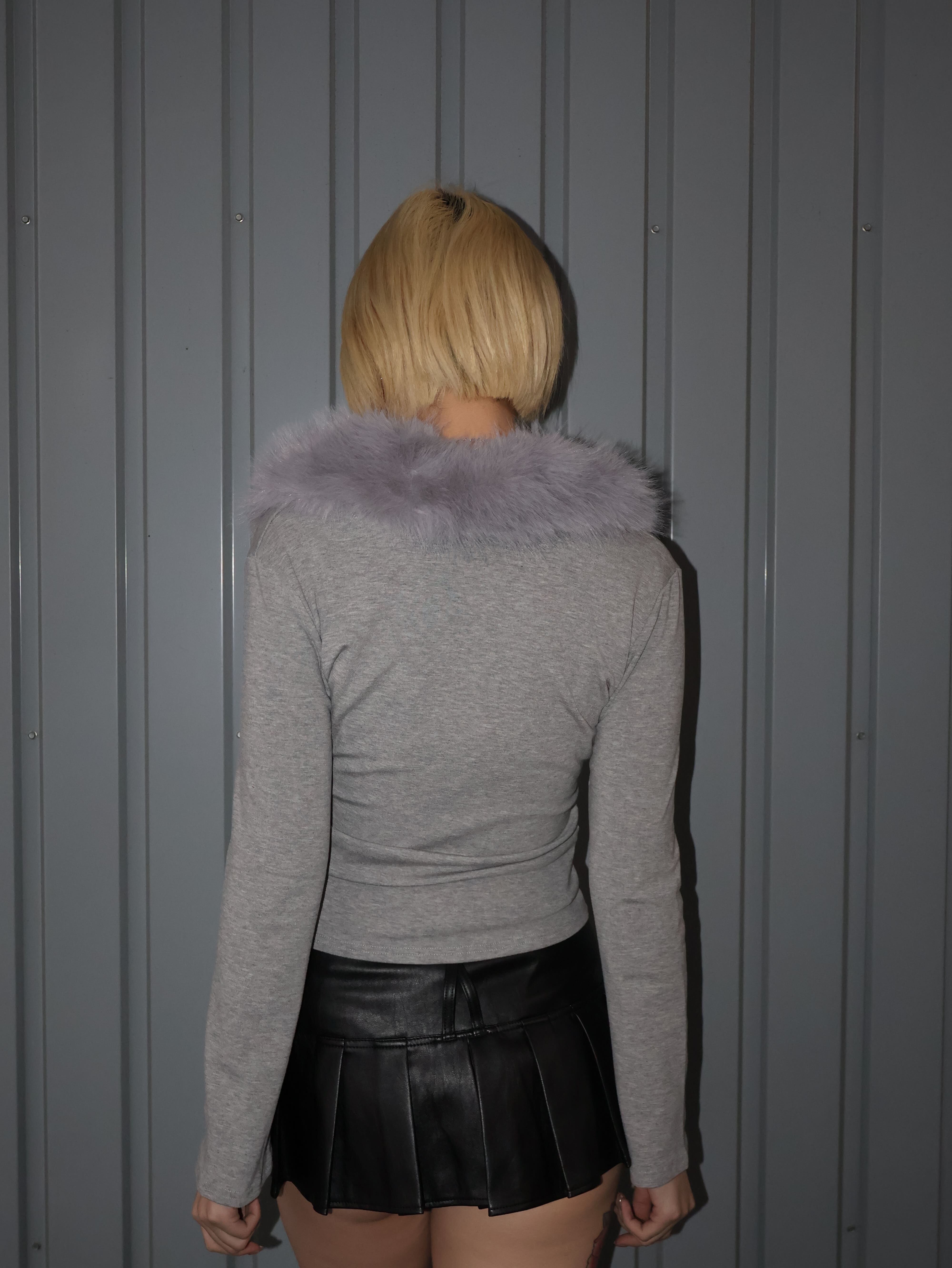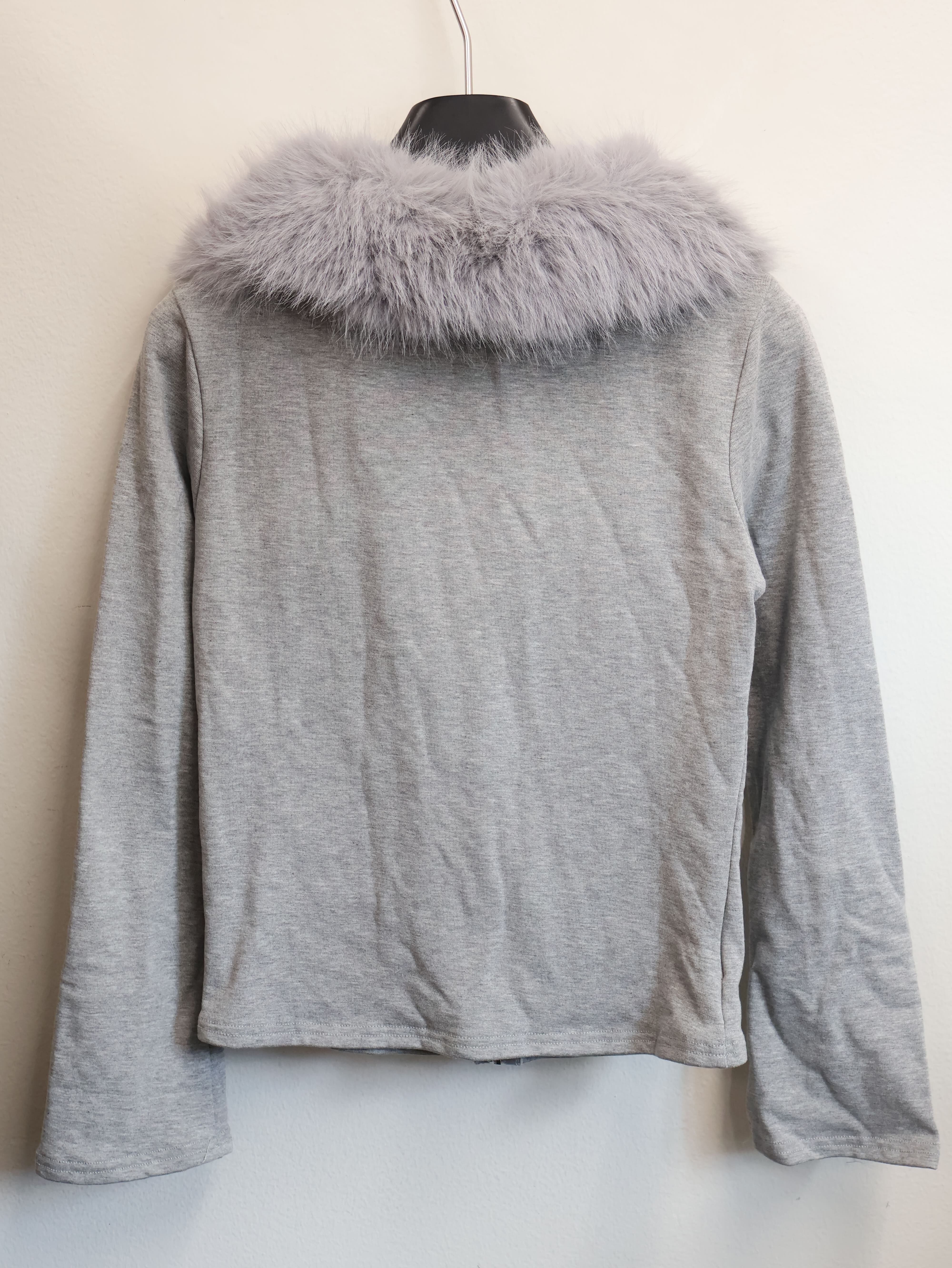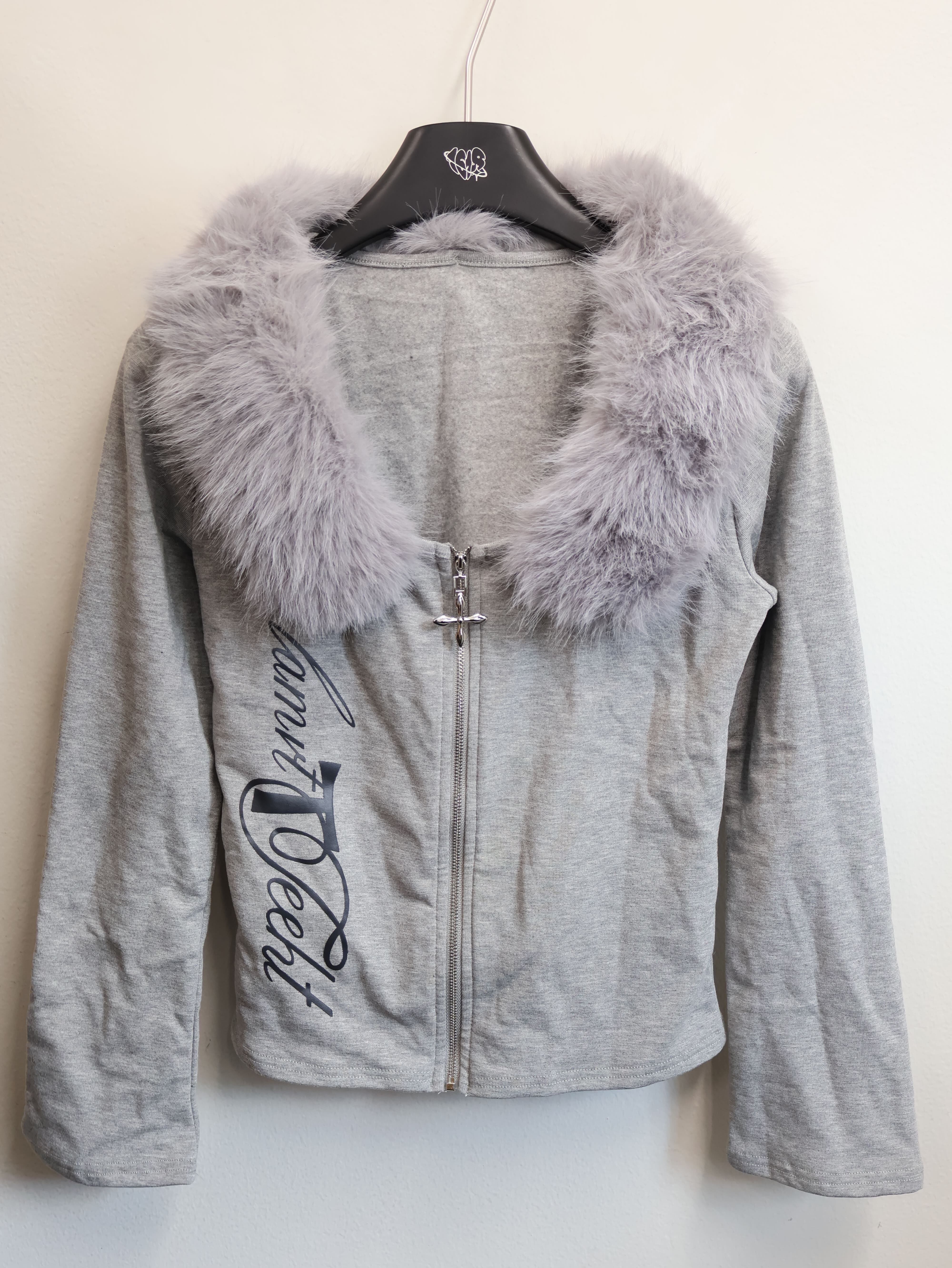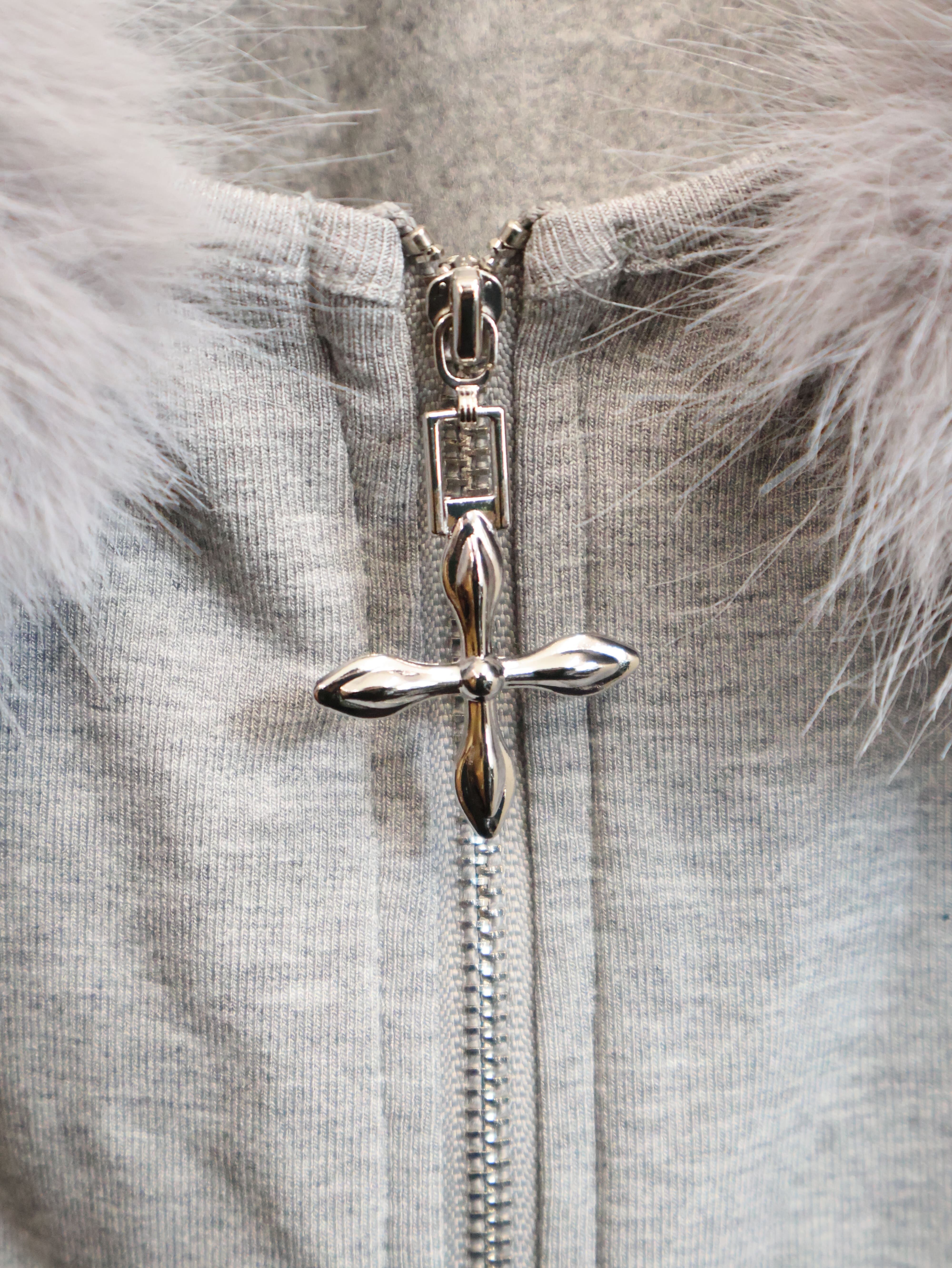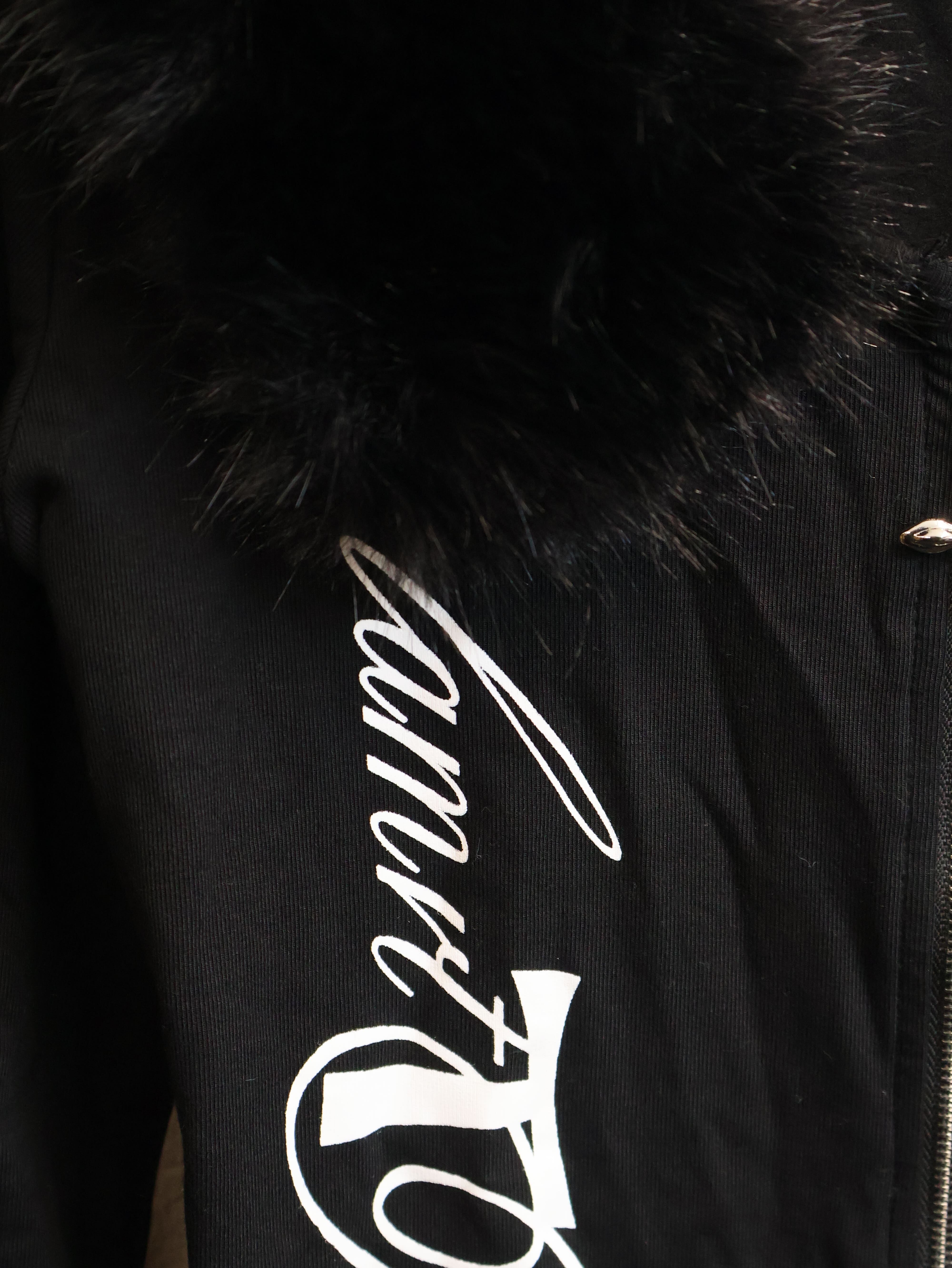 フードまわりに施されたファートリムが顔まわりを華やかに見せ、甘さとストリート感を両立した一枚。