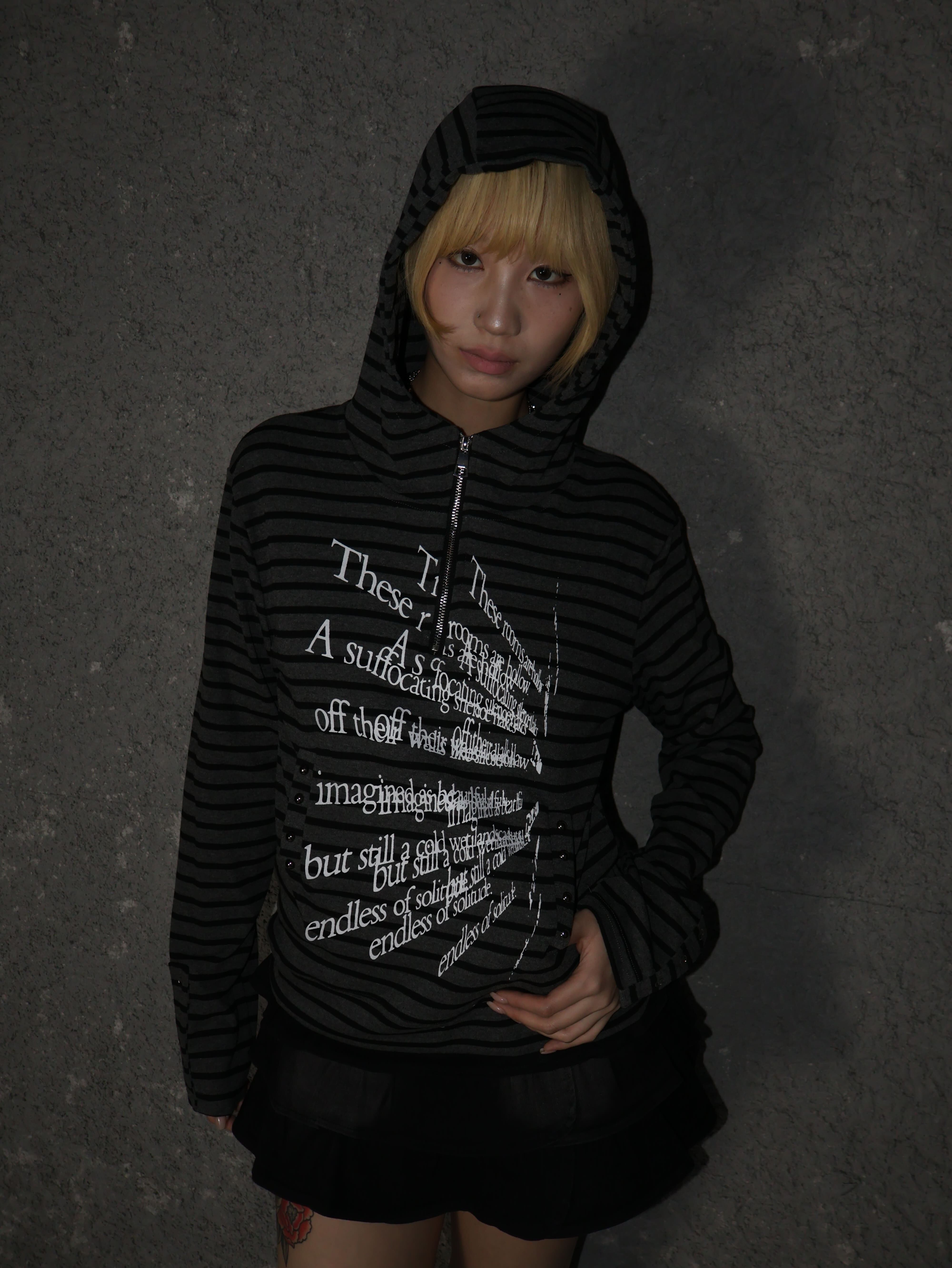グレーボーダーに歪んだロゴグラフィックを重ねた、Y2Kムード漂うフーディトップス。