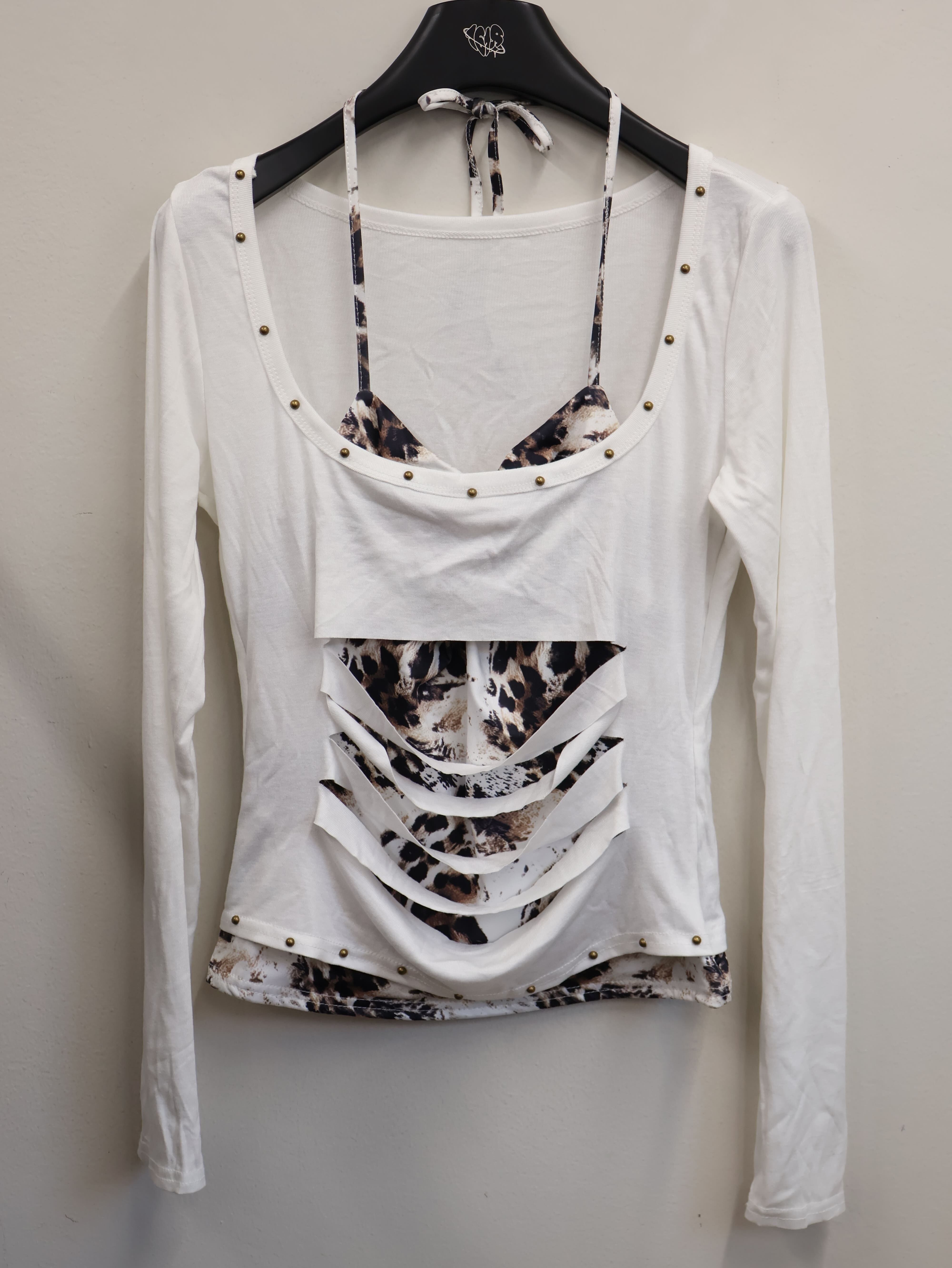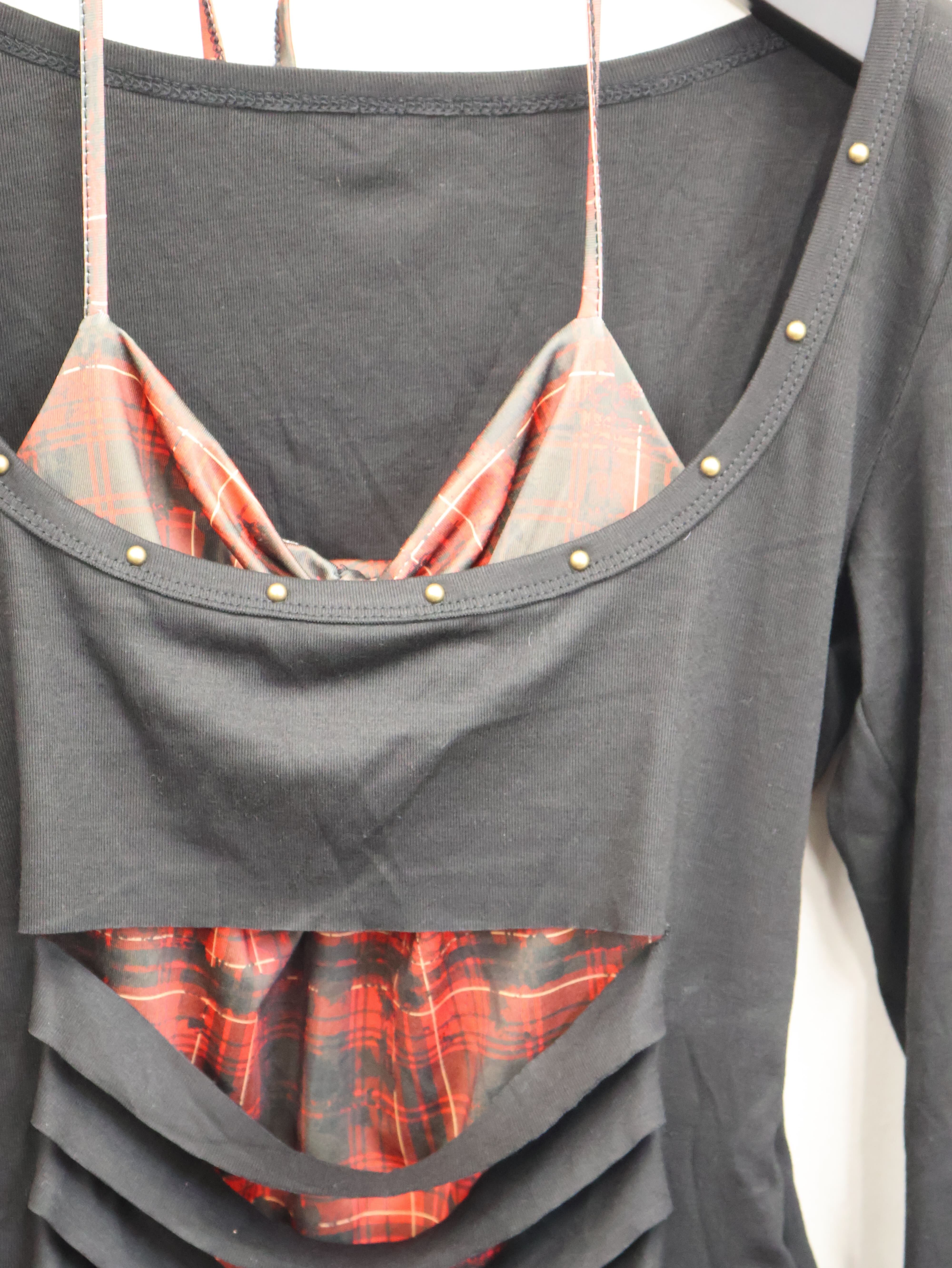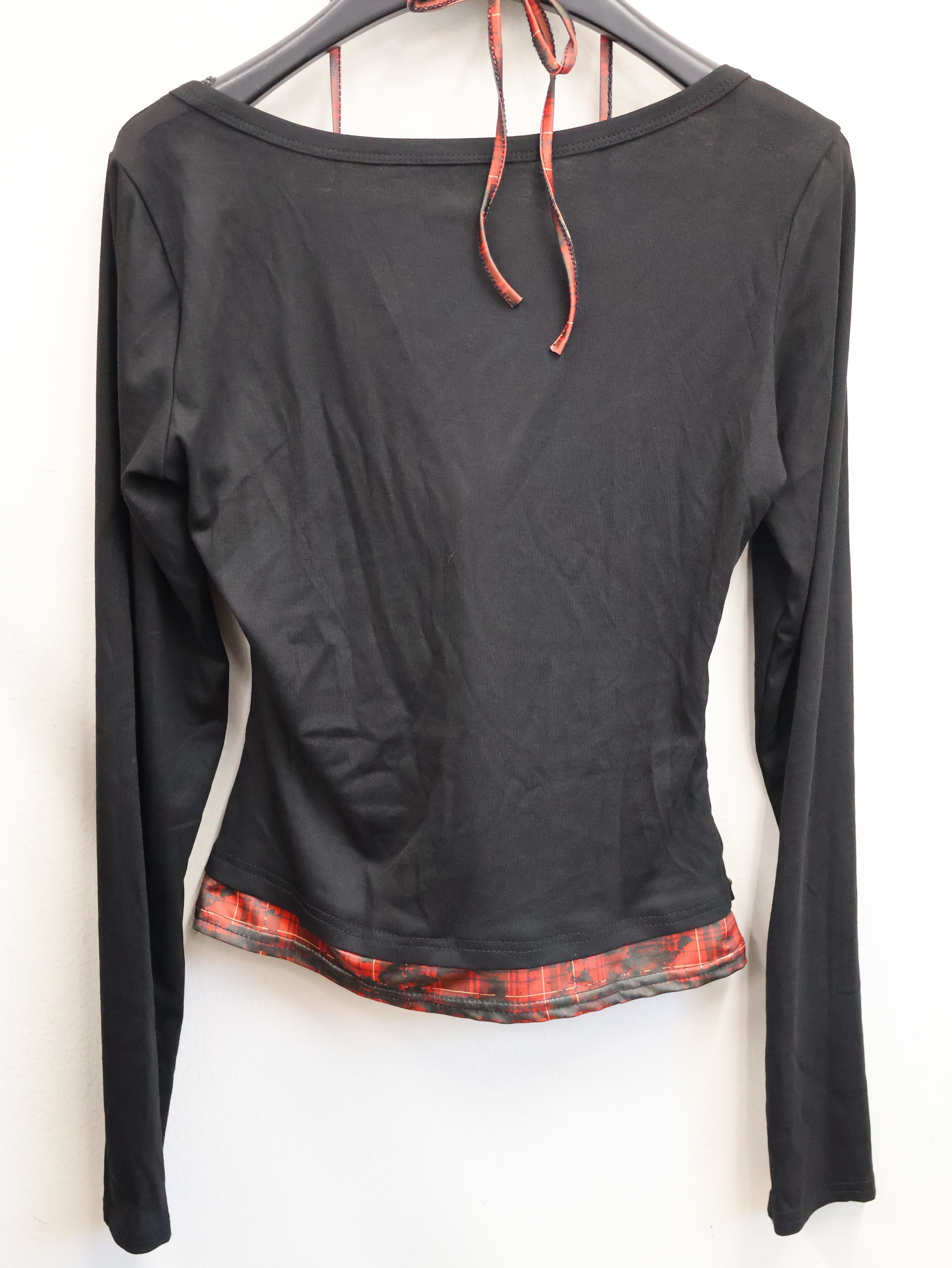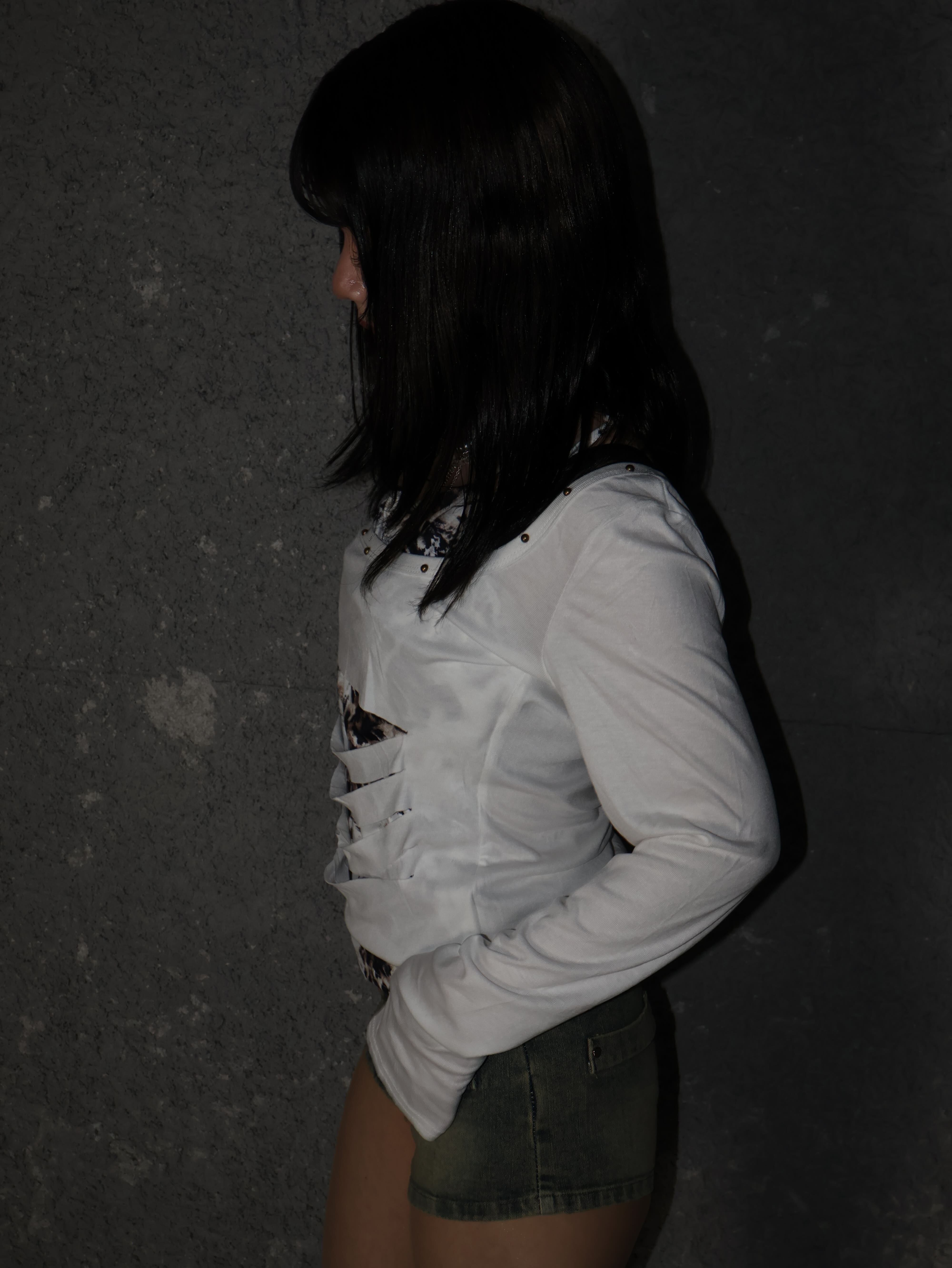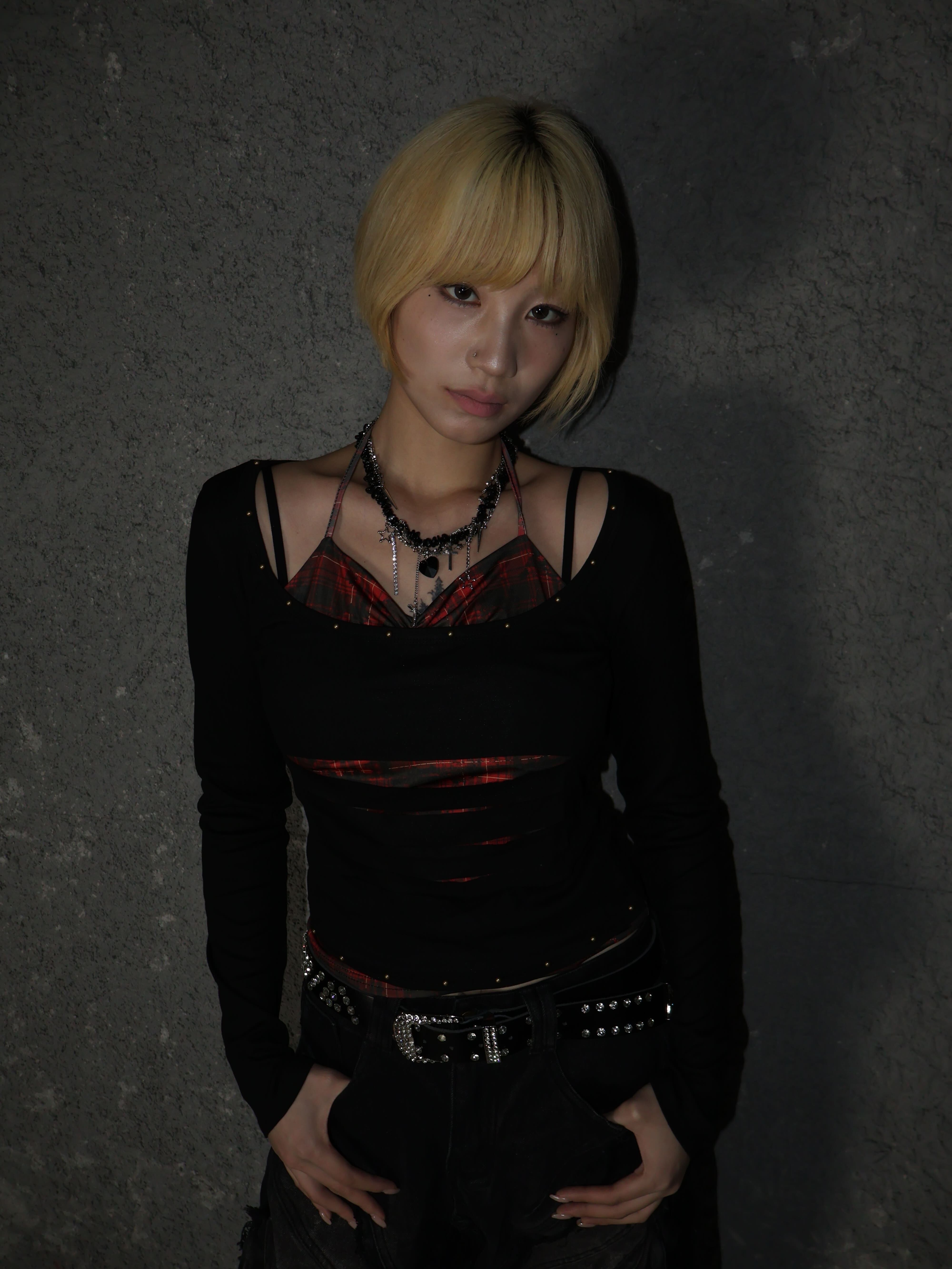 大胆なカットデザインとレイヤードスタイルが視線を惹きつけるY2Kトップス。