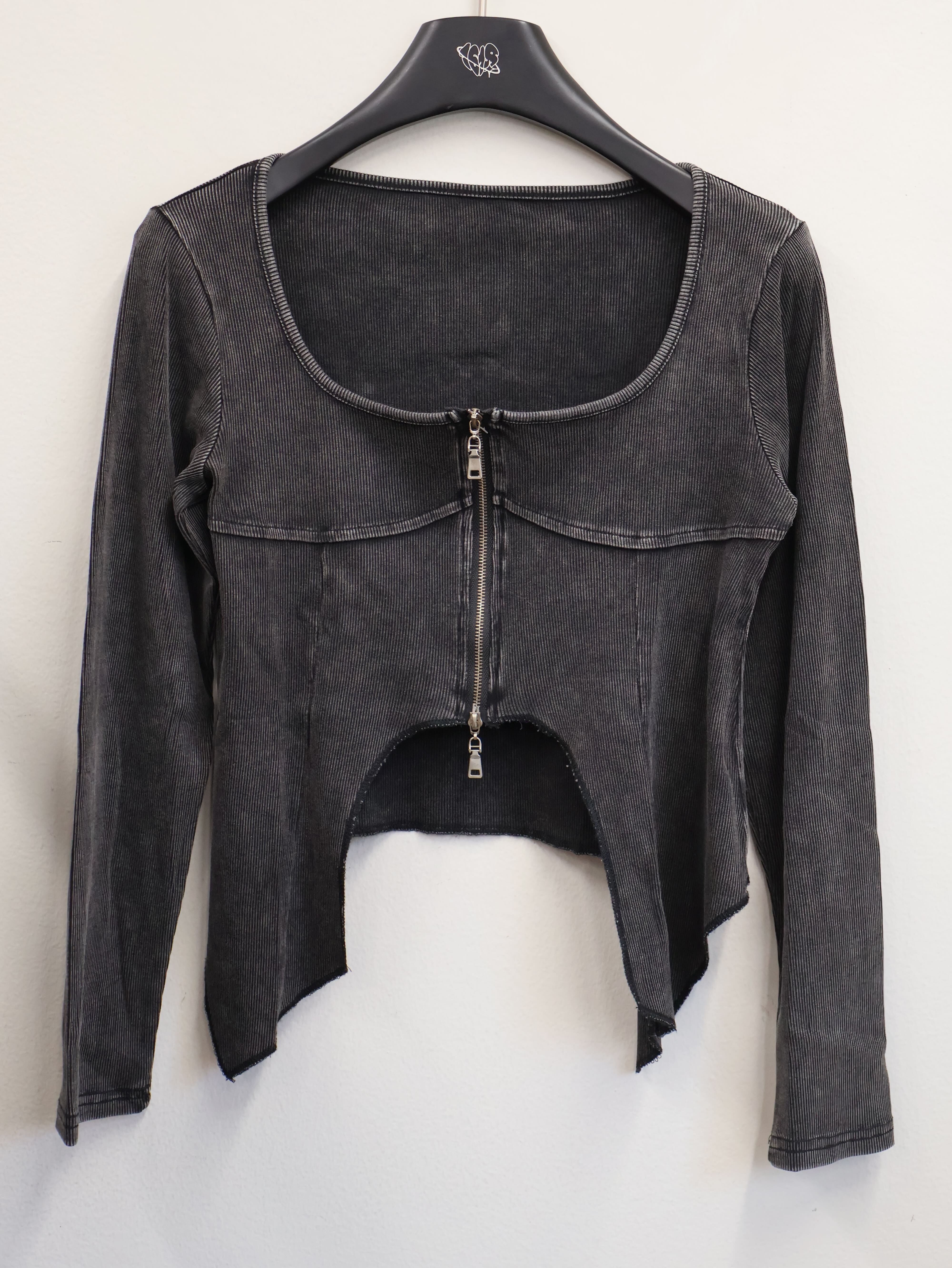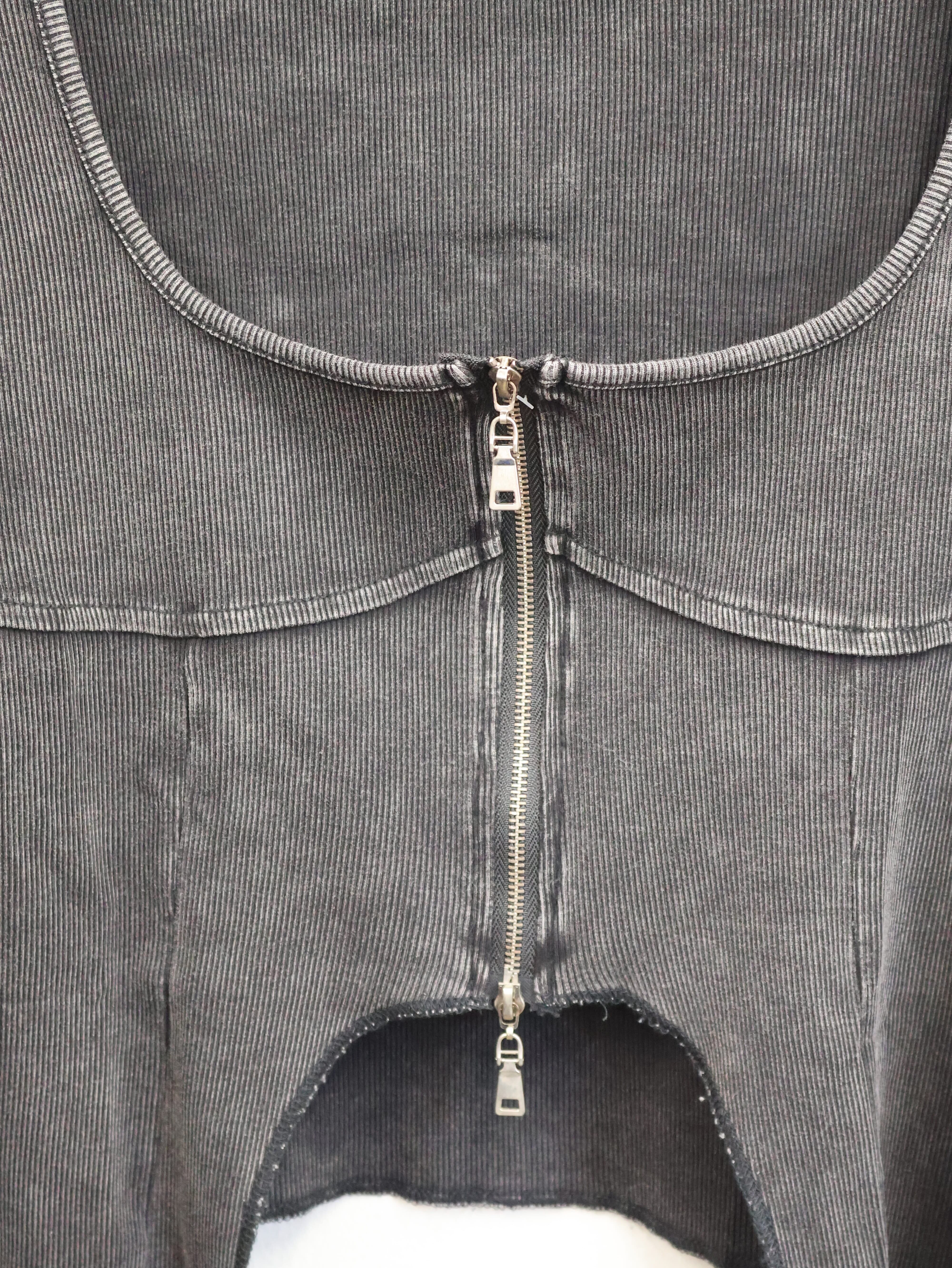 フロントジップと大胆なカットラインが視線を引き寄せる、グランジムード漂うY2Kトップス。