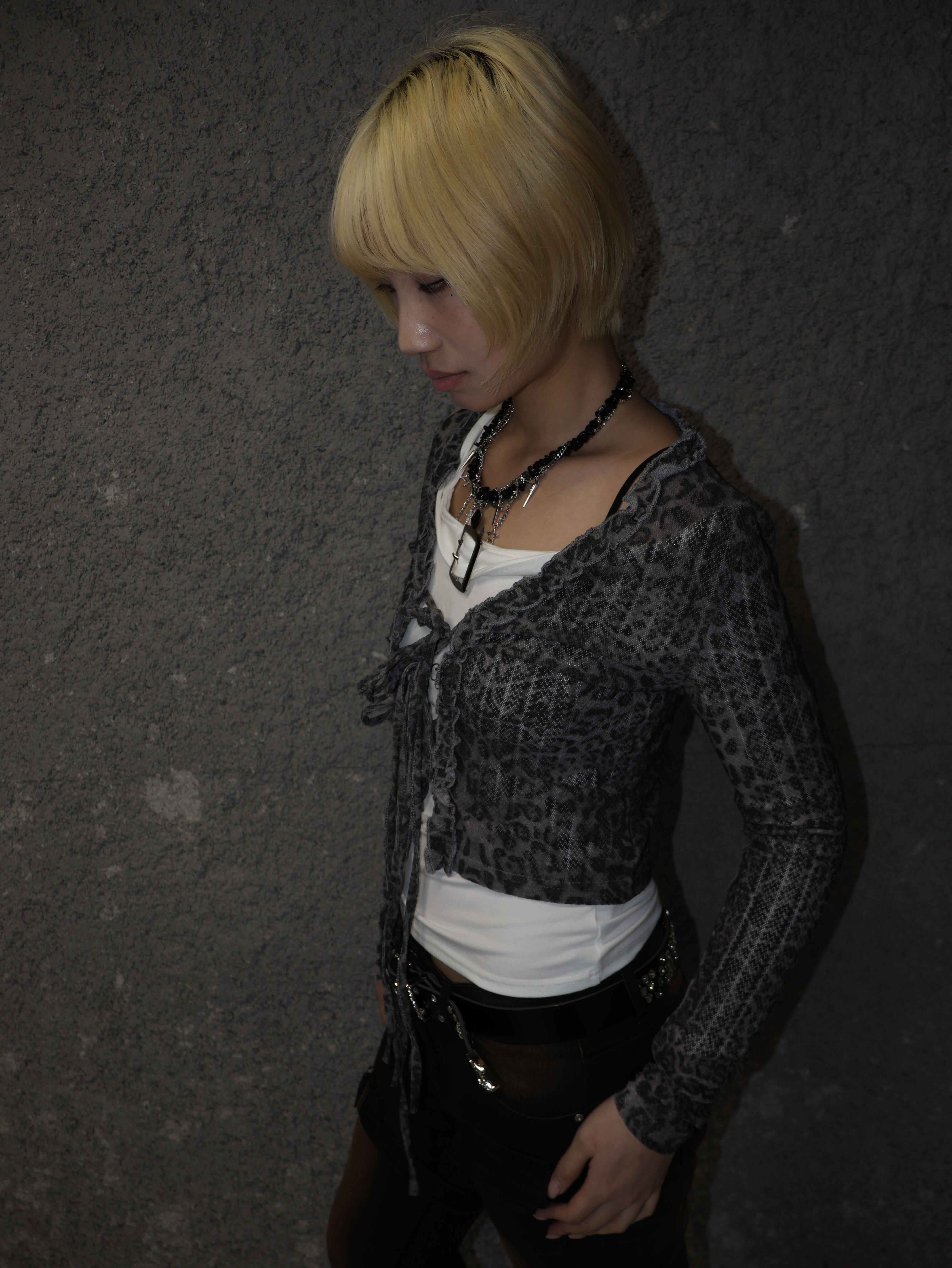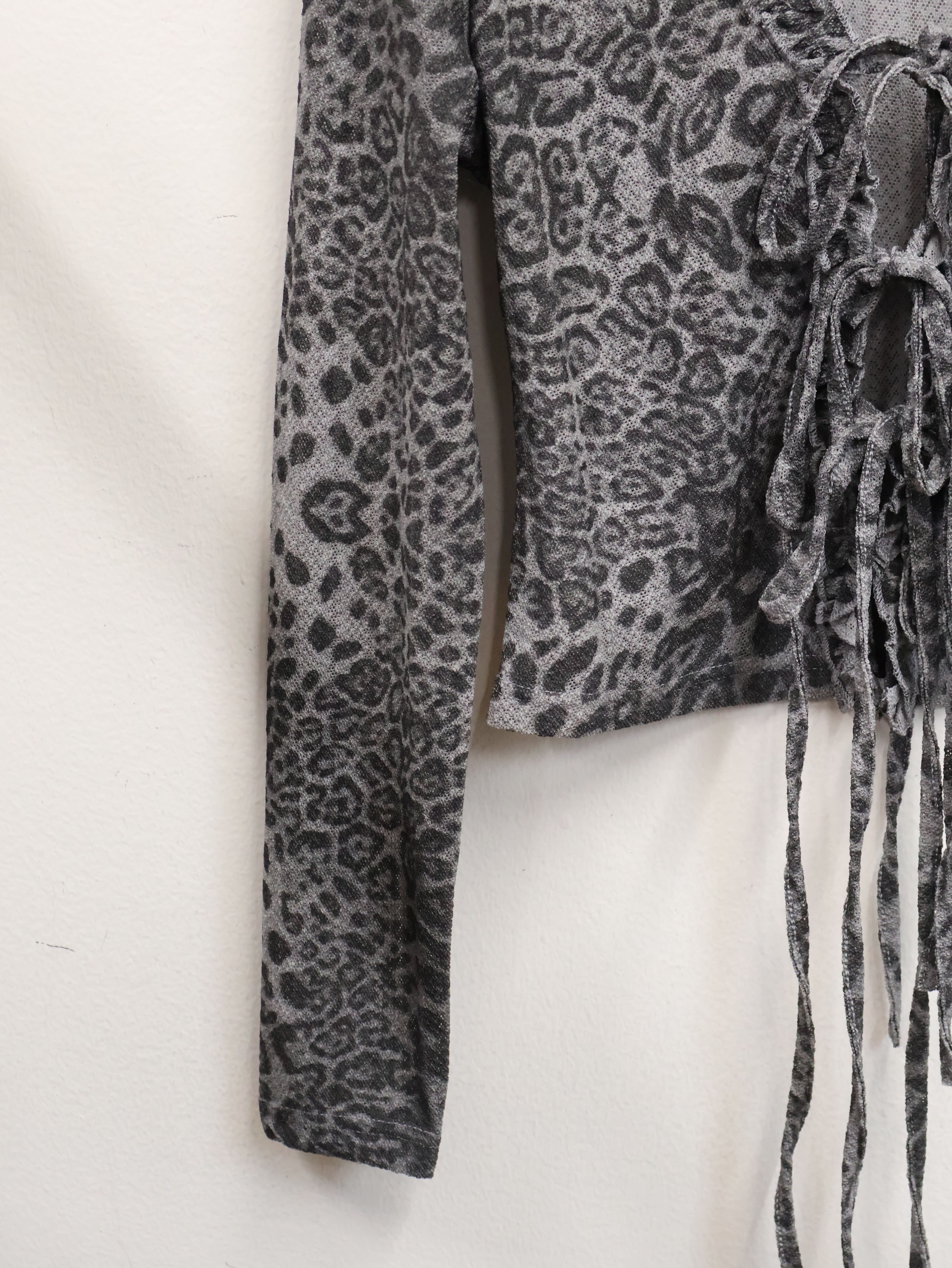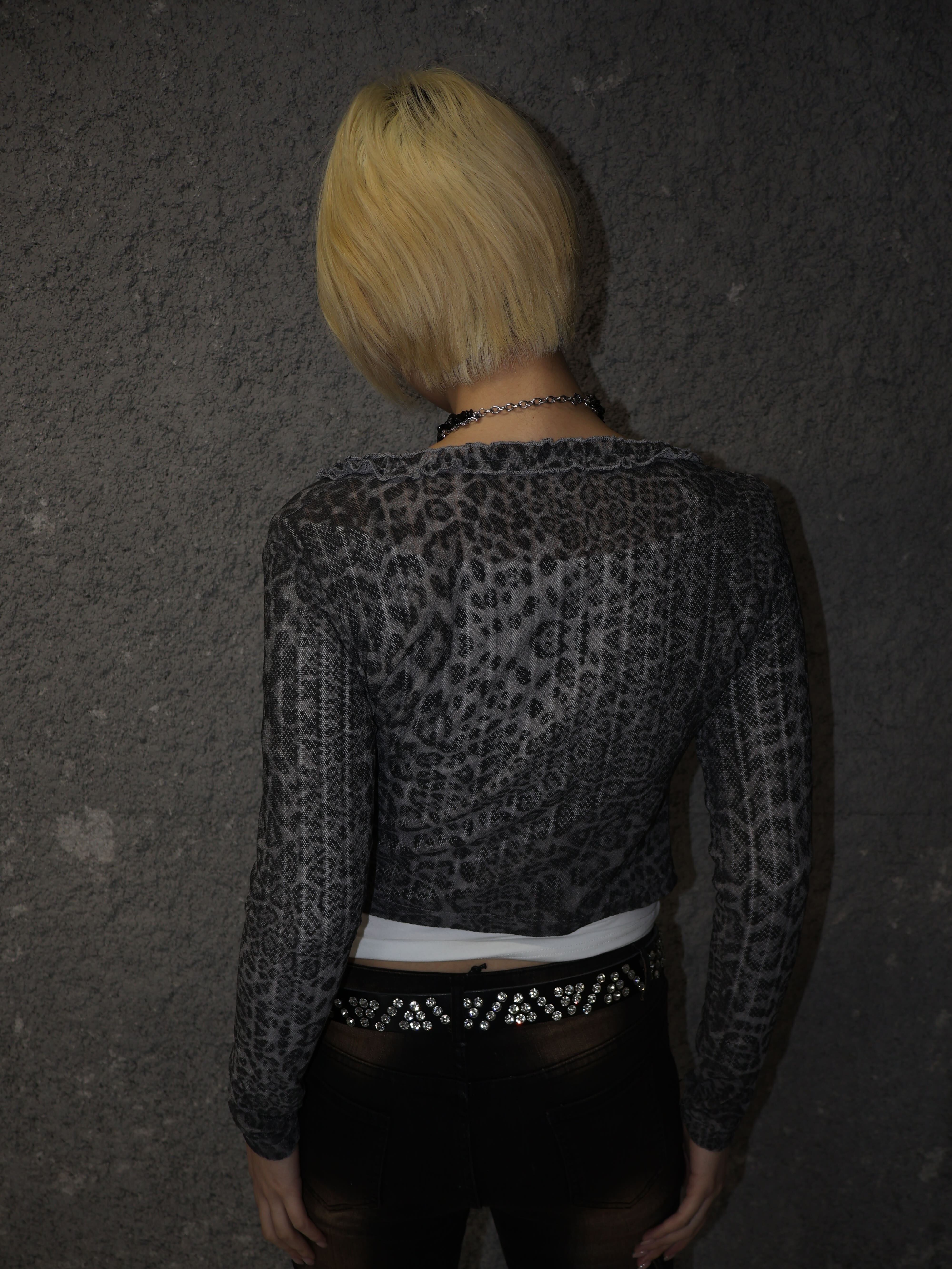 グレー系レオパード柄にフリルディテールを重ねた、海外ガール感のあるY2Kムード全開のロングスリーブトップス。