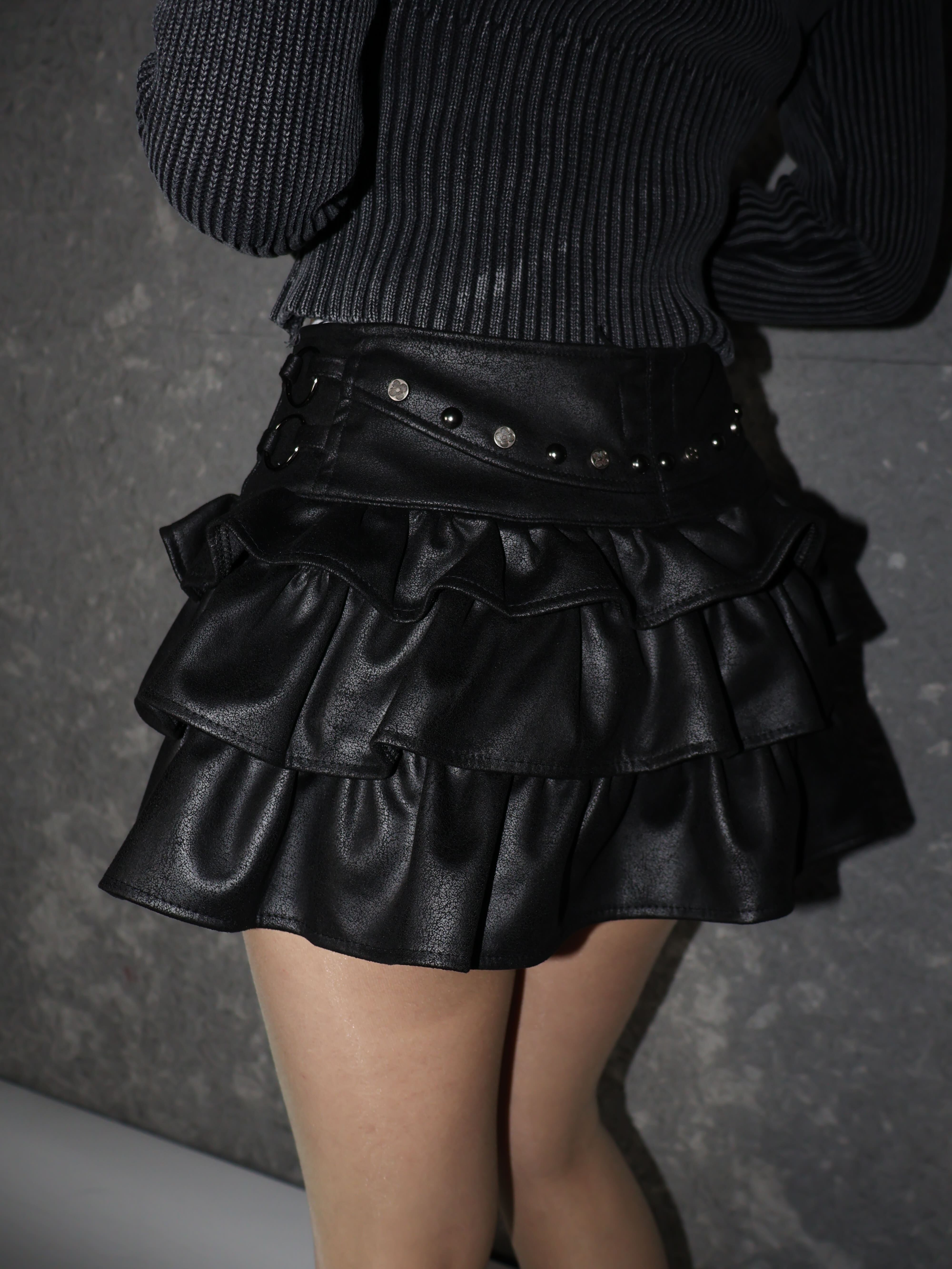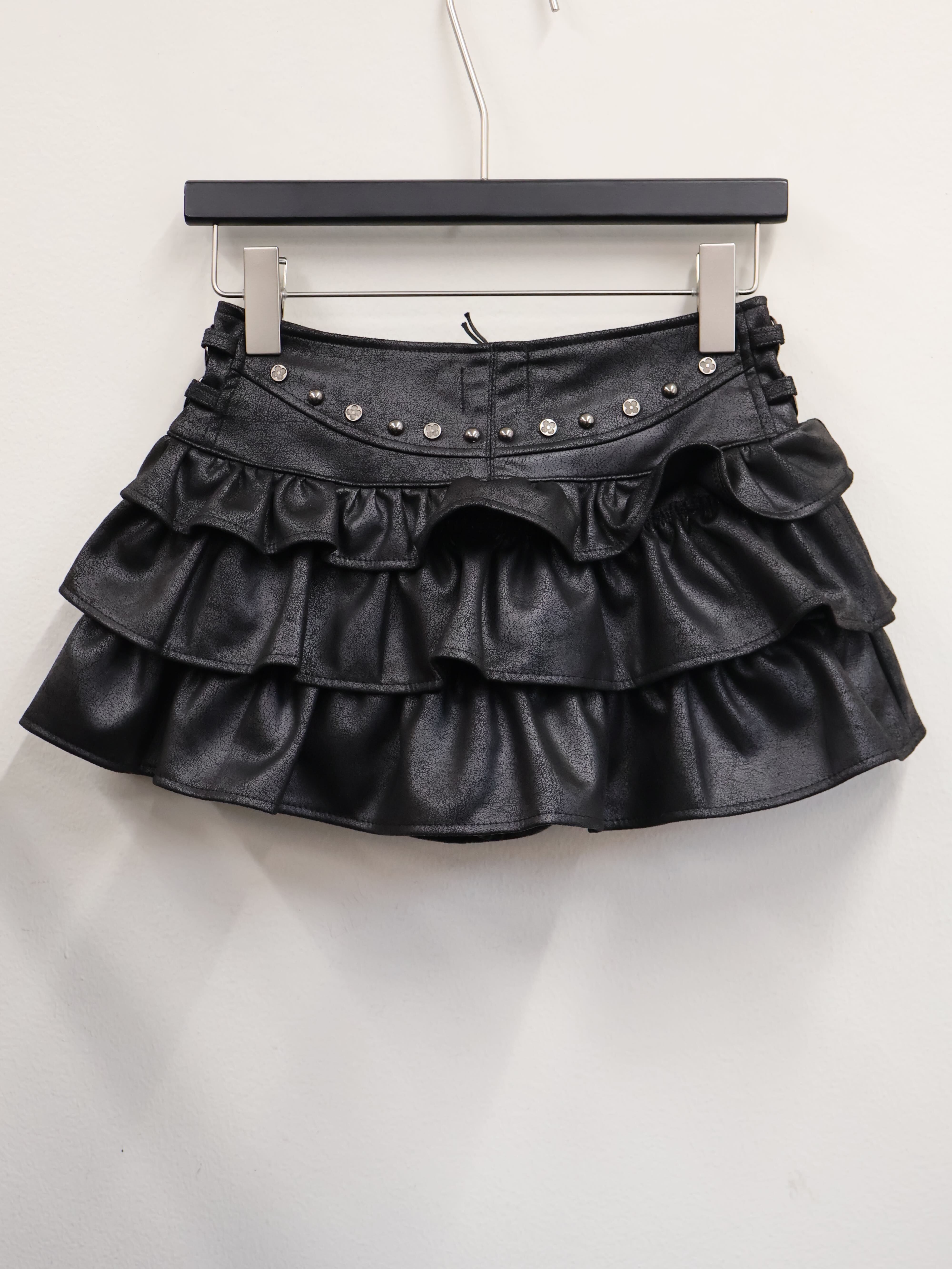 レザーライクな質感にスタッズディテールを組み合わせた、強めY2Kムードのティアードミニスカート。