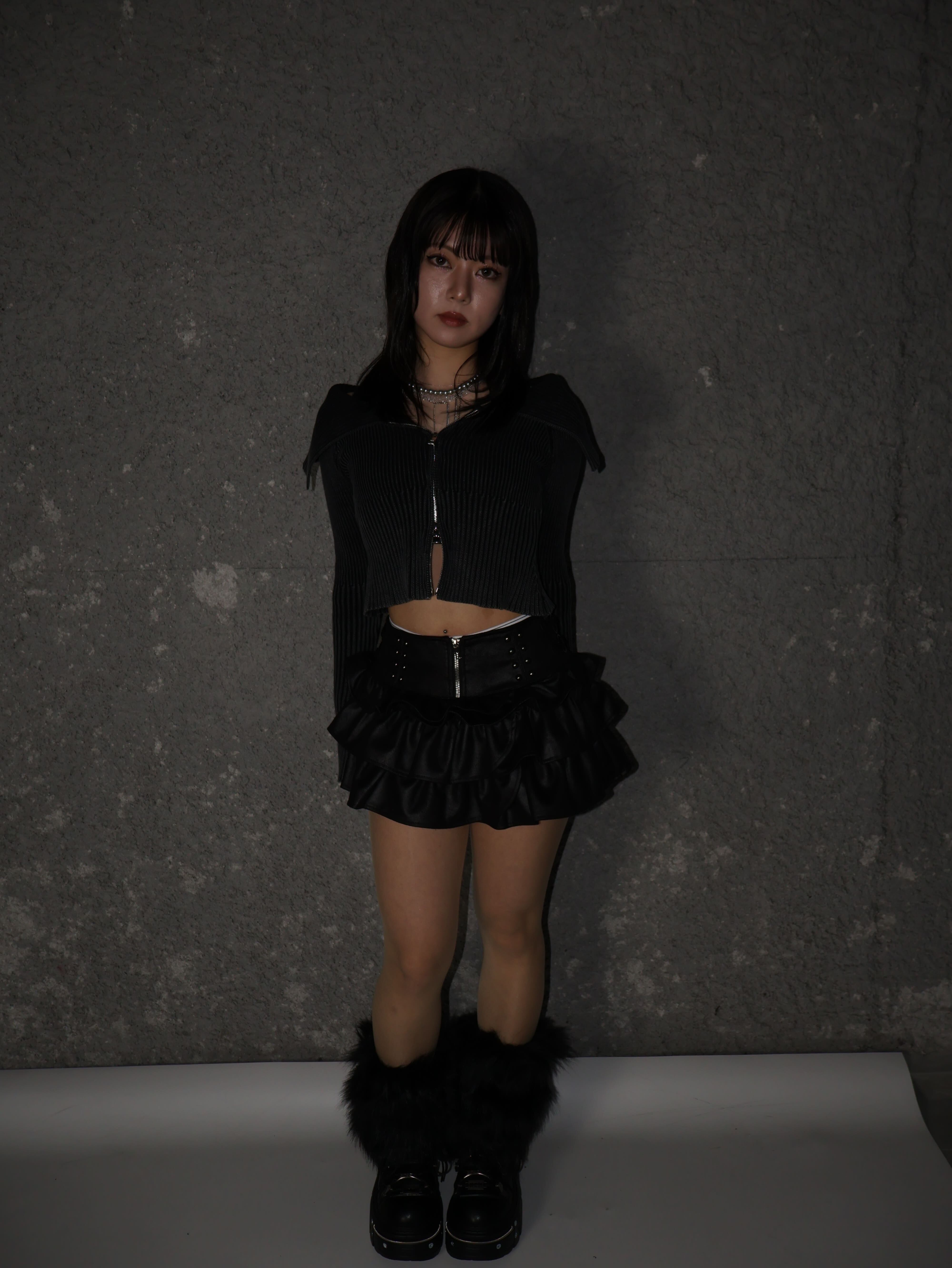 甘くなりがちなフリルスカートをエッジの効いたディテールで引き締め、ストリートとギャルのバランスを絶妙にミックスしています。