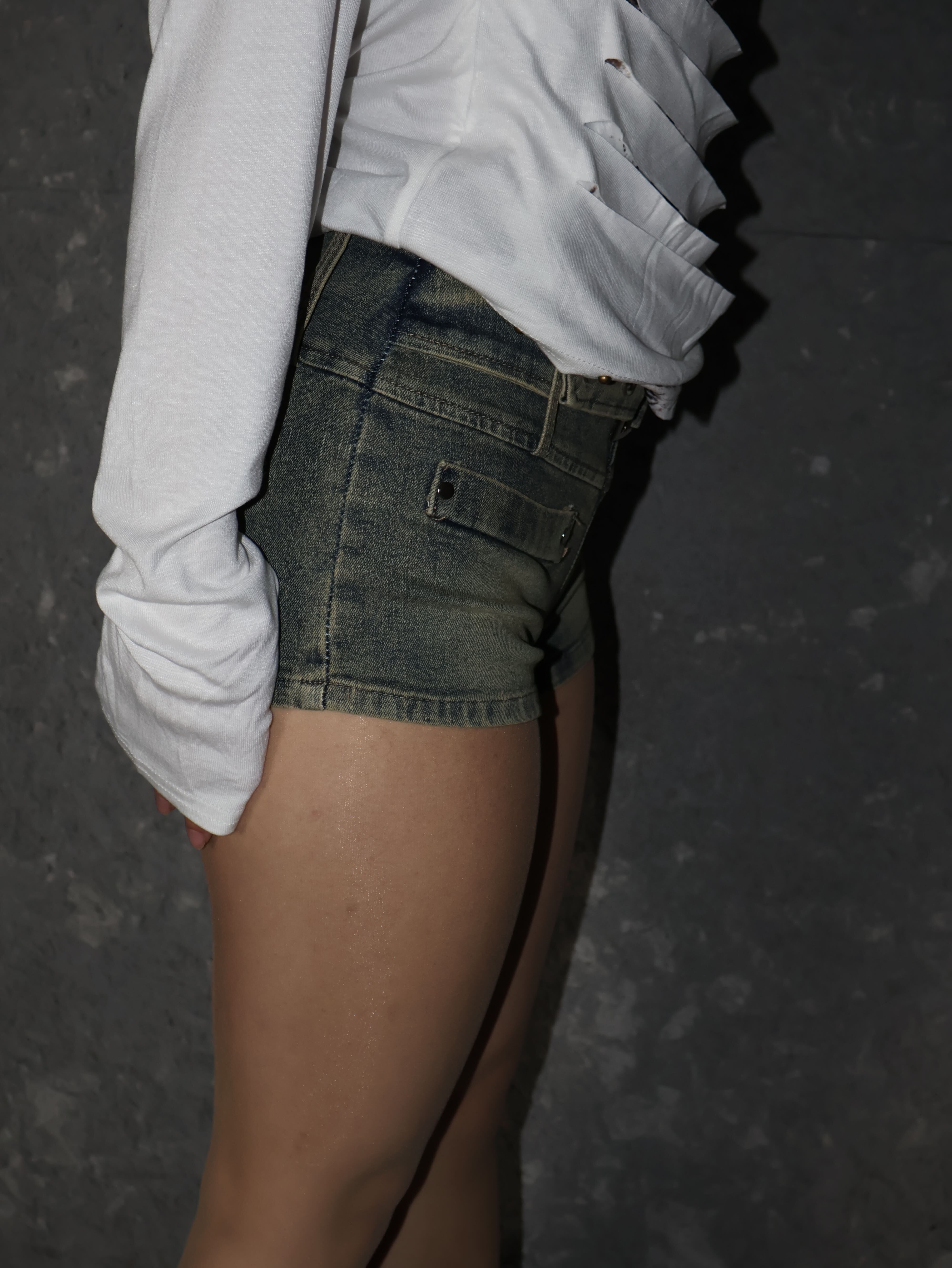 コンパクトなマイクロ丈で脚長シルエットが強調されるバランス。ローライズトップスやクロップド丈と合わせると海外ストリート感が強まります。
