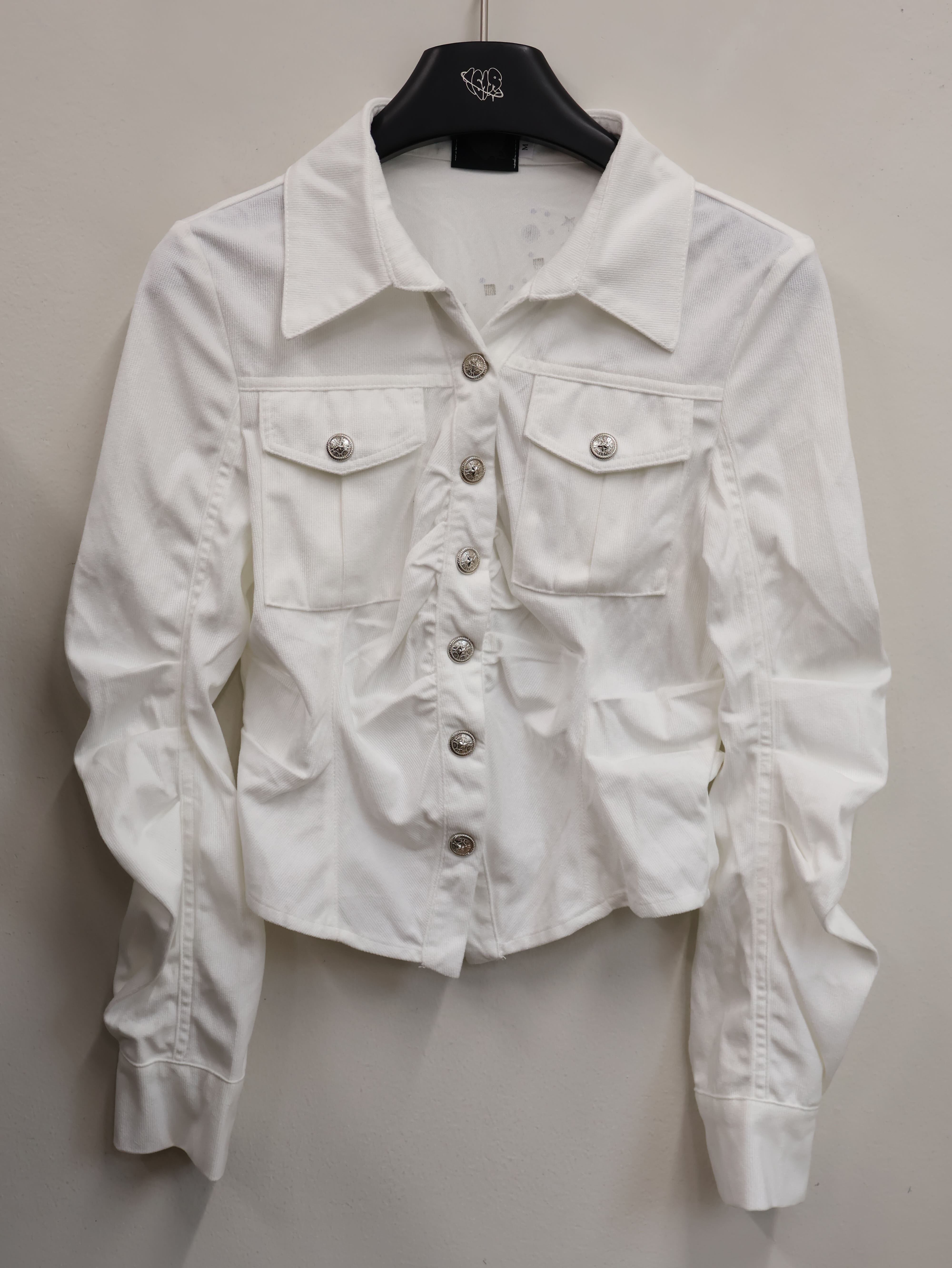 一見シンプルなホワイトシャツに、背面一面に打ち込まれたスタッズデザインで一気に主役級へ引き上げたクロップドシャツ。