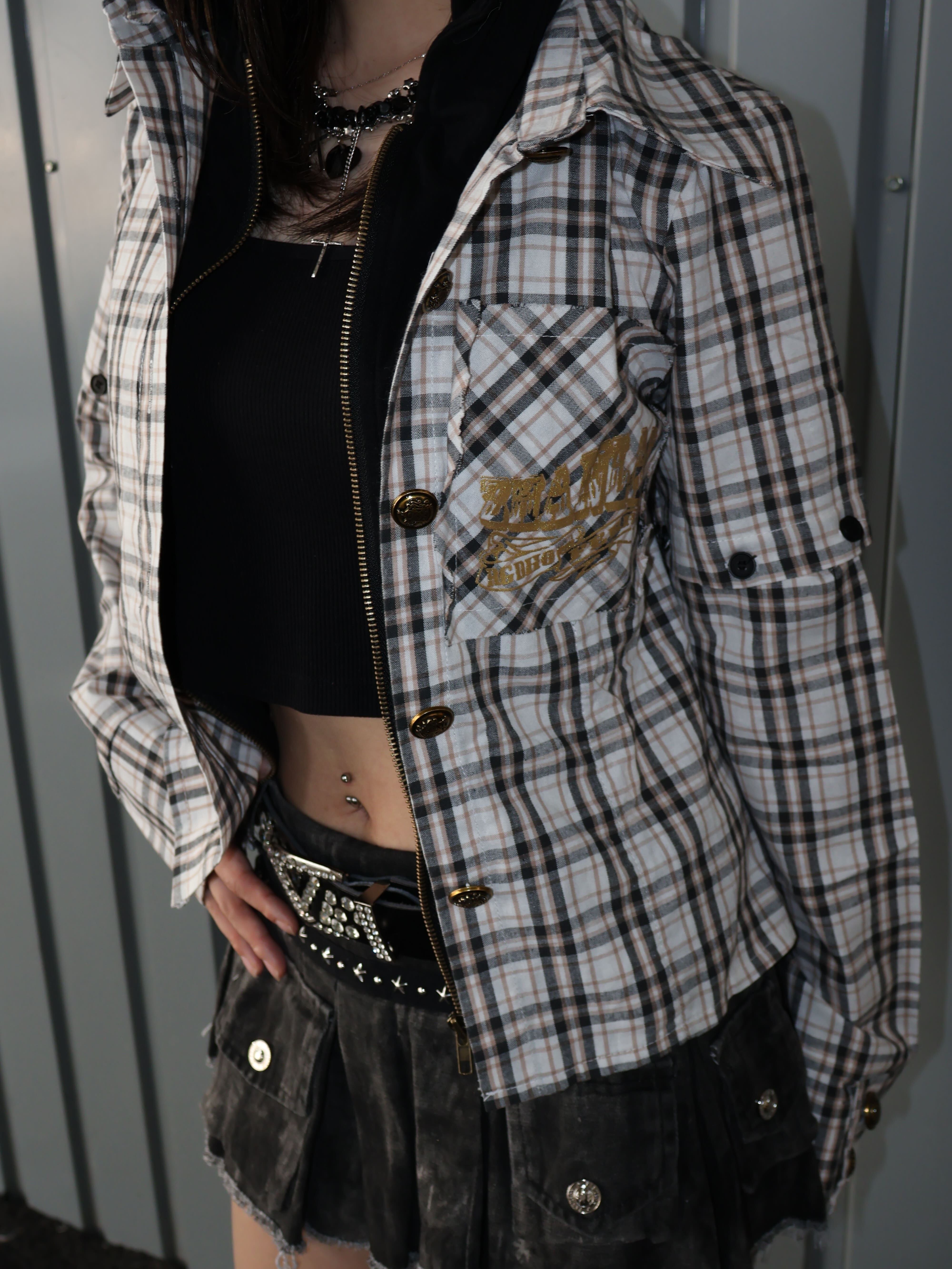 フロントはクラシックなチェックシャツの表情、背面は大胆にカットされたデザインからフーディが覗く、ギャップ強めの仕上がり。