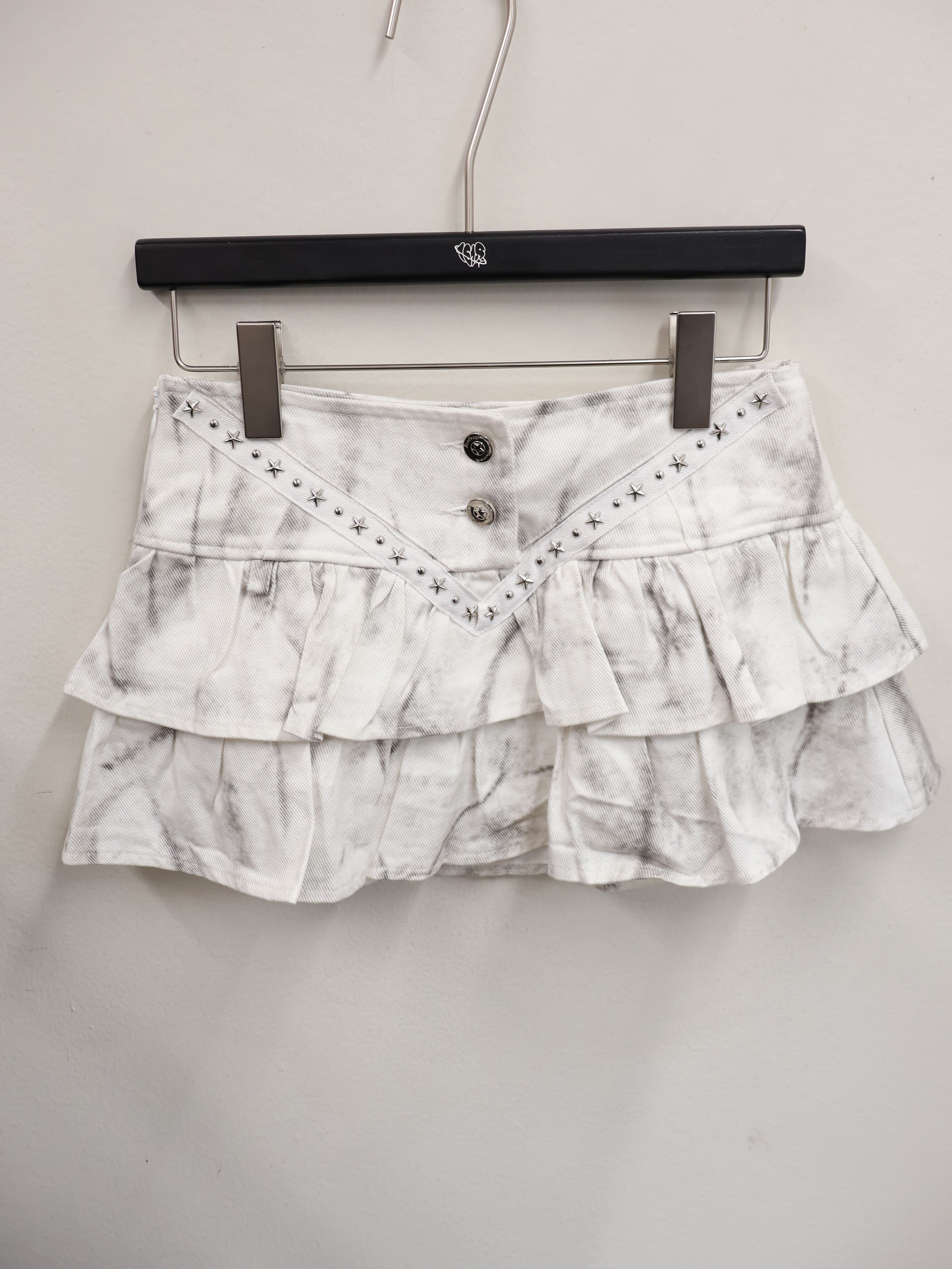 一見ガーリーなフリルミニに、エッジを効かせたスタッズディテールを仕込んだY2Kスカート。